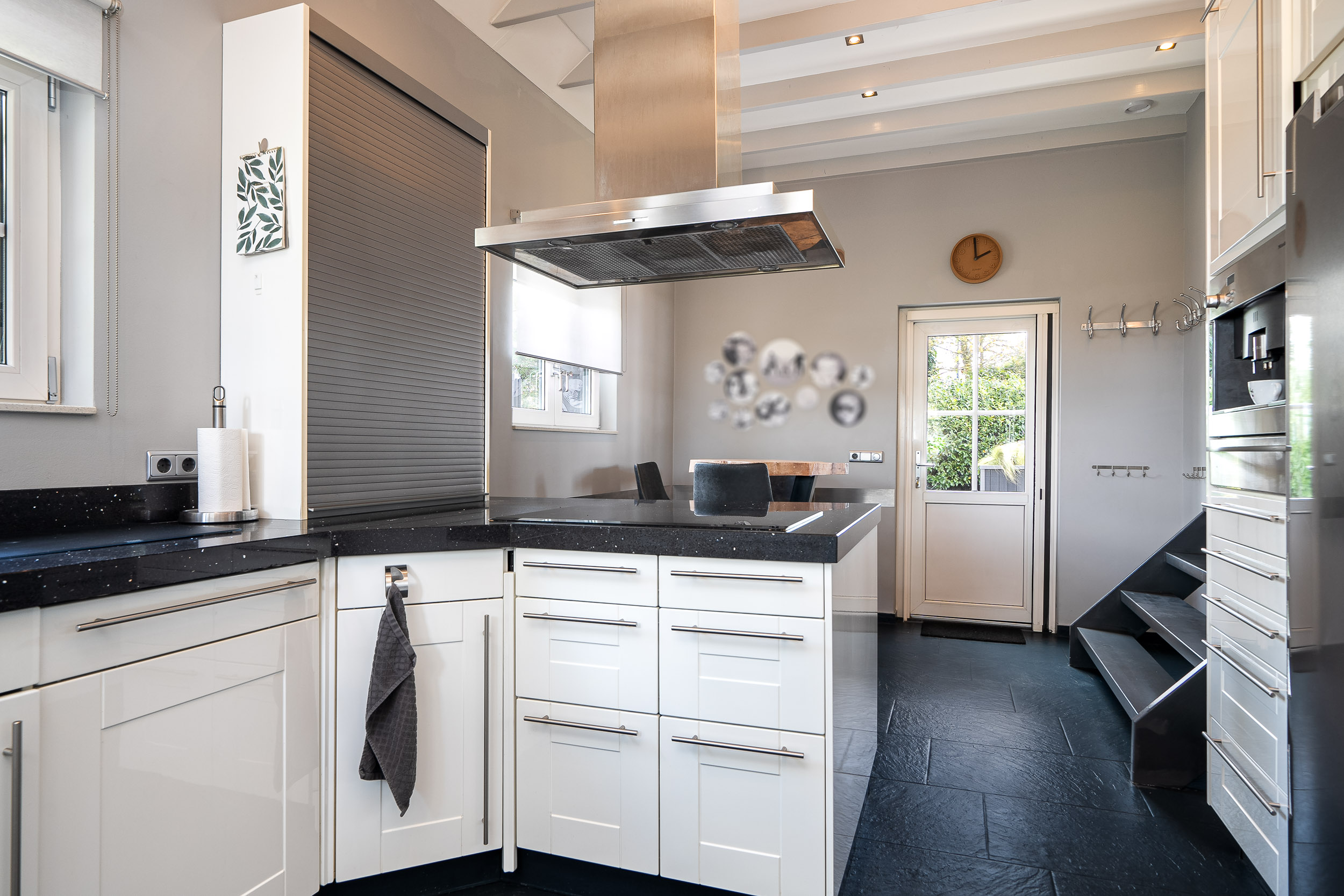The semi-open kitchen is equipped with built-in appliances and also has a door leading to the garden. It features underfloor heating and ample space for a dining area. Additionally, the cozy adjoining living space next to the kitchen provides an excellent spot for a large dining table.