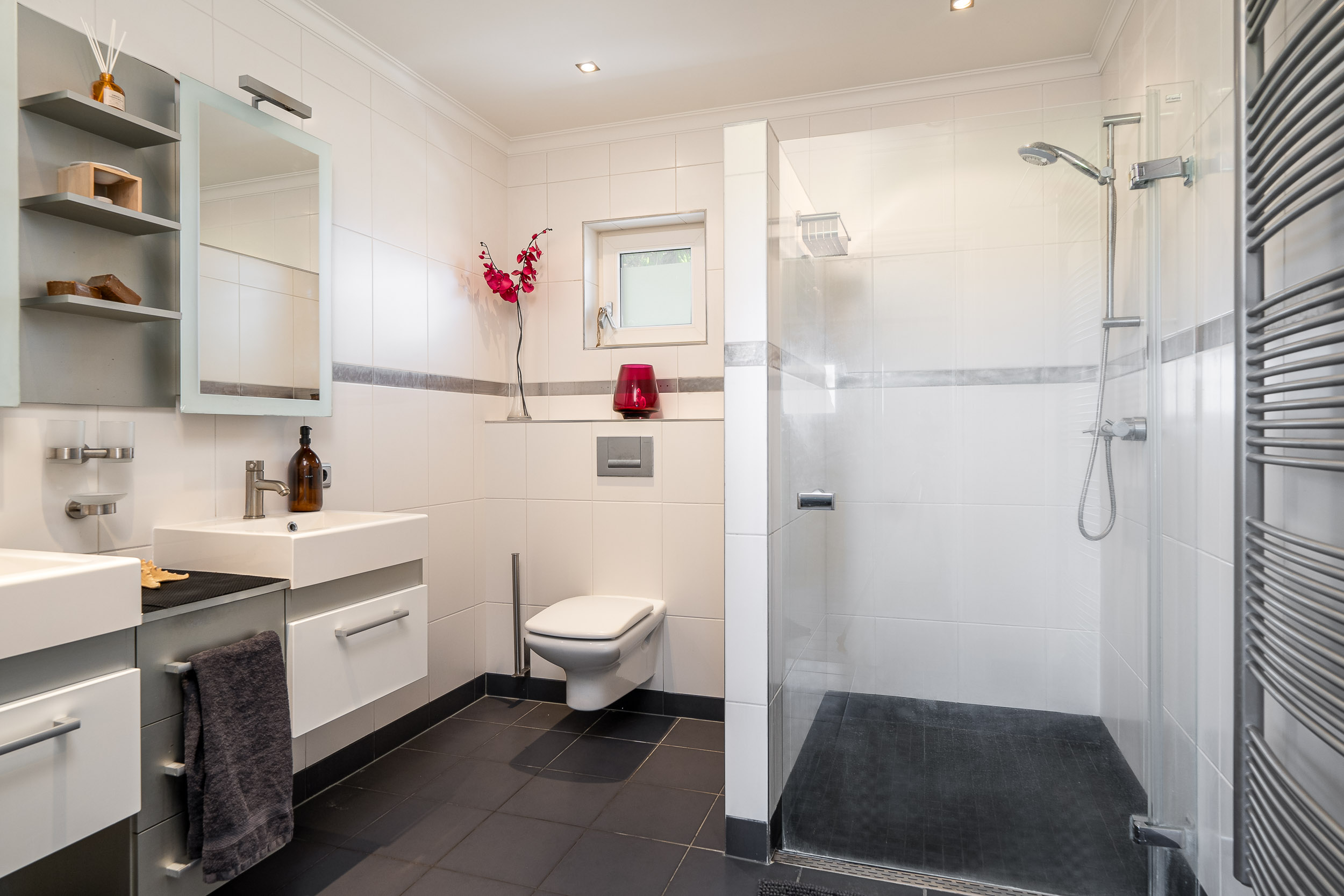 A door separates the landing from the bedrooms and bathroom. There are three generously sized bedrooms on this floor and a second spacious bathroom with underfloor heating, a double sink vanity, a walk-in shower, and a toilet. There is ample built-in storage in all rooms and along the sloped ceilings of the landing. Heating is provided through a warm air system.
