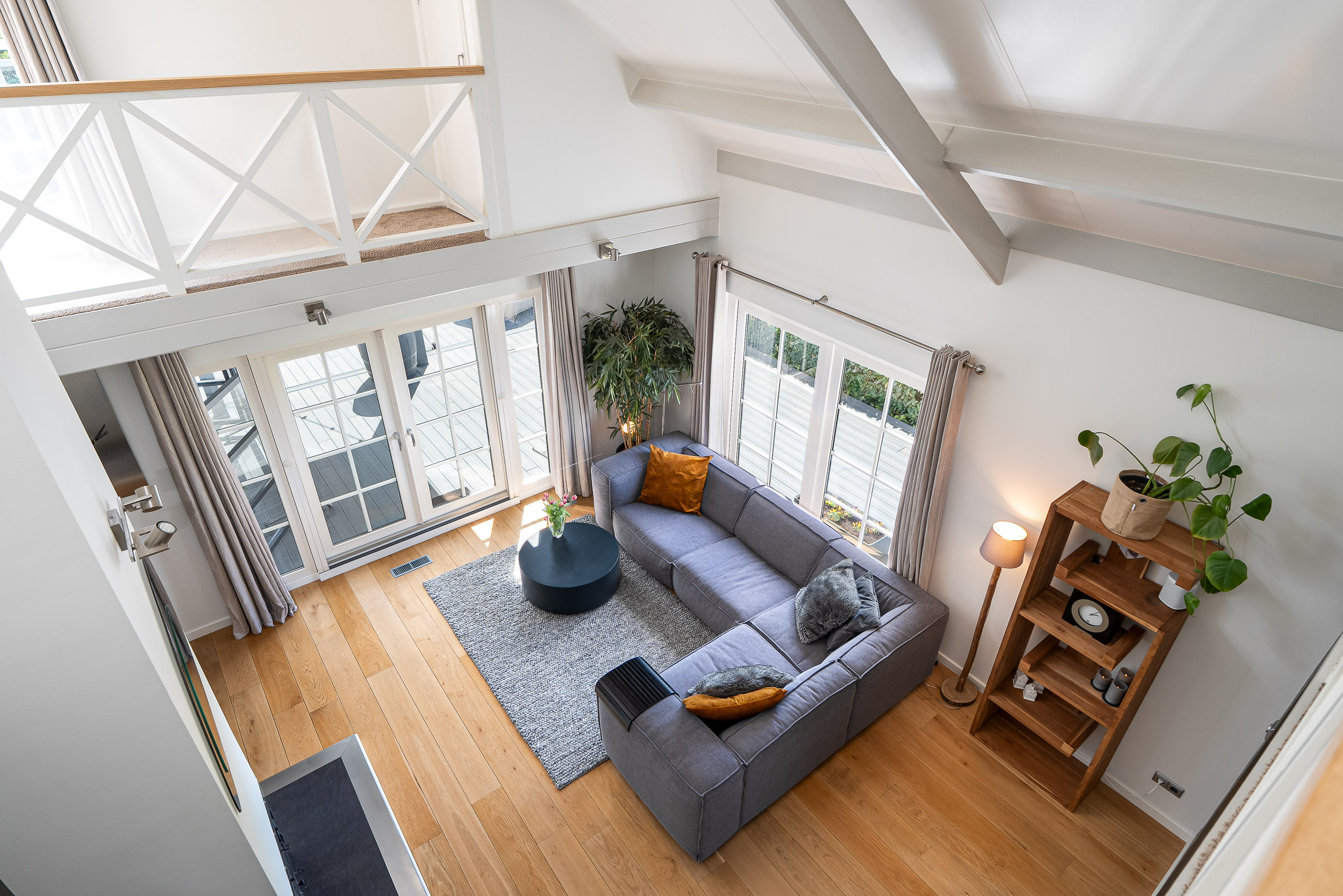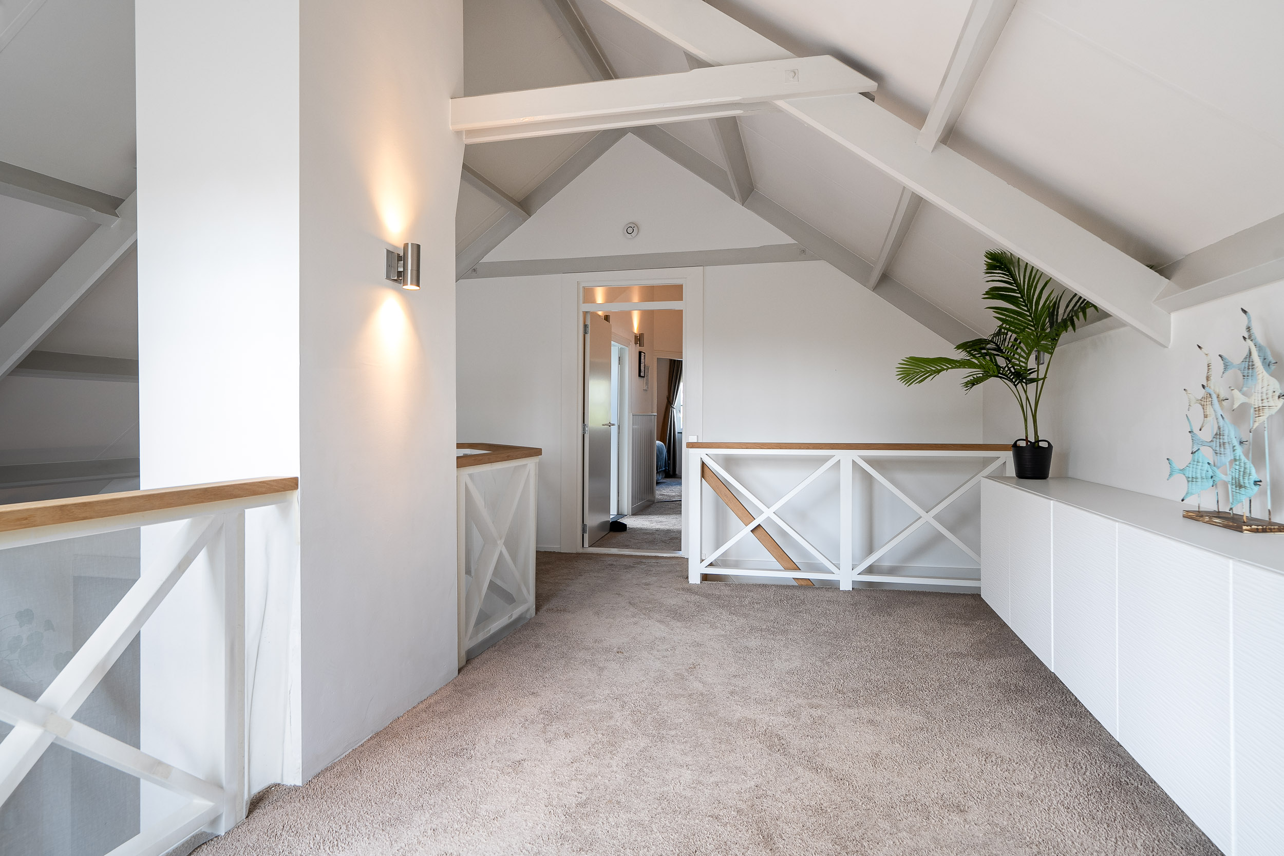 The mezzanine landing overlooks the living room and has double doors leading to a spacious south-facing sun terrace. This is a perfect place to experience the most beautiful sunrises and sunsets. The privacy here is complete due to the natural screening of the garden. The mezzanine area offers ample space for a cozy play area, workspace, or home library.