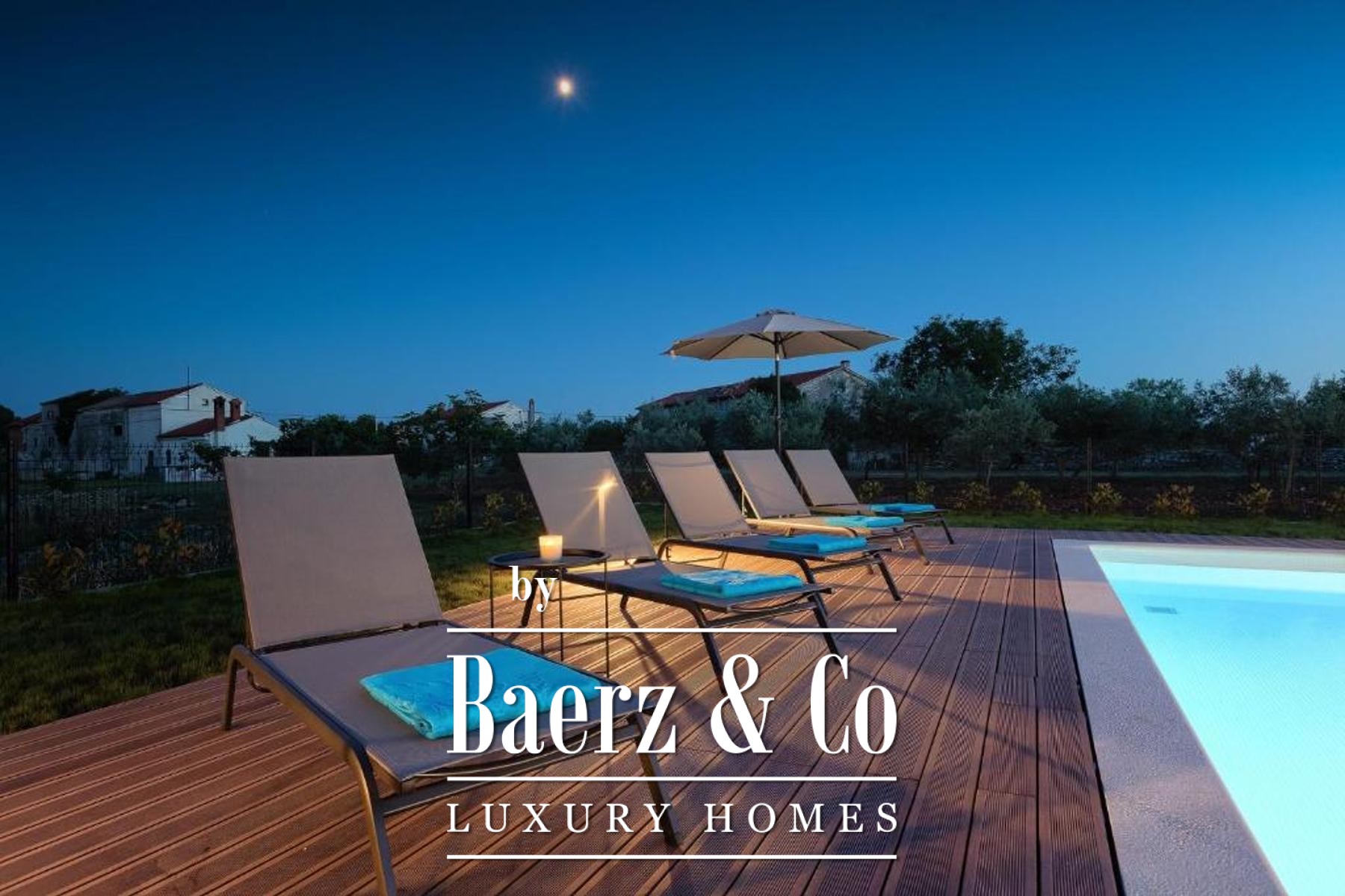 Outdoors, a fully fenced garden invites relaxation, its centrepiece a 50 m² heated pool finished in ceramic tiling and bordered by a tranquil sunbathing area. Modern heating and cooling systems throughout the villa underscore year-round comfort, whether for permanent residence, holiday retreat, or as a luxury villa for sale in Svetvinčenat. The environment, both natural and architectural, reflects an investment in privacy, quality, and the unhurried elegance of Istrian life.