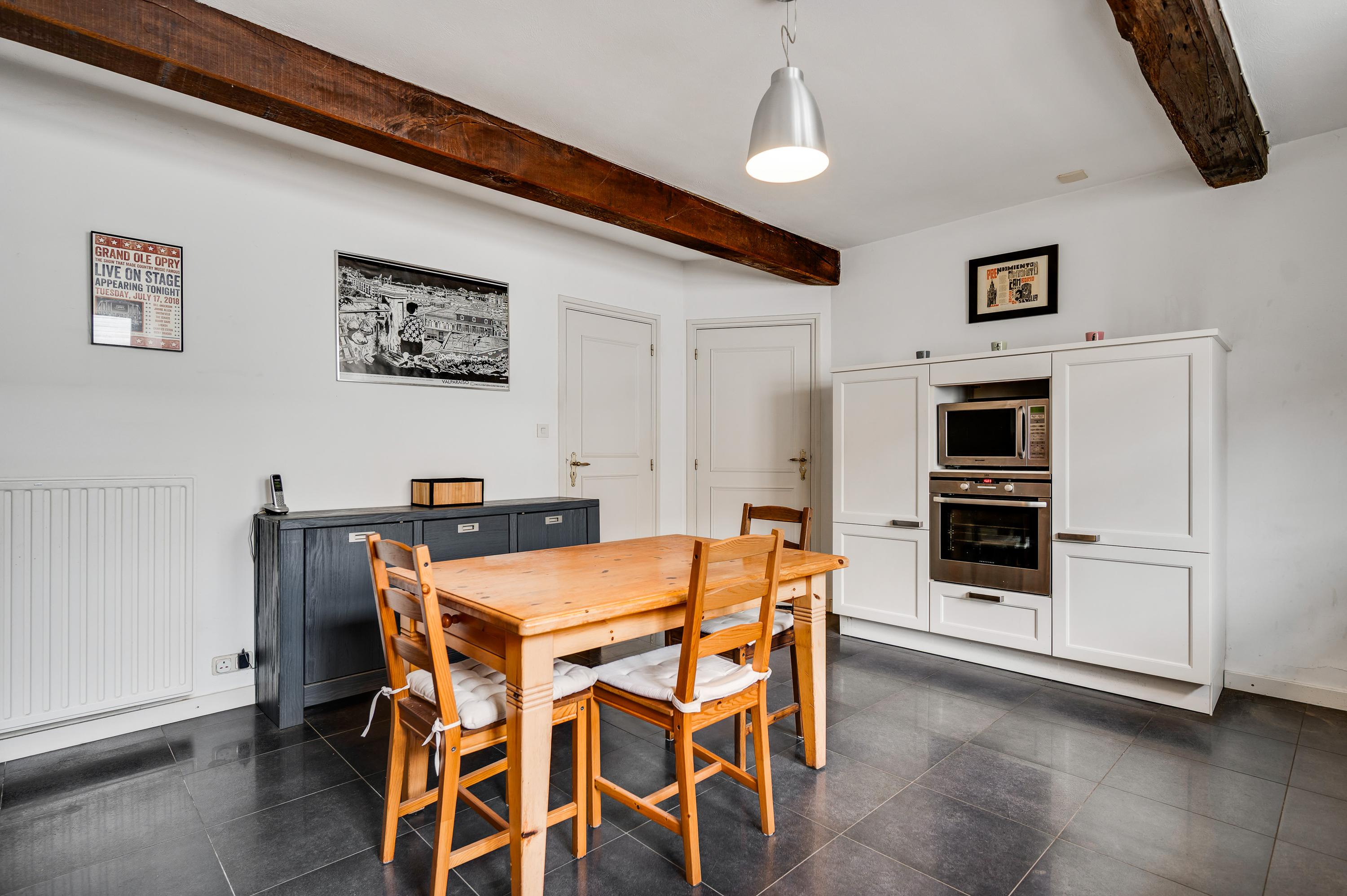 The spacious hall with a fireplace and meter cupboard provides access to the toilet, a bedroom with a separate bathroom, and the kitchen. The stairs to the first floor are also accessible from the hall. The hall also served as the B&B's former living room. This space can be used for various purposes.