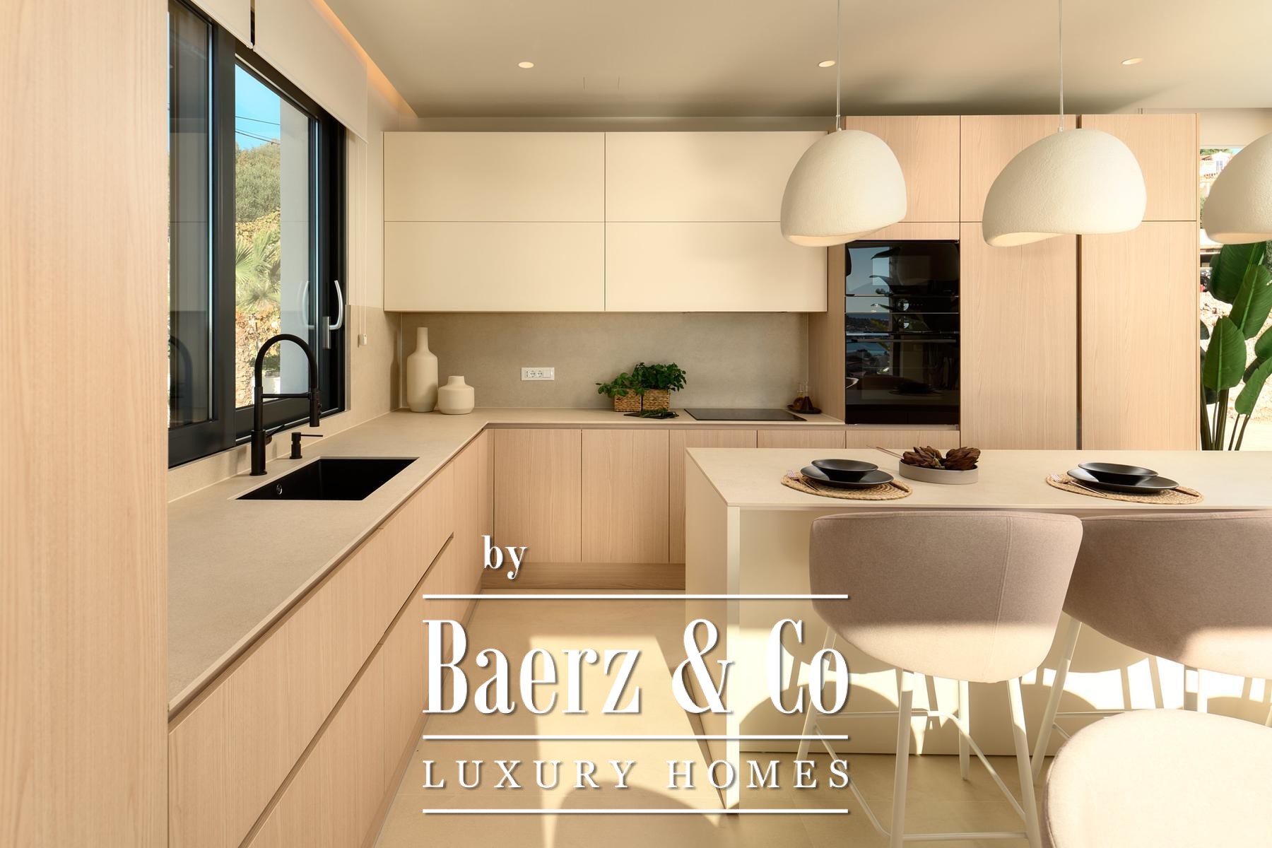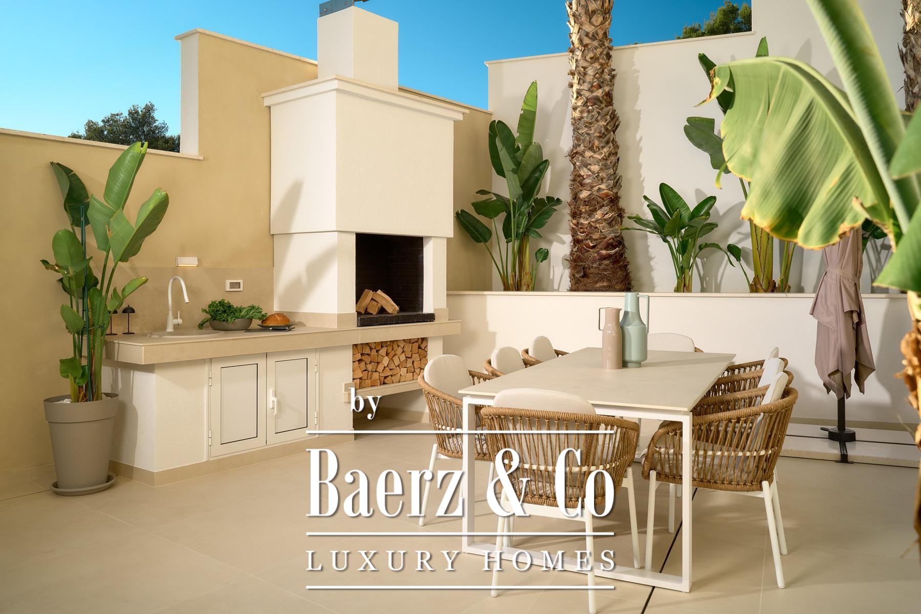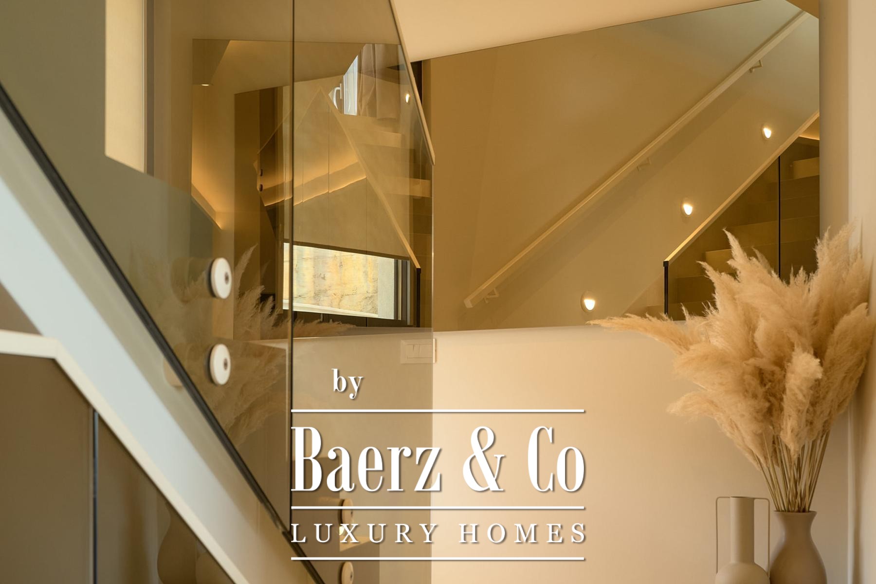 Three bedrooms with en suite bathrooms on the ground floor enjoy direct access to an 18.8 m² loggia. A private garage of 31 m², features electric vehicle charging. The first floor introduces a voluminous 52 m² living area, complemented by a fourth bedroom, additional bath, and expanses of terrace, each vantage point oriented toward the shimmering horizon.