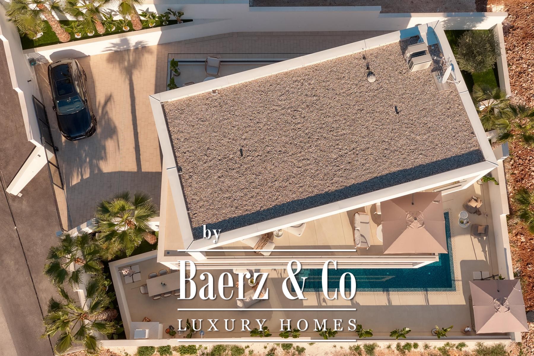 Construction standards are uncompromising, with ceiling air conditioning, underfloor heating powered by heat pumps, air recovery, thermal insulation, aluminum joinery, glass terrace railings, solar panel installations, automatic garden irrigation, and video surveillance providing technical excellence. Two uncovered parking spaces and Mediterranean-inspired landscaping further enhance the setting.