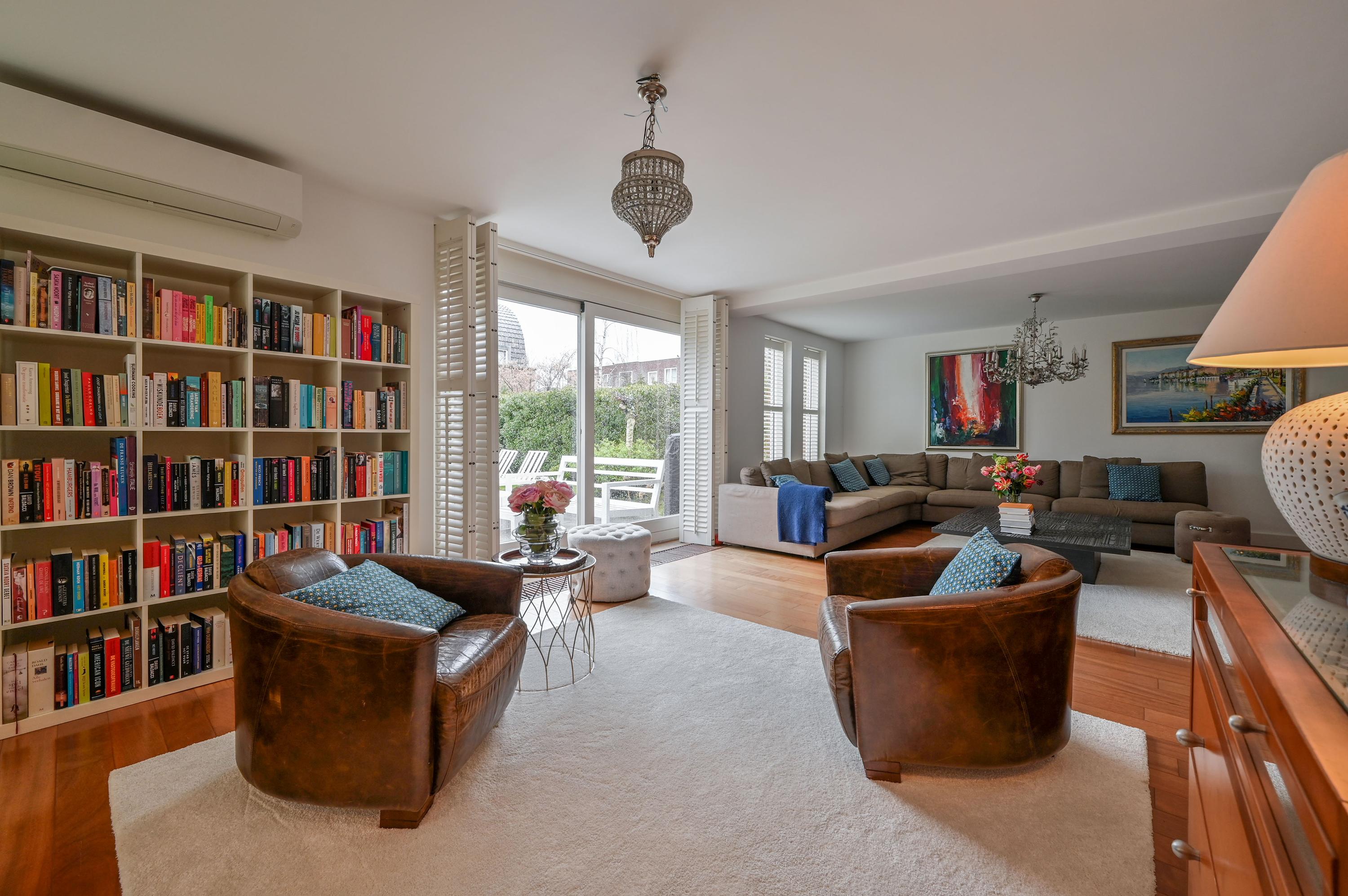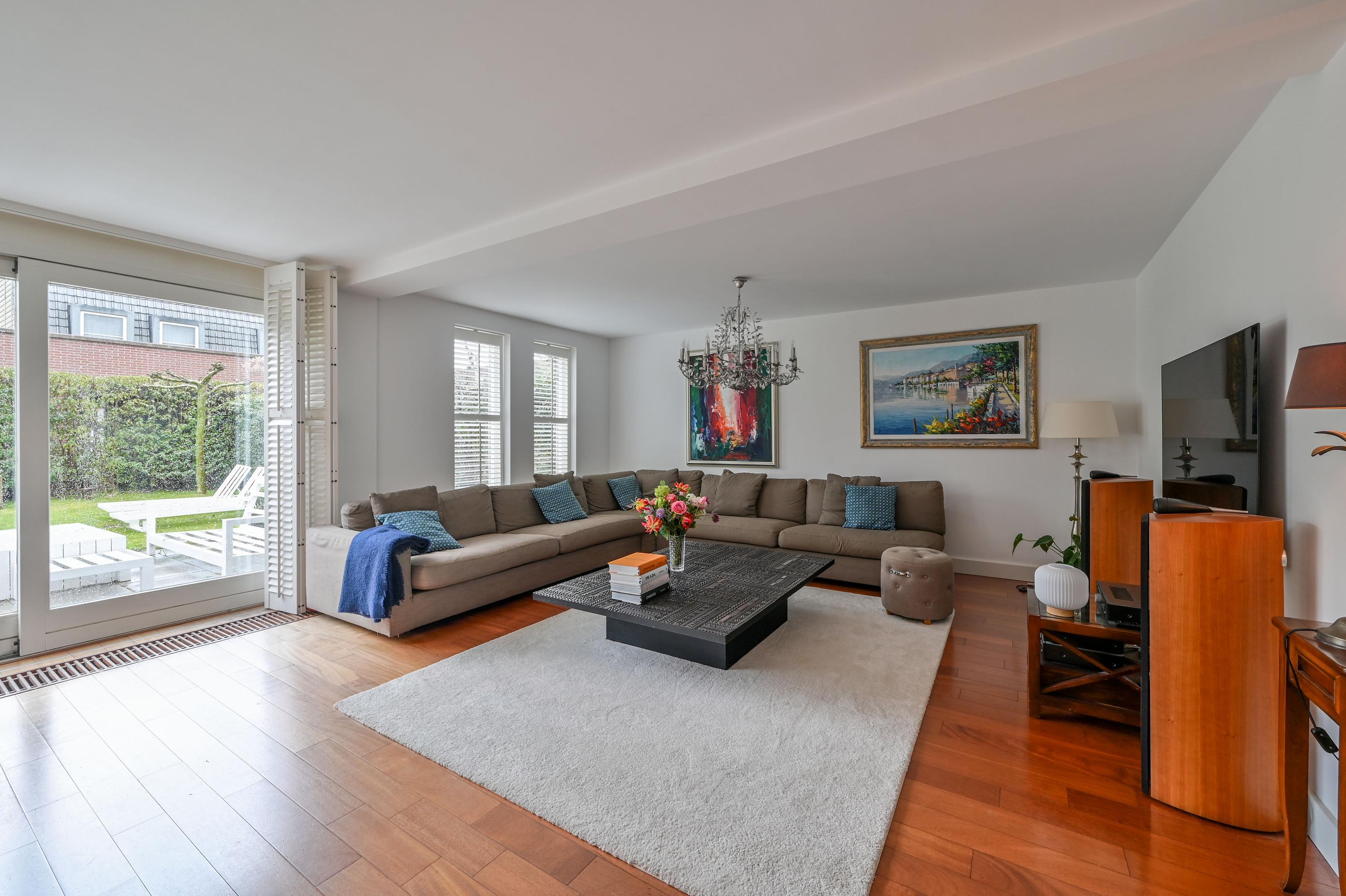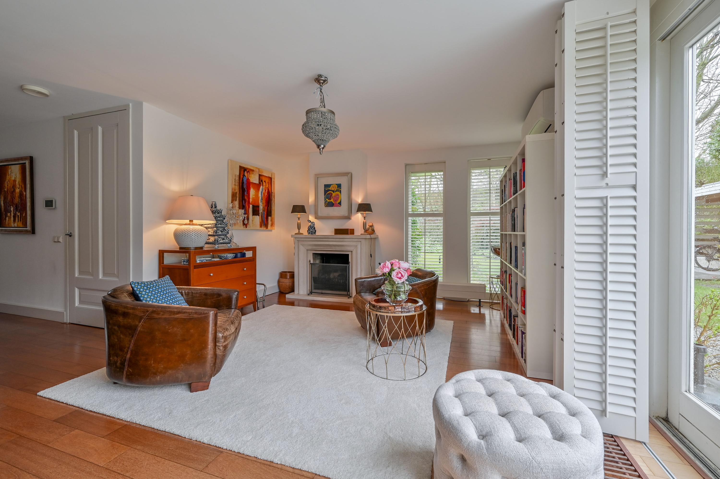 The L-shaped living room at the rear, with a generous seating area, offers beautiful views of the garden and a wide sliding door to the outside. The spacious seating area and a cozy reading corner with a wood-burning stove make it a place to completely unwind. The large side window overlooks the side garden, while shutters, sunscreens, and air conditioning ensure comfort in every season. The entire ground floor is finished with a warm, luxurious wooden floor.