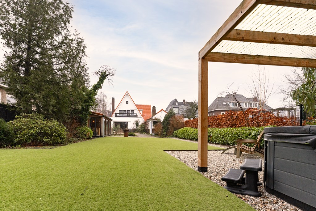 De woning is gelegen op een riant perceel van 1.043 m². Zowel aan de voor- als aan de achterzijde is de tuin groen, ruim en verzorgd en beschikt het over een ruime veranda met sfeervolle houtkachel. De in 2021 aangelegde achtertuin ligt op het zuidoosten en biedt veel privacy door hoge bomen en beschikt over een beregeningsinstallatie en fraaie tuinverlichting. Door de diverse terrassen, is er op elk moment van de dag een zonnige plek te vinden.