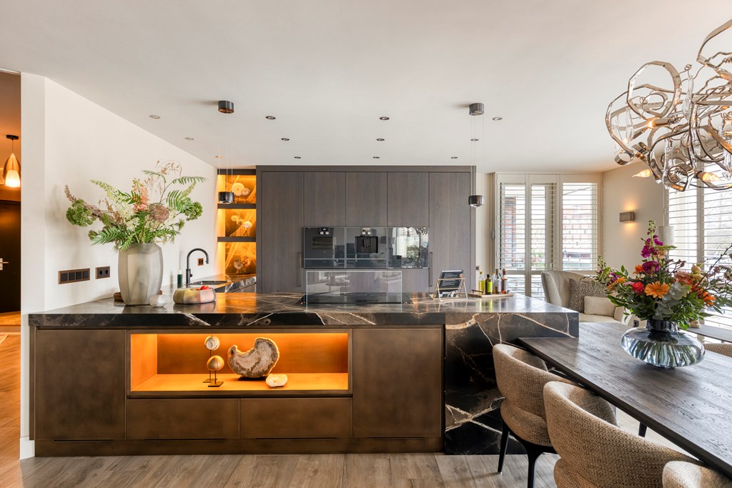 The luxury kitchen is truly a showpiece. The generous cooking island invites long dinners and convivial gatherings, while high-end built-in appliances by Gaggenau, including a combi-oven, steam oven, coffee machine, induction hob with downdraft extractor, Quooker, dishwasher, refrigerator, and freezer, ensure optimal cooking comfort. Adjacent is the luxurious dining area, perfectly positioned in natural daylight.