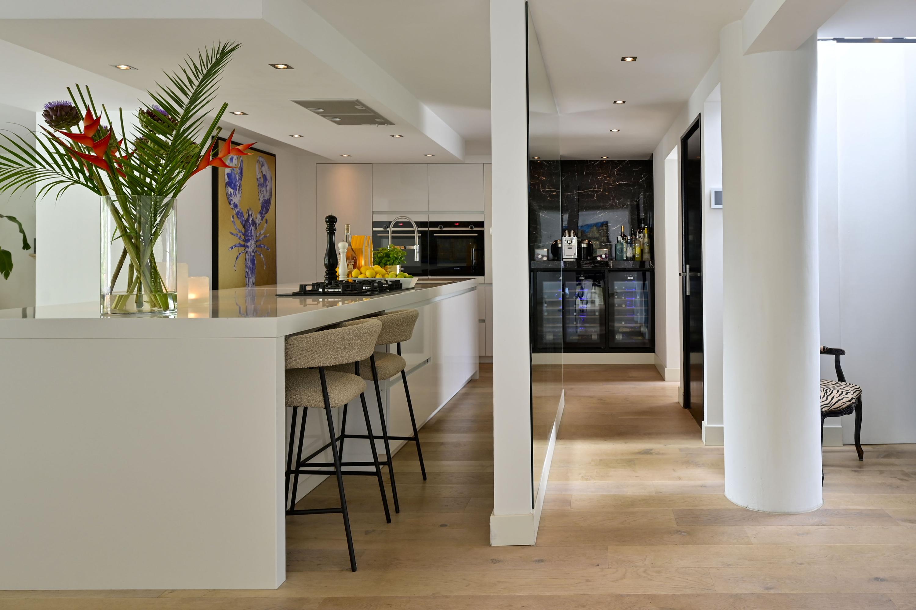 Inside, a spacious open-plan living area awaits, centered around a luxurious kitchen that flows effortlessly into a stylish lounge. This kitchen is a dream for any culinary enthusiast: a large cooking island with premium Siemens built-in appliances, two dishwashers, wine climate cabinets, and even a dedicated barista corner. Adjacent is a practical utility room with an American-style fridge, ice maker, and extra freezer.