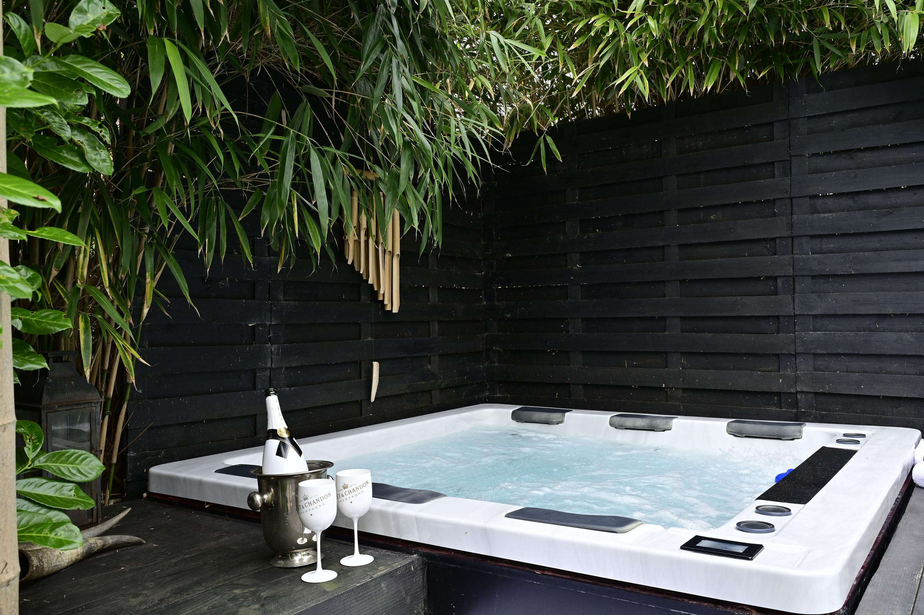 Private spa area in the garden: pool, jacuzzi, built-in lounge bench