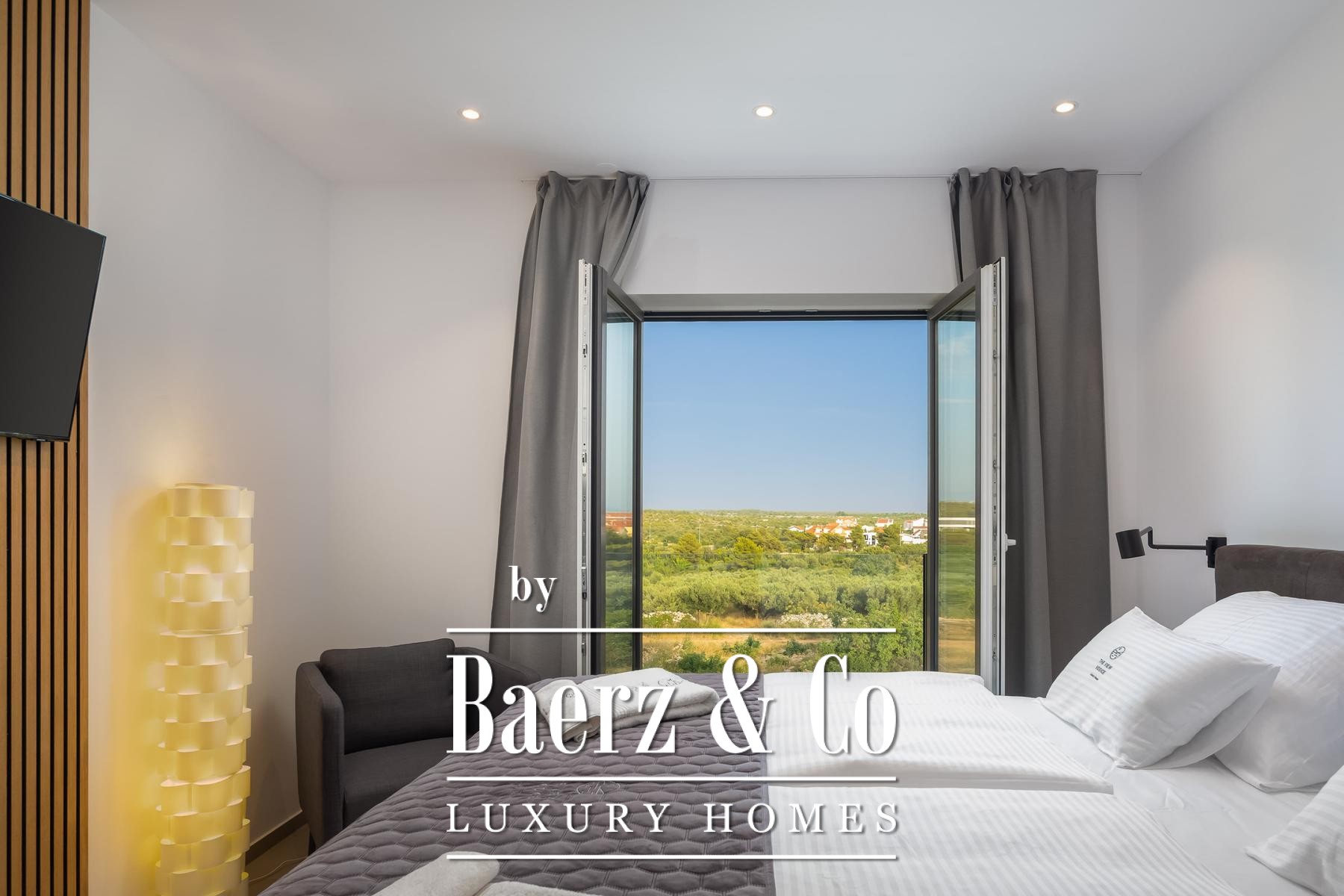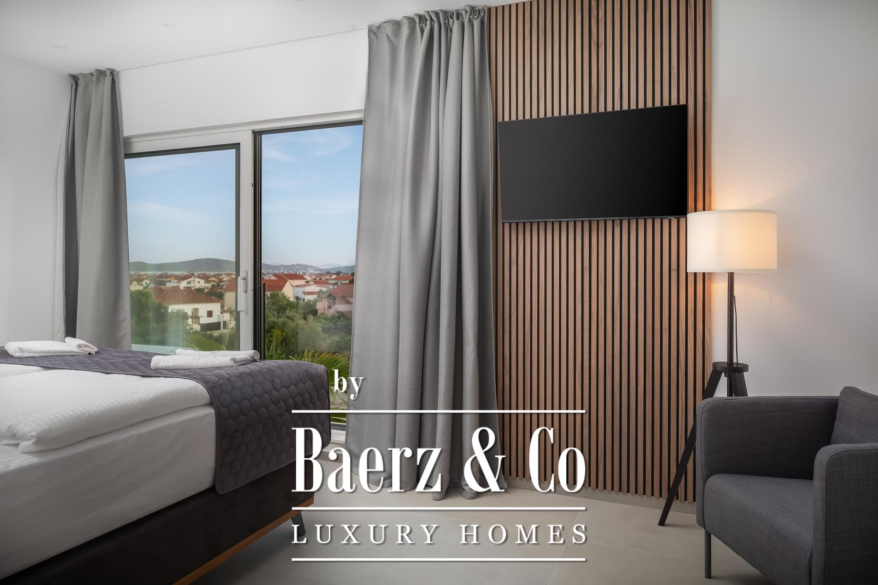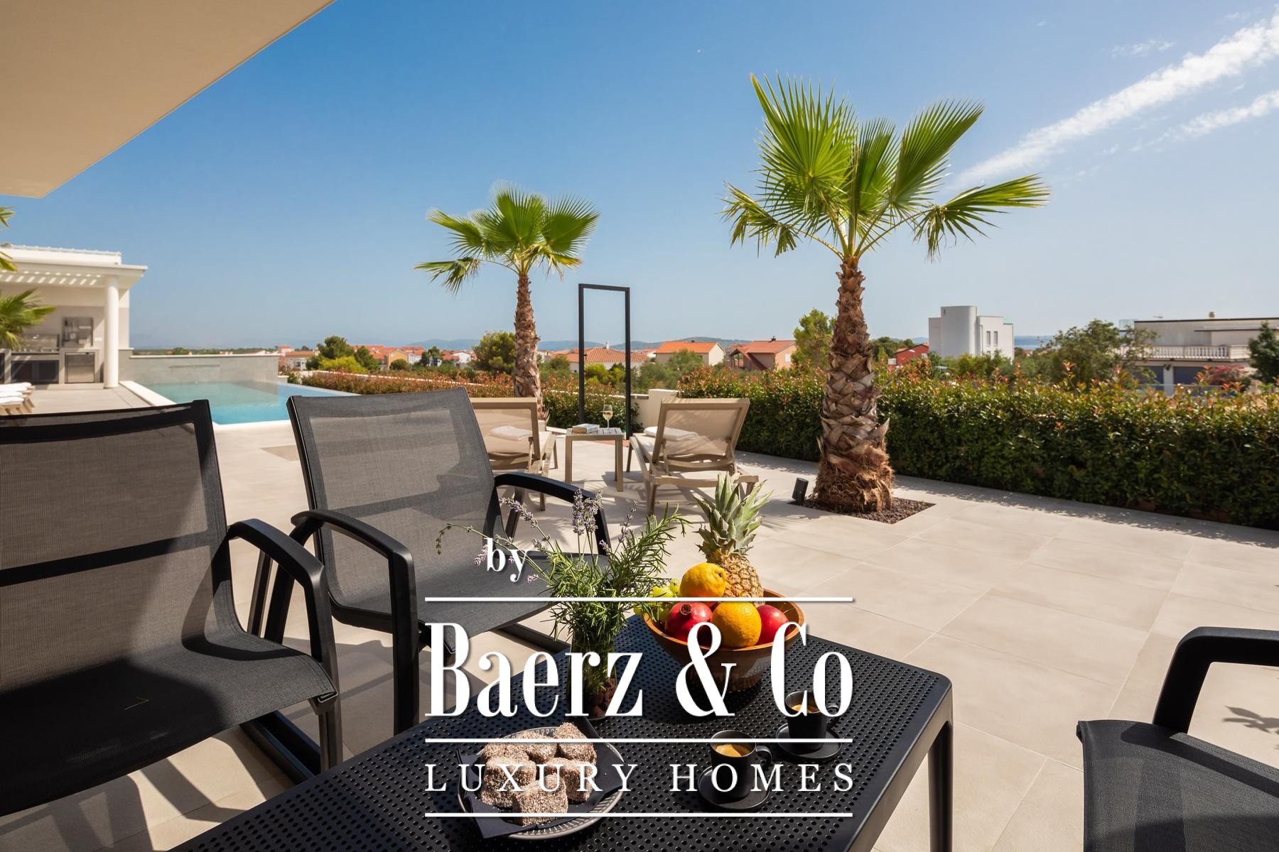 Vodice, modern villa with a swimming pool and sea view, 332.92 m2. The villa was built in 2022. It is being sold fully furnished and equipped, and is ideal for a vacation or tourist rental.Built on 2 floors on a plot of 838 m2. It consists of a ground floor with 2 bedrooms, each with its own bathroom, a garage, a toilet, and a spacious living room with a kitchen and dining room. The living room opens onto an outdoor terrace with a large heated pool next to which there is a sunbathing area, and a summer kitchen equipped with top-quality appliances. On the first floor there are three more bedrooms, each with its own bathroom, and a laundry room with a washing machine and two dryers. The bedrooms open onto