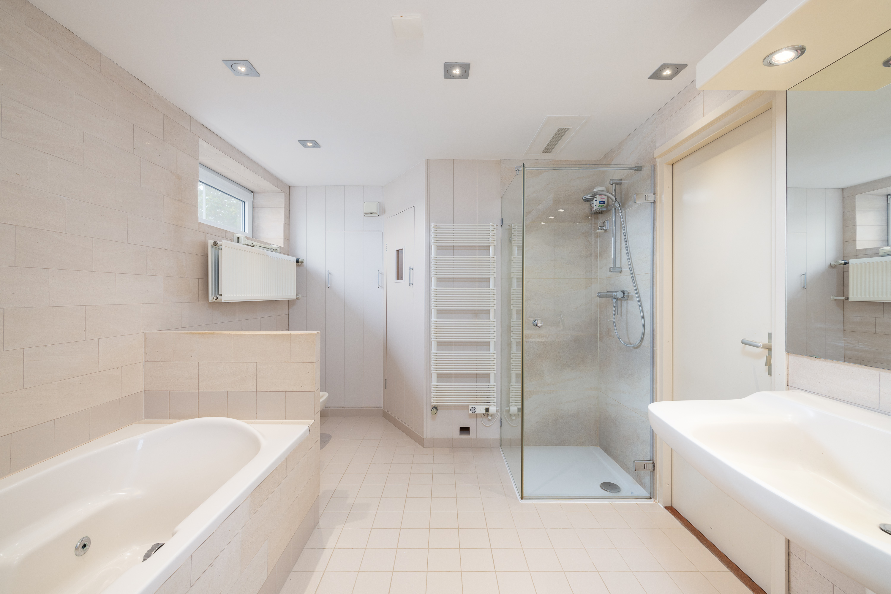 The bathroom at the rear has a small sauna. The second bathroom is equipped with a walk-in shower, connections for washing appliances, and a separate toilet.