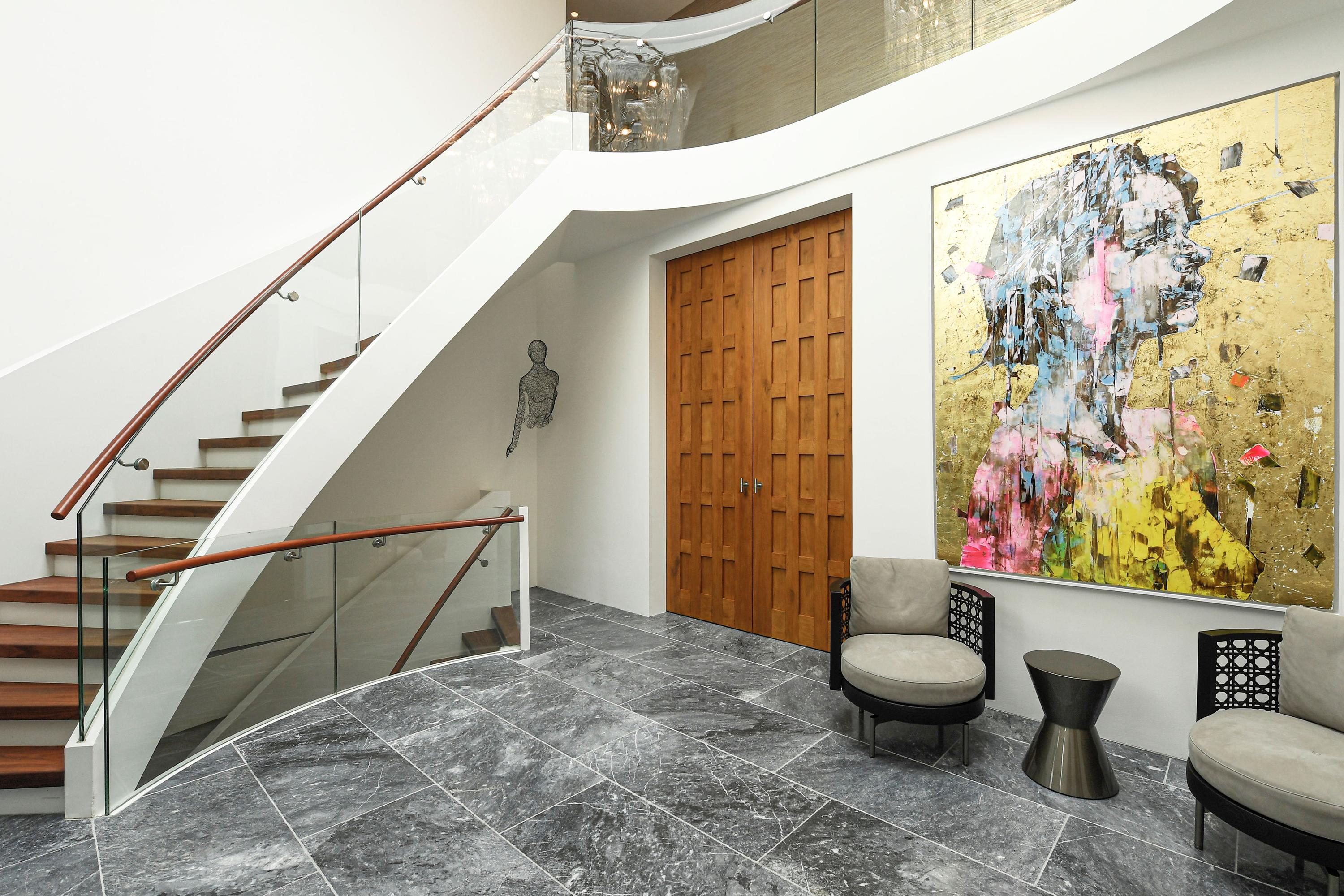 The sculptural staircase leads to a spacious landing with gallery.