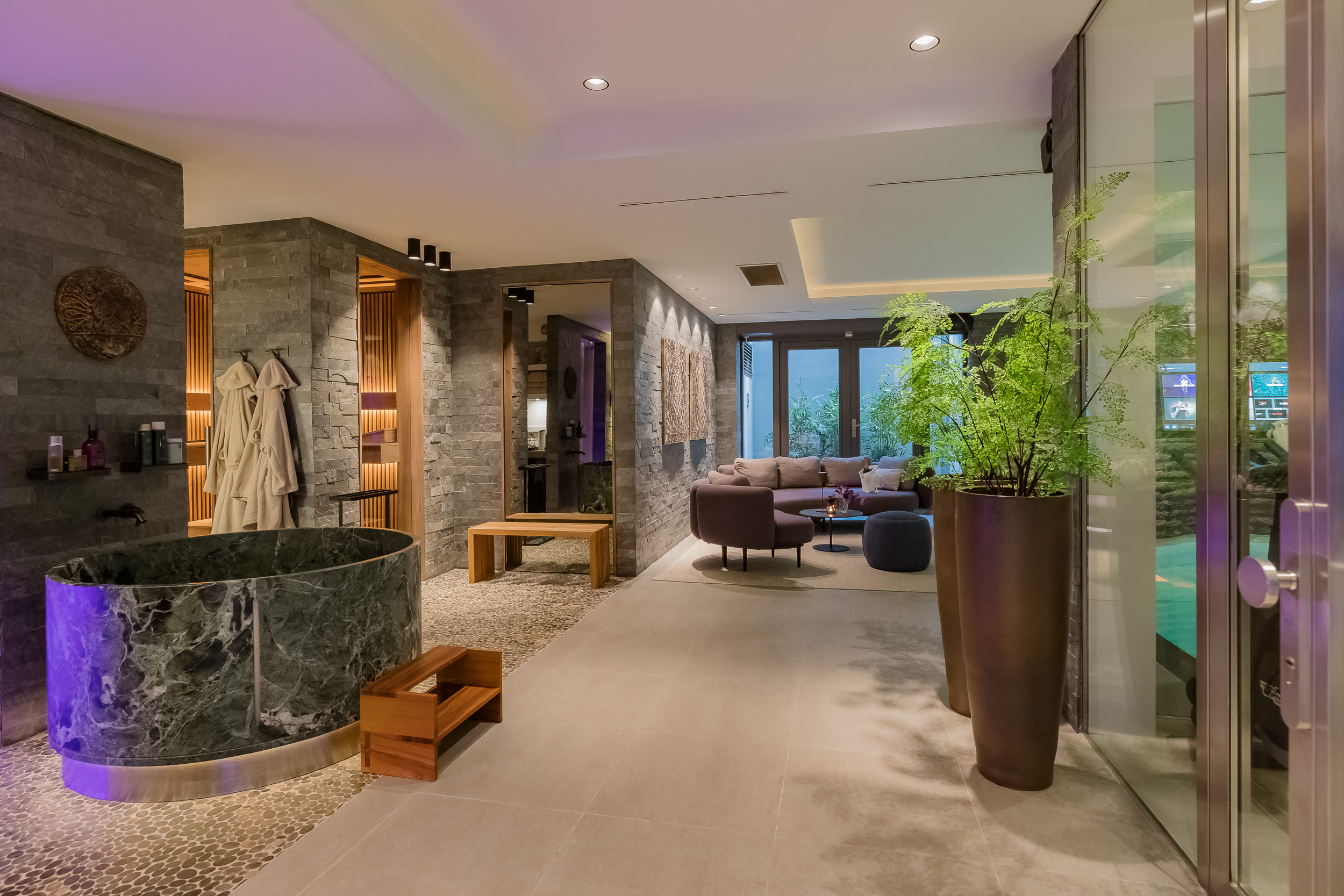 This level also features a modern fitness area, steam cabin, wet infrared sauna, and an exclusive private cinema.