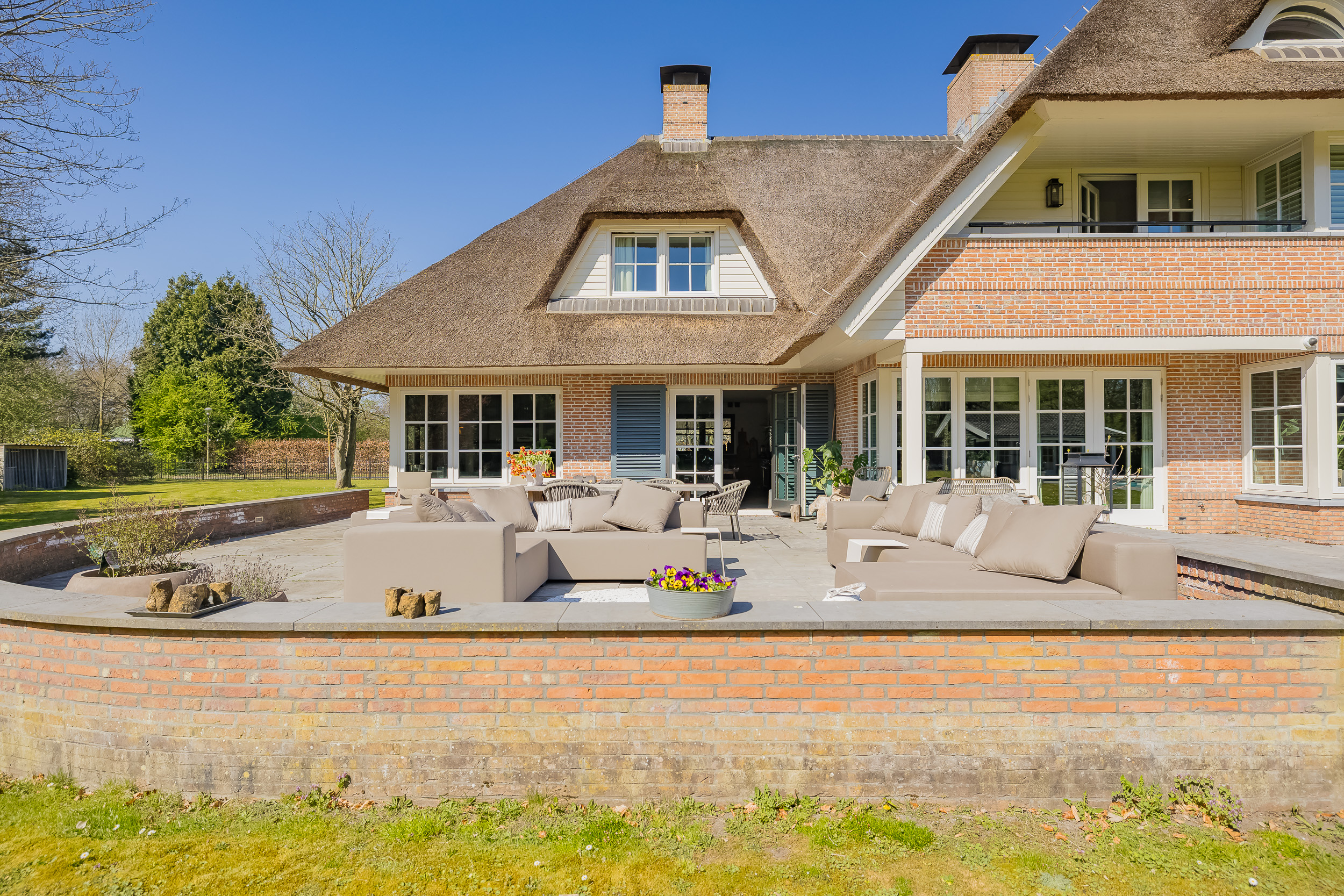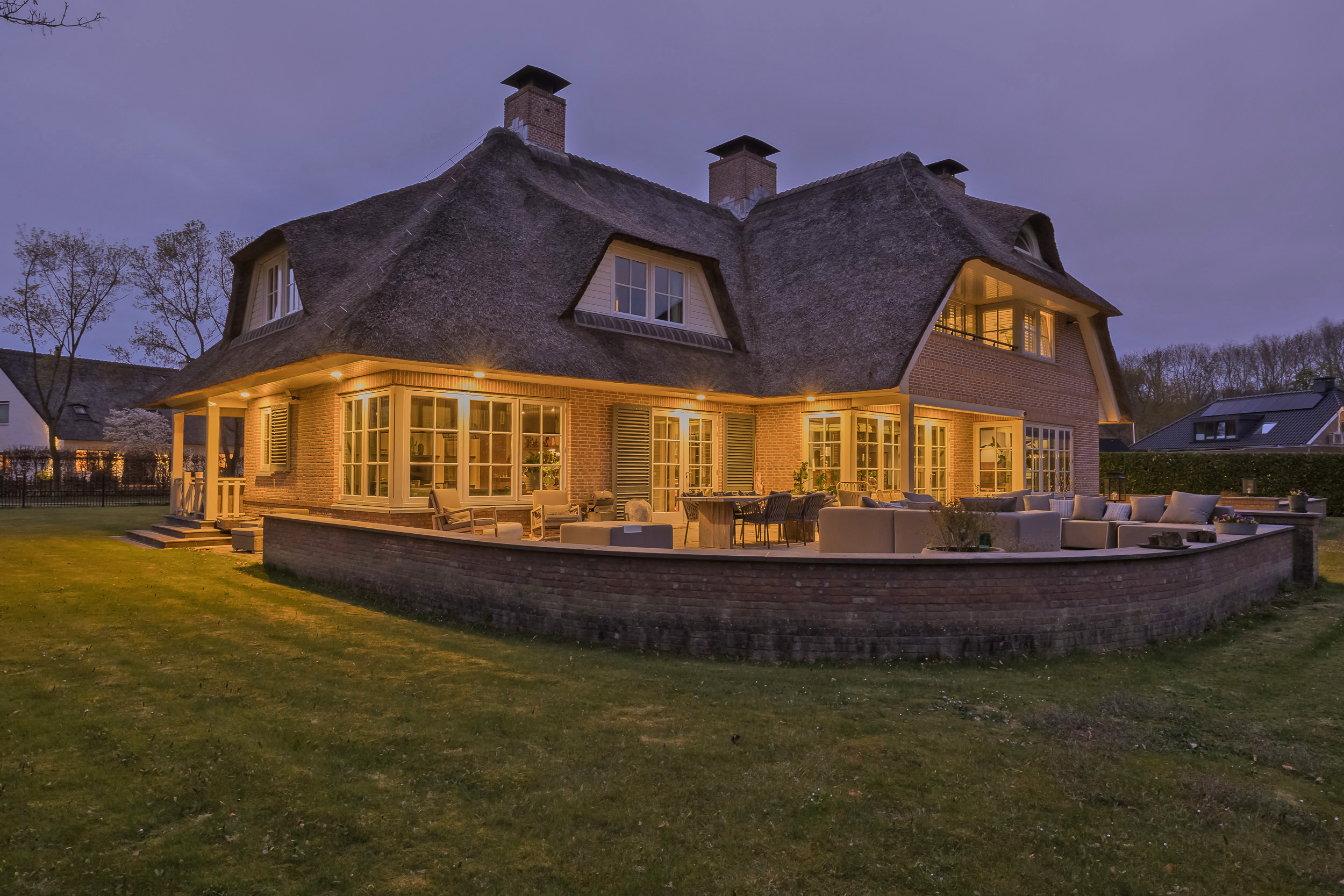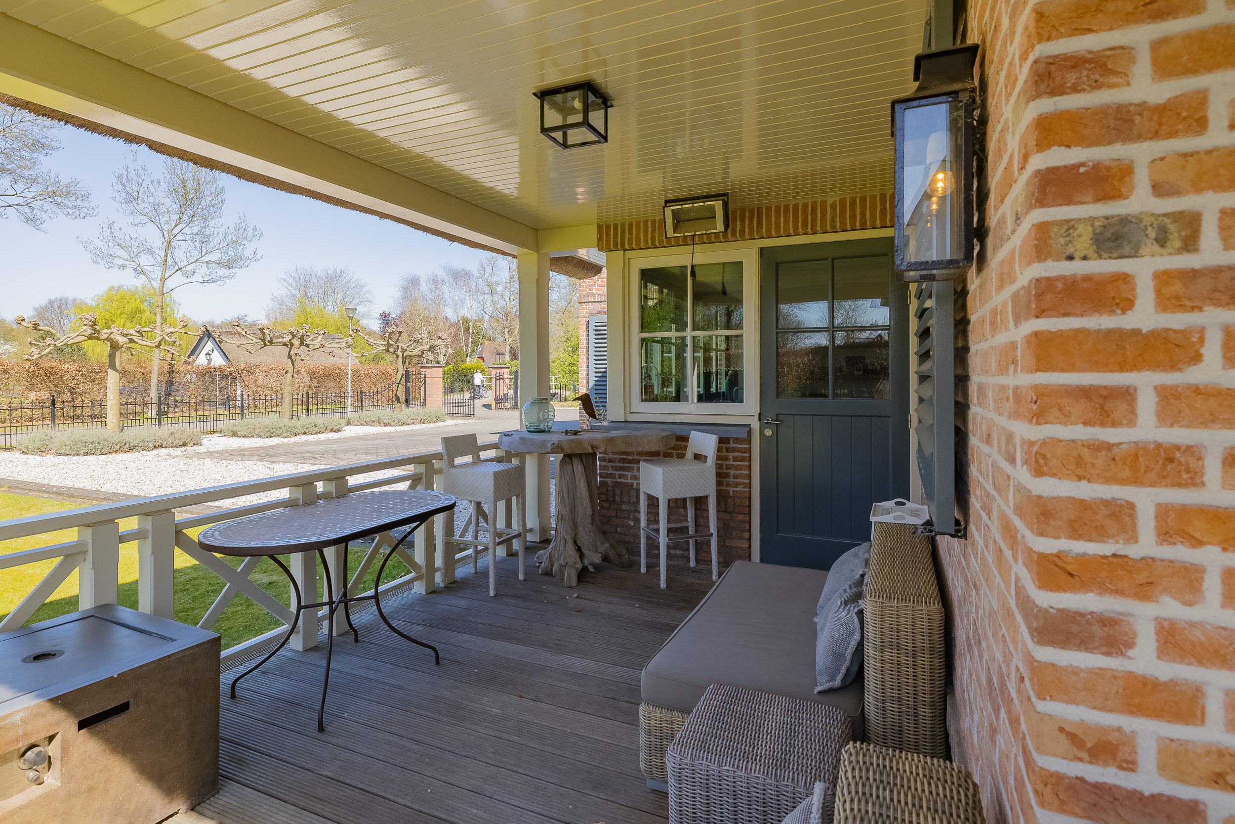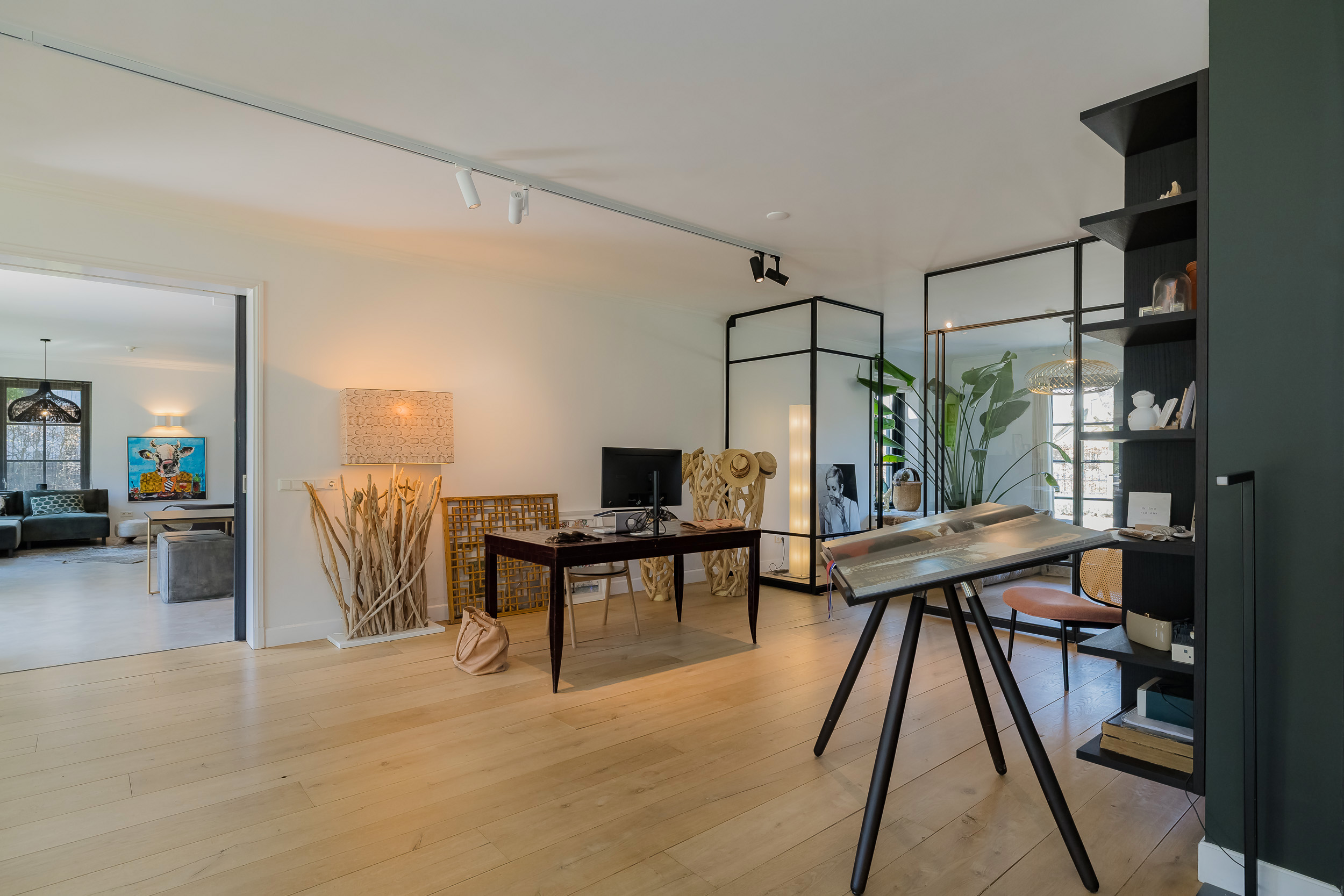 Step into the spacious hall with guest toilet and immediately feel the stylish atmosphere that continues throughout the house. The spacious living room with a beautiful sandstone fireplace and large windows offers a fantastic view of the surrounding garden. For cozy movie nights, there is a separate TV room directly to the right of the entrance. The beautiful concrete-look floor (hallway and living kitchen), luxury steel doors and the high-end kitchen with work island and high-quality appliances provide a modern, yet warm feel. In the living kitchen is further created a lovely sitting area, with access and view of the garden and a modern gas fireplace. Furthermore, on the first floor you will find a practical utility room, double garage, and have access to a spacious porch and a large terrace, where you can fully enjoy the outdoors.