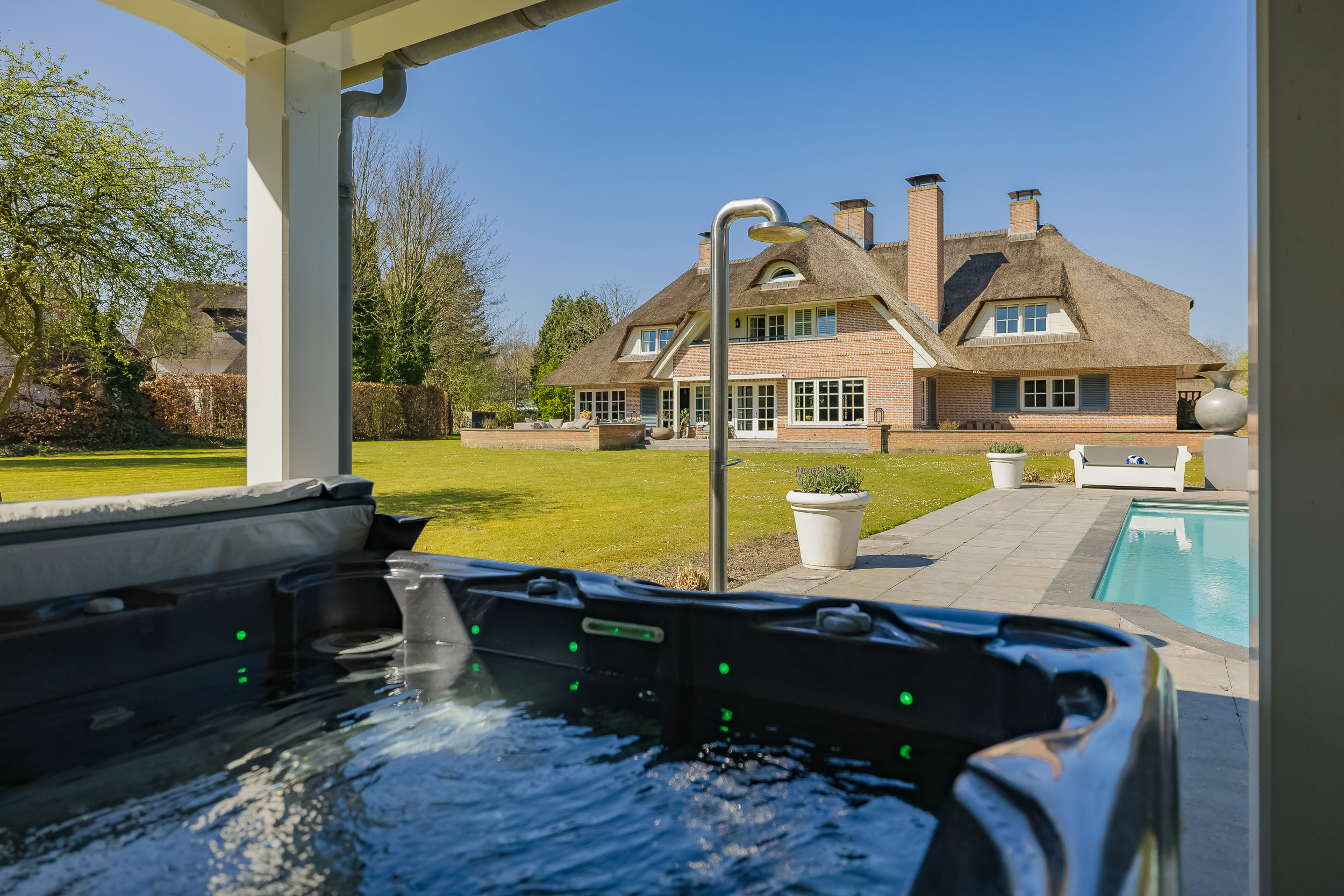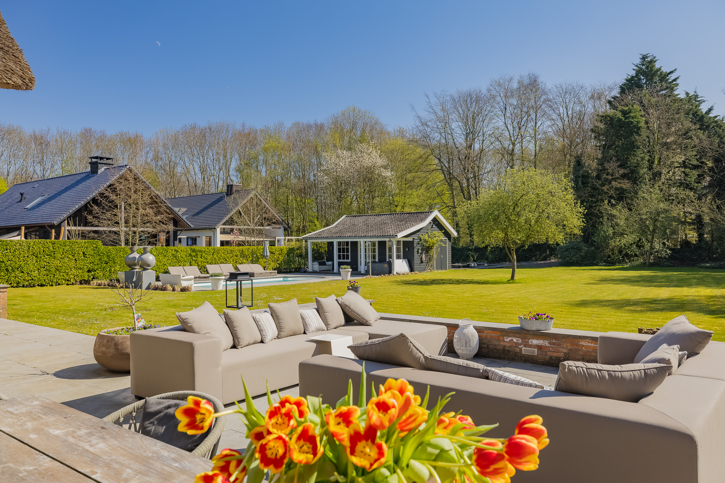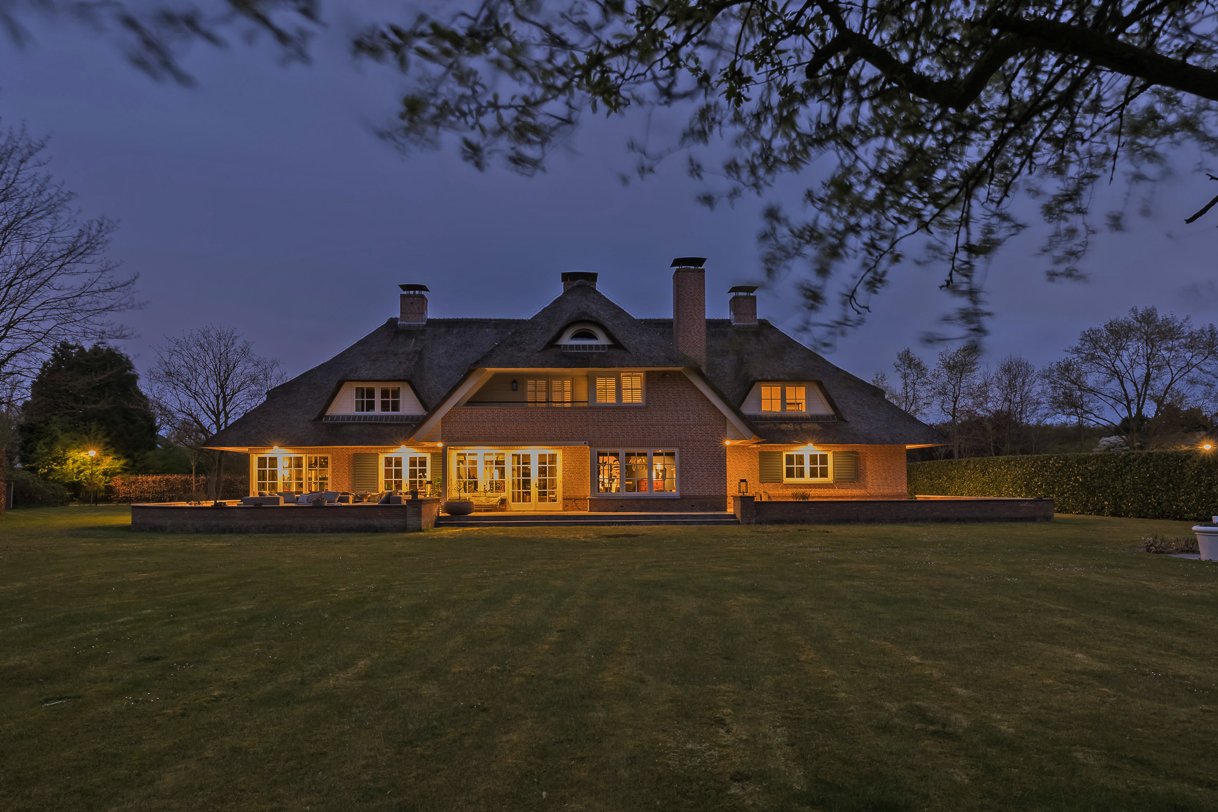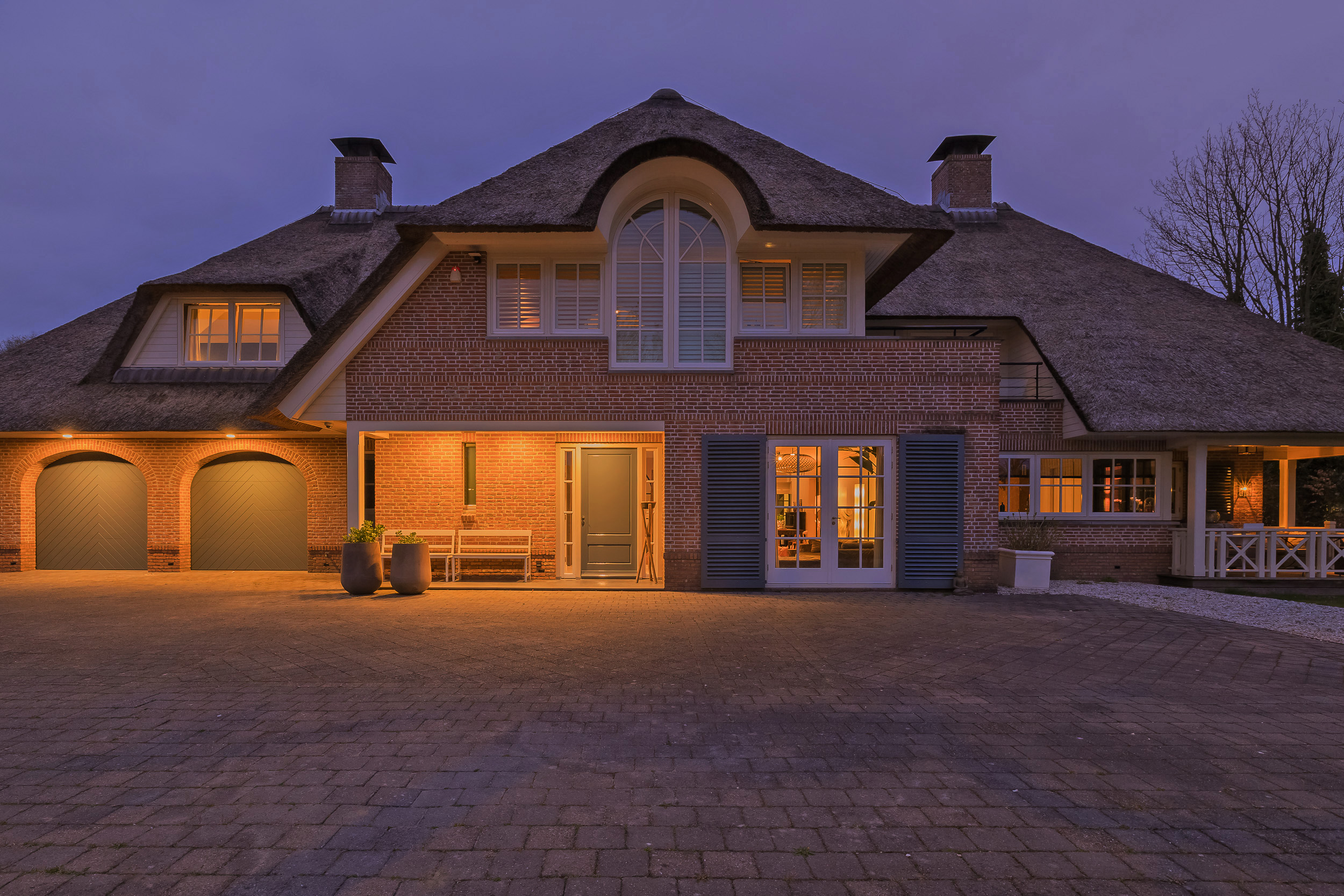 Step into the spacious hall with guest toilet and immediately feel the stylish atmosphere that continues throughout the house. The spacious living room with a beautiful sandstone fireplace and large windows offers a fantastic view of the surrounding garden. For cozy movie nights, there is a separate TV room directly to the right of the entrance. The beautiful concrete-look floor (hallway and living kitchen), luxury steel doors and the high-end kitchen with work island and high-quality appliances provide a modern, yet warm feel. In the living kitchen is further created a lovely sitting area, with access and view of the garden and a modern gas fireplace. Furthermore, on the first floor you will find a practical utility room, double garage, and have access to a spacious porch and a large terrace, where you can fully enjoy the outdoors.