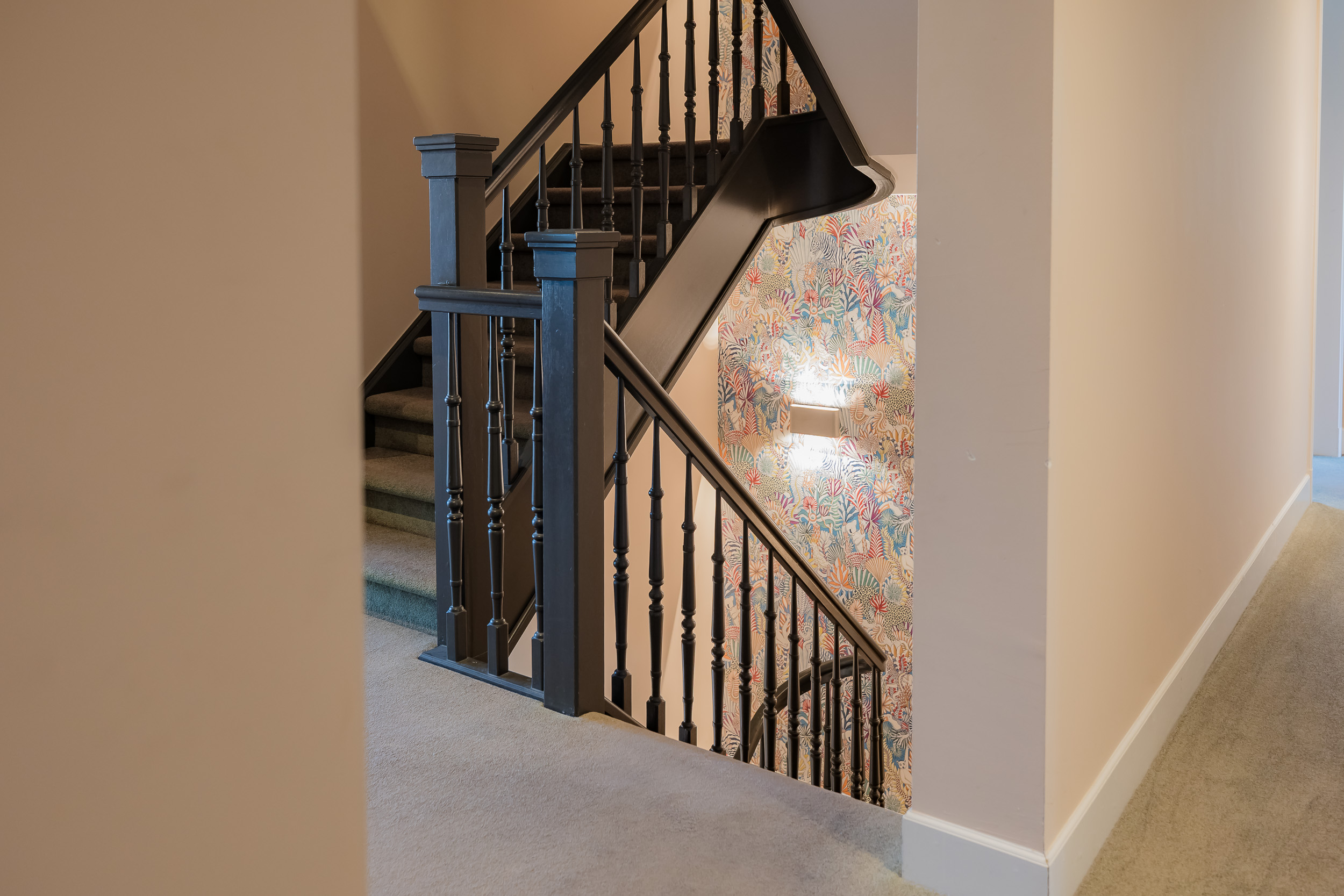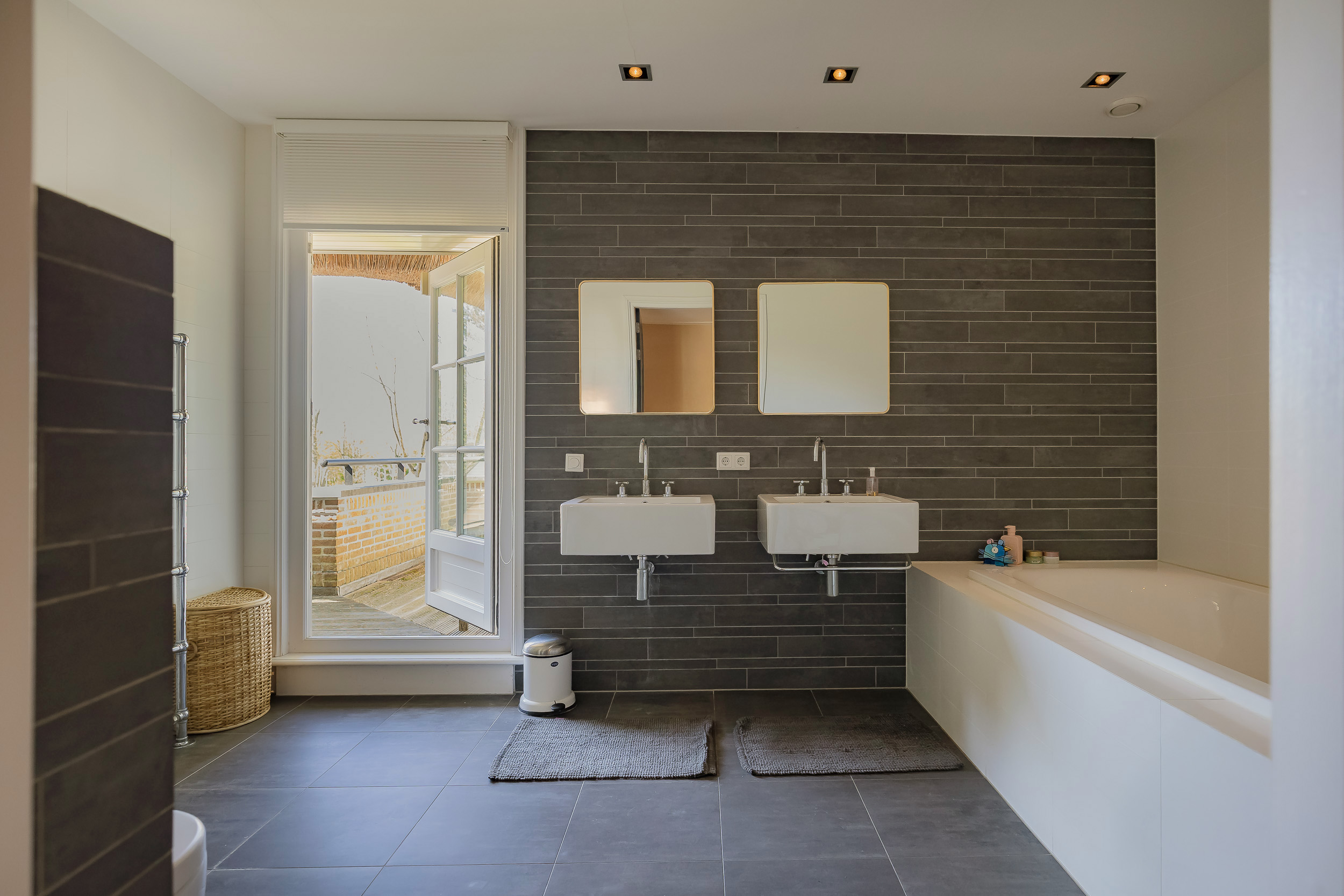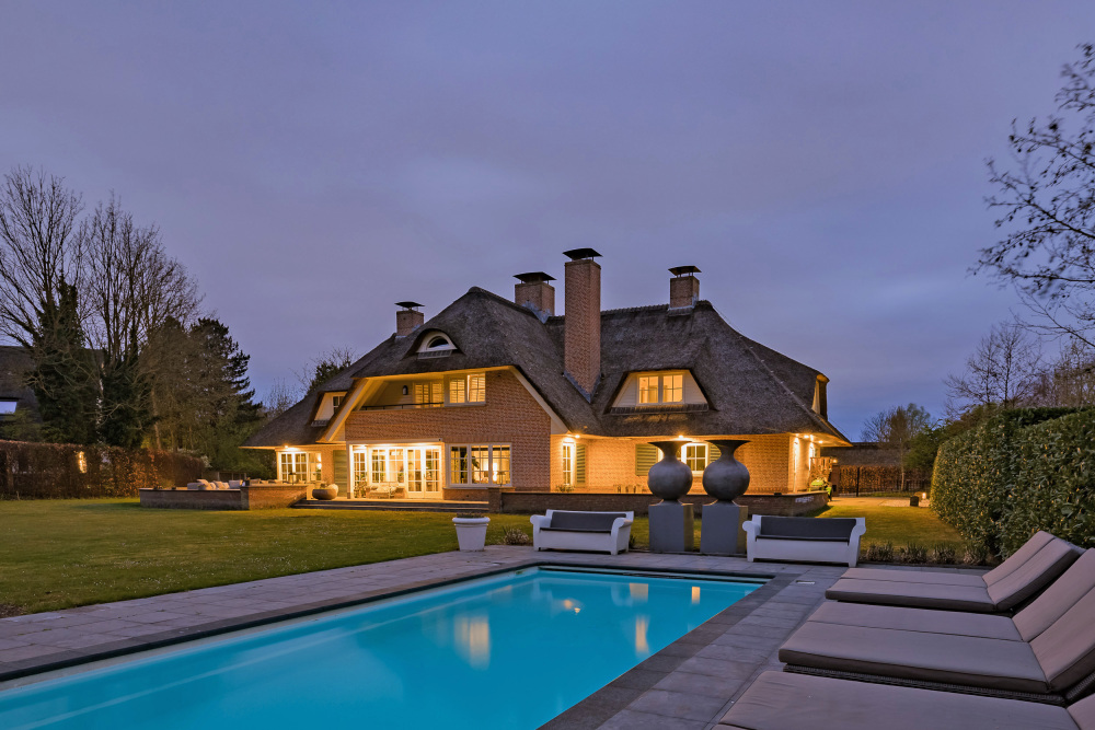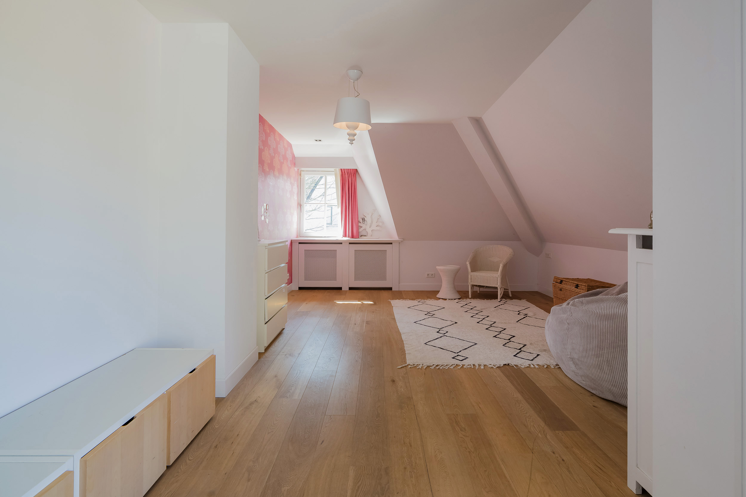Step into the spacious hall with guest toilet and immediately feel the stylish atmosphere that continues throughout the house. The spacious living room with a beautiful sandstone fireplace and large windows offers a fantastic view of the surrounding garden. For cozy movie nights, there is a separate TV room directly to the right of the entrance. The beautiful concrete-look floor (hallway and living kitchen), luxury steel doors and the high-end kitchen with work island and high-quality appliances provide a modern, yet warm feel. In the living kitchen is further created a lovely sitting area, with access and view of the garden and a modern gas fireplace. Furthermore, on the first floor you will find a practical utility room, double garage, and have access to a spacious porch and a large terrace, where you can fully enjoy the outdoors.