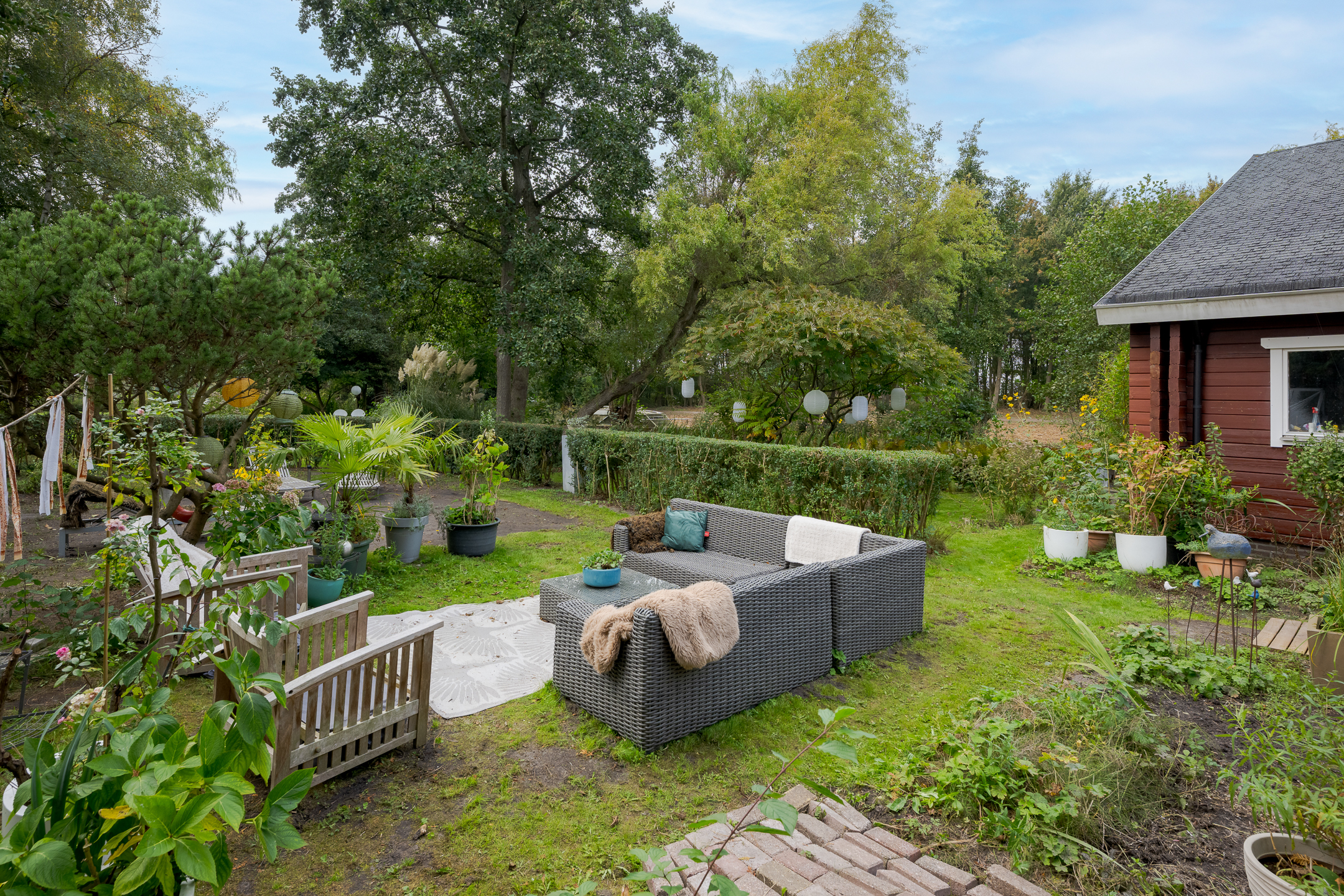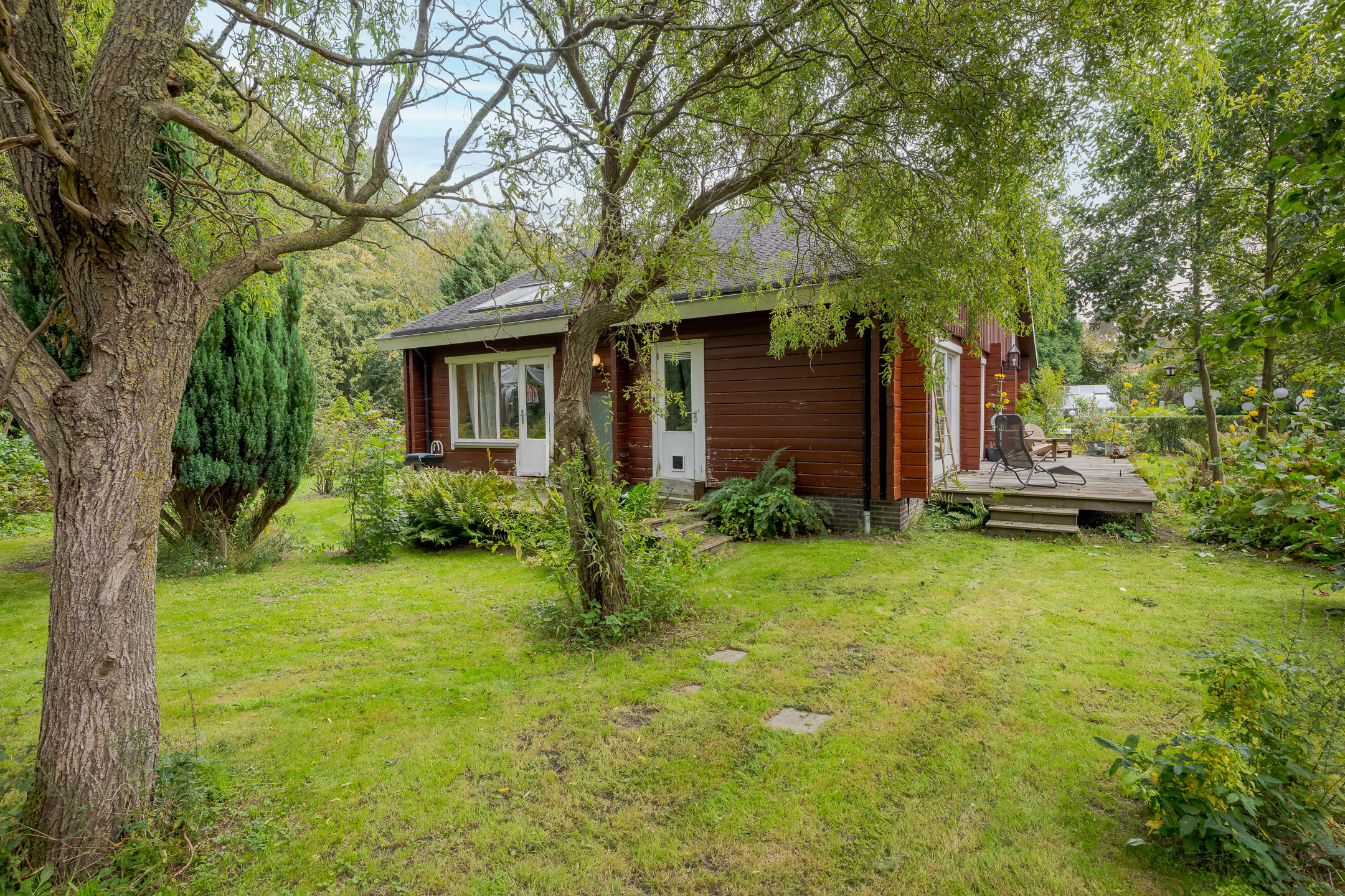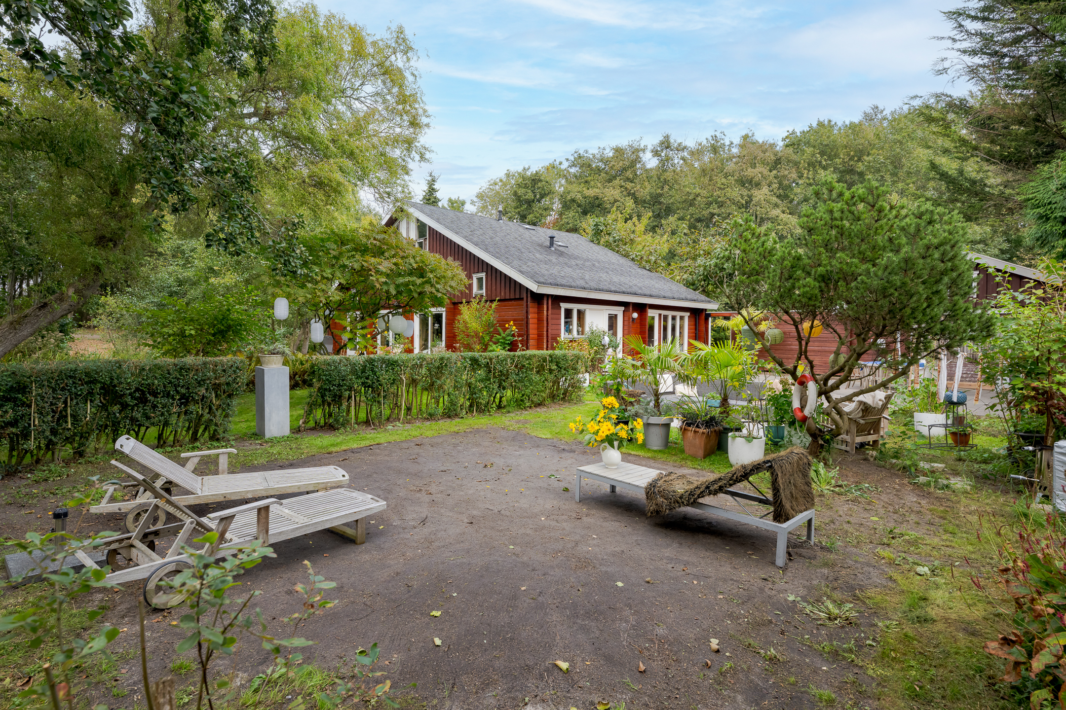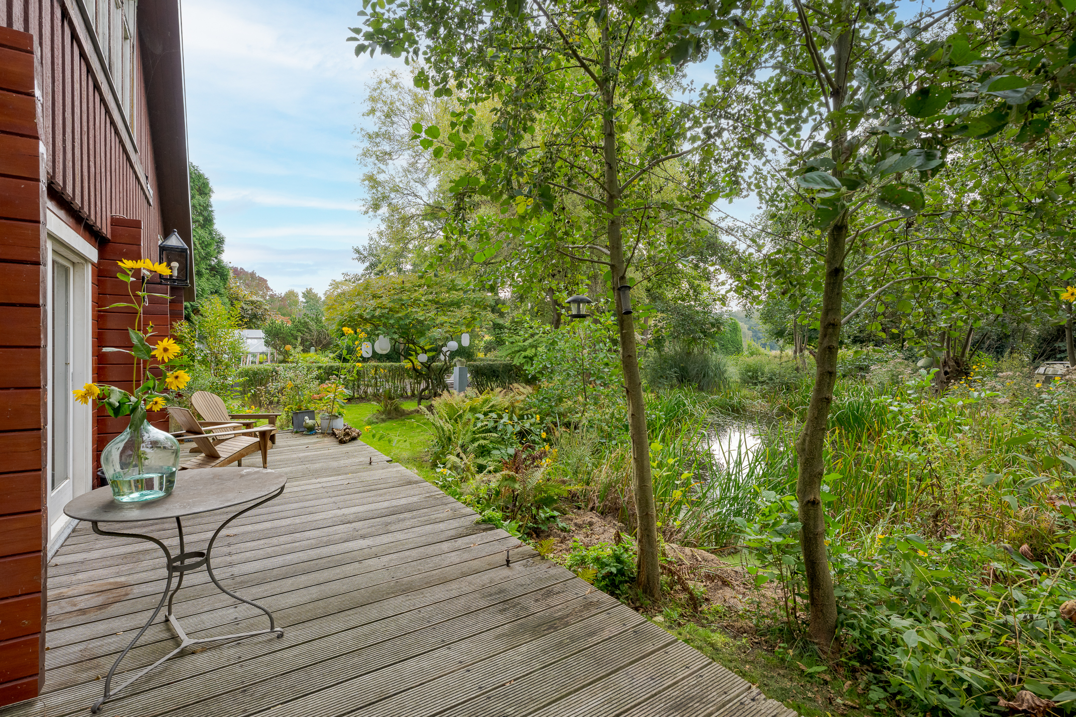 In the front yard, a spacious wooden garage (approximately 6 by 12 meters) sits perpendicular to the house, creating a courtyard with ample parking for several cars. But the real action is behind the house: the garden is over 50 meters deep and borders a tranquil lake with a view of a bird island.