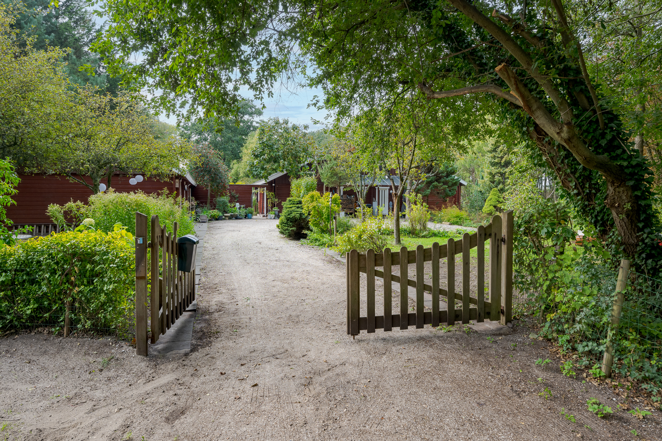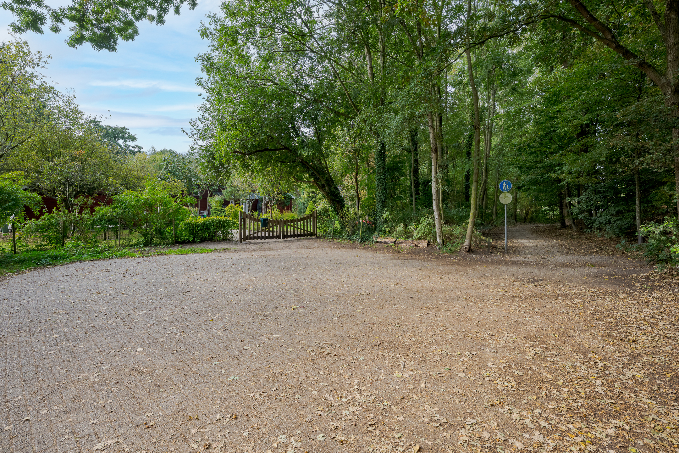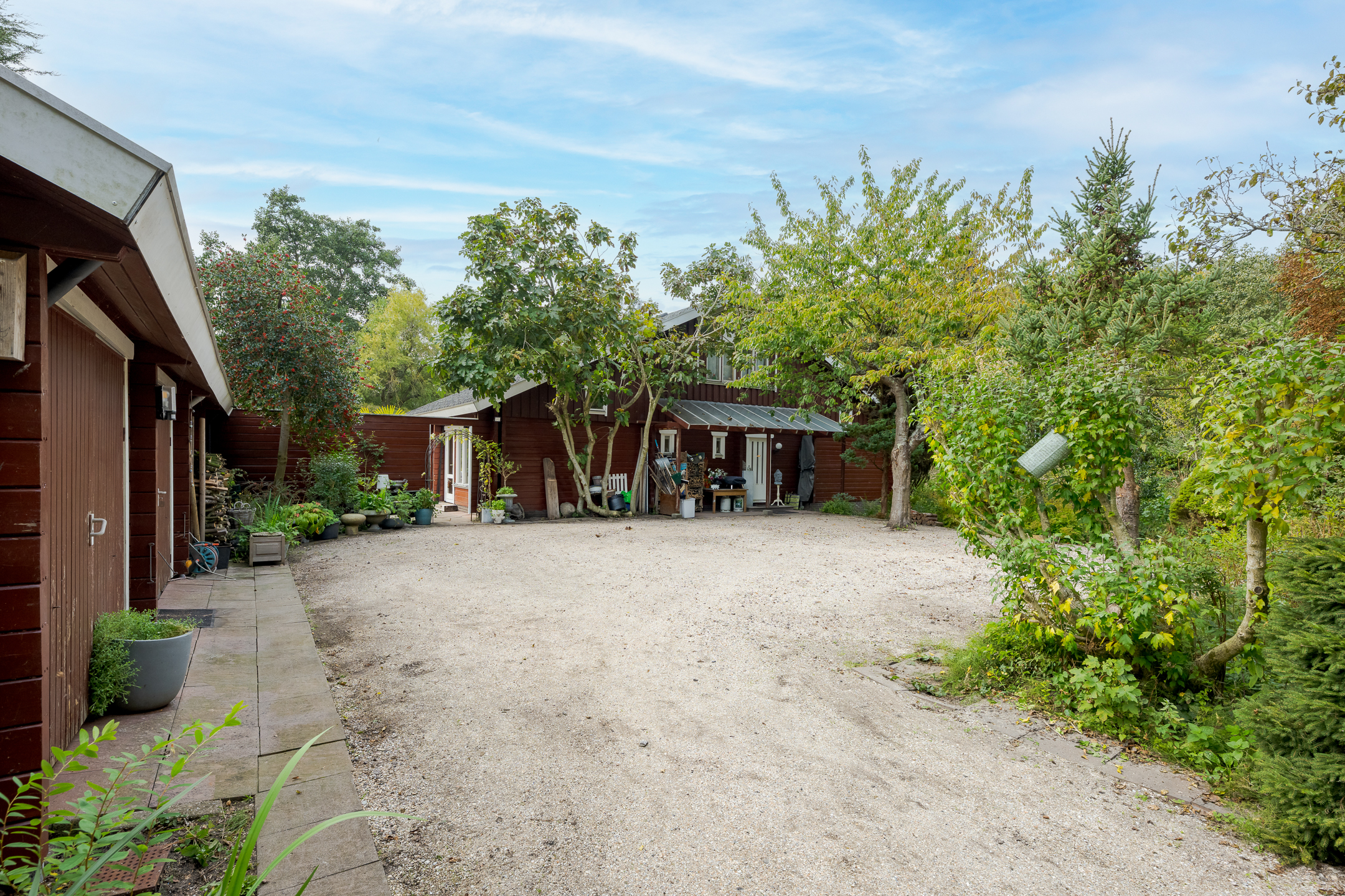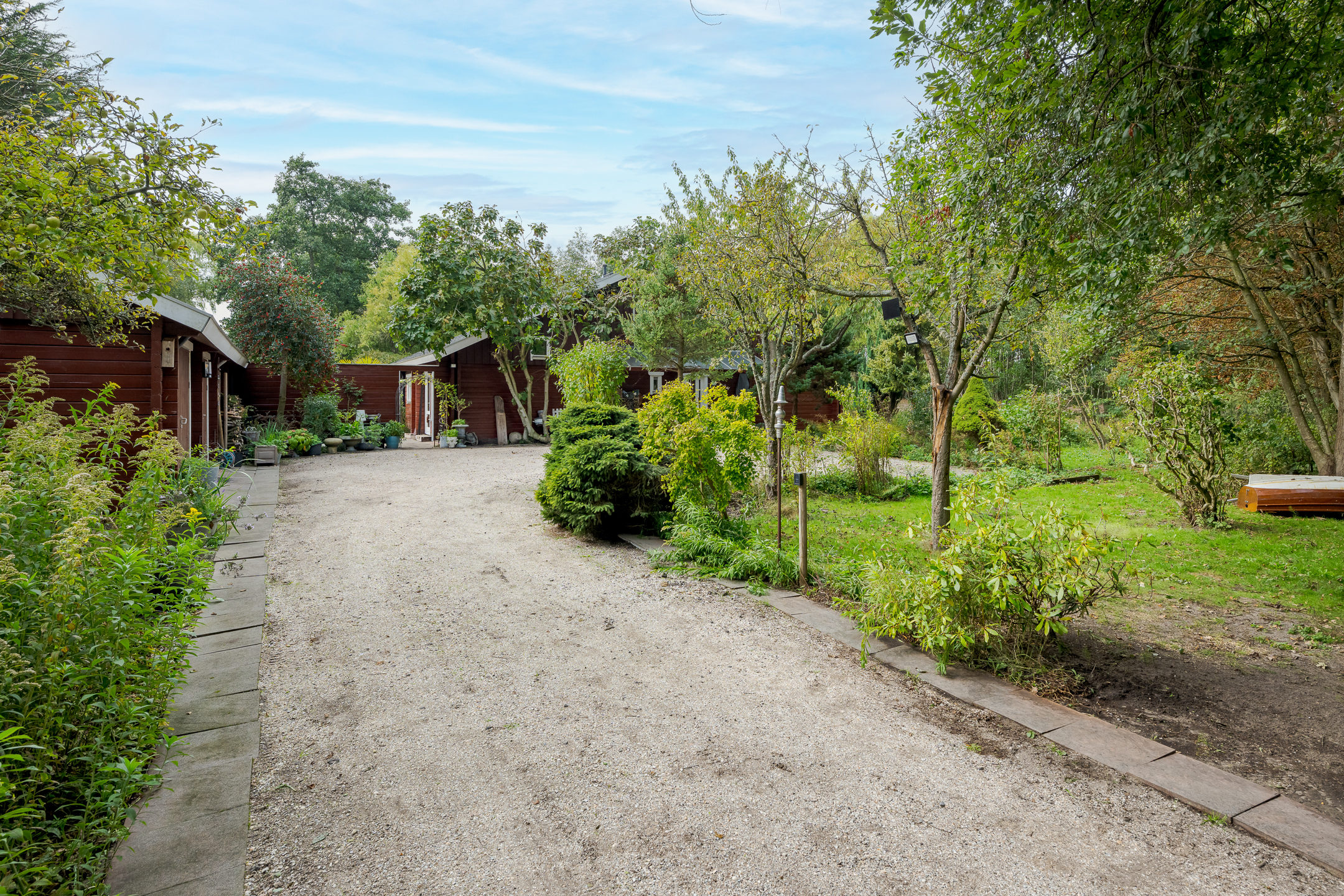 In the front yard, a spacious wooden garage (approximately 6 by 12 meters) sits perpendicular to the house, creating a courtyard with ample parking for several cars. But the real action is behind the house: the garden is over 50 meters deep and borders a tranquil lake with a view of a bird island.