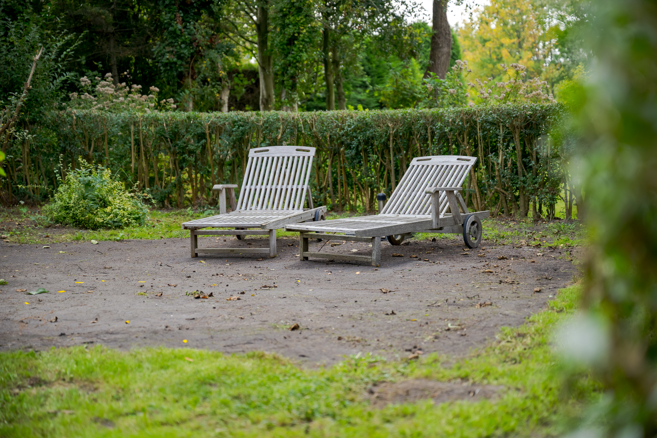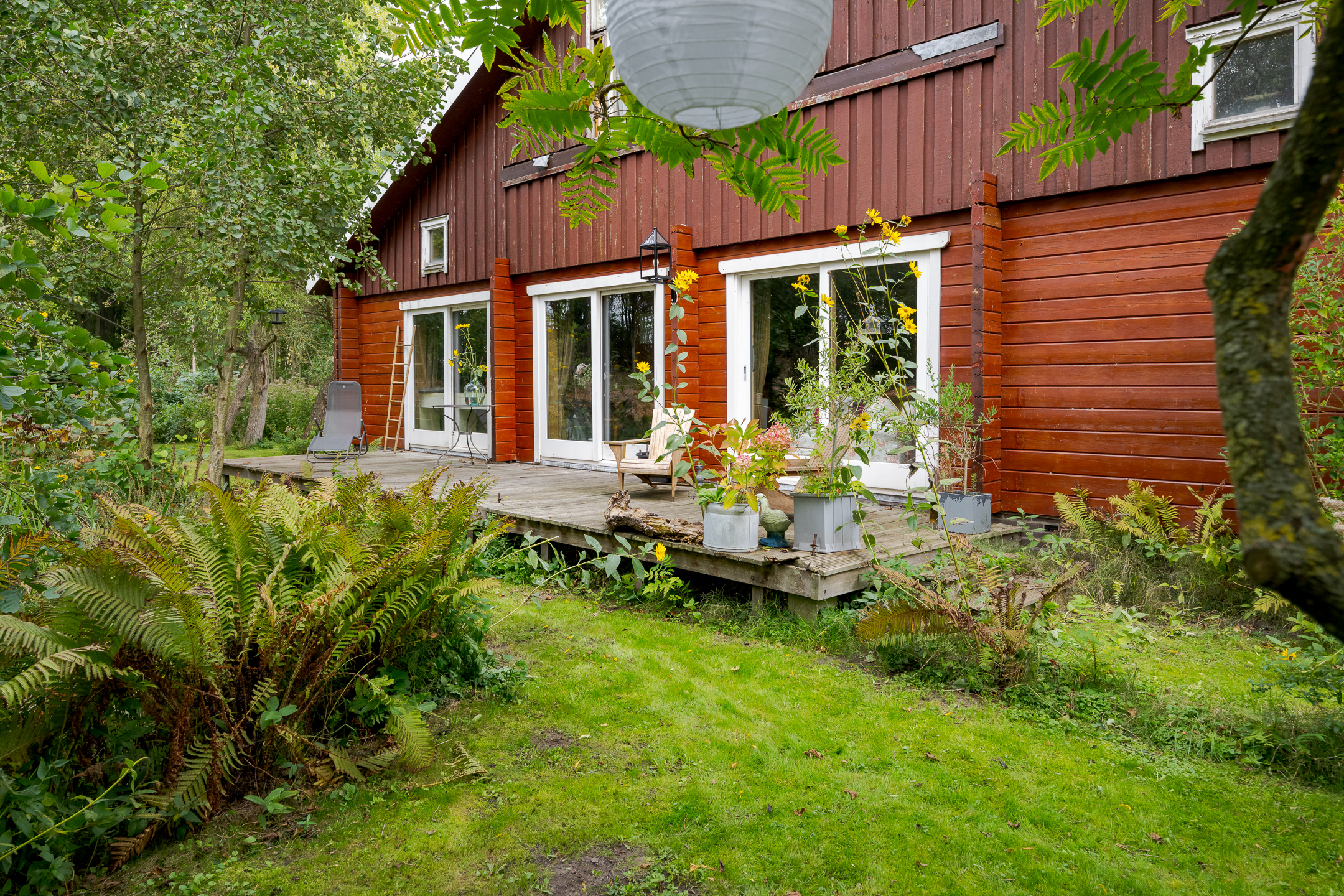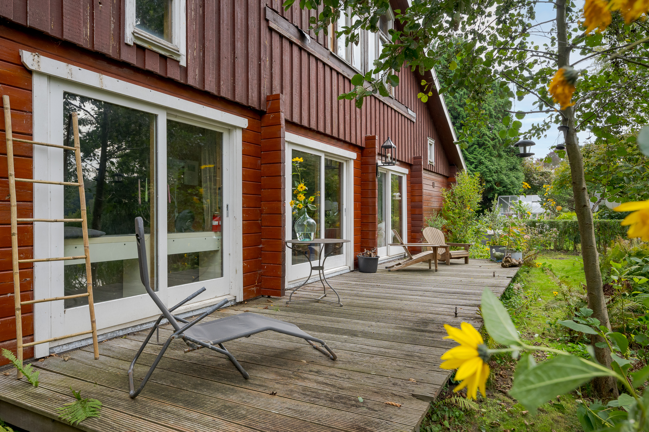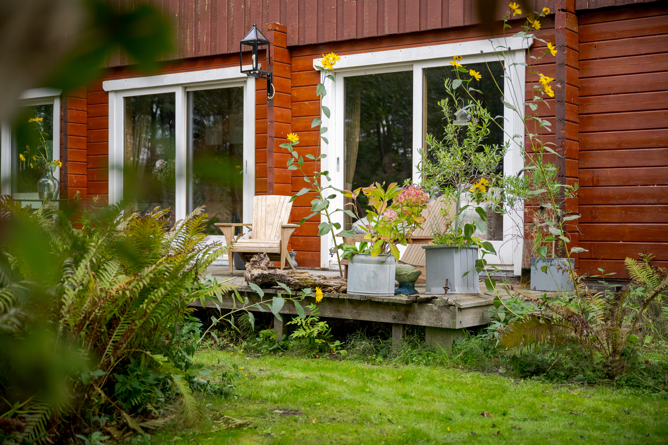 In the front yard, a spacious wooden garage (approximately 6 by 12 meters) sits perpendicular to the house, creating a courtyard with ample parking for several cars. But the real action is behind the house: the garden is over 50 meters deep and borders a tranquil lake with a view of a bird island.