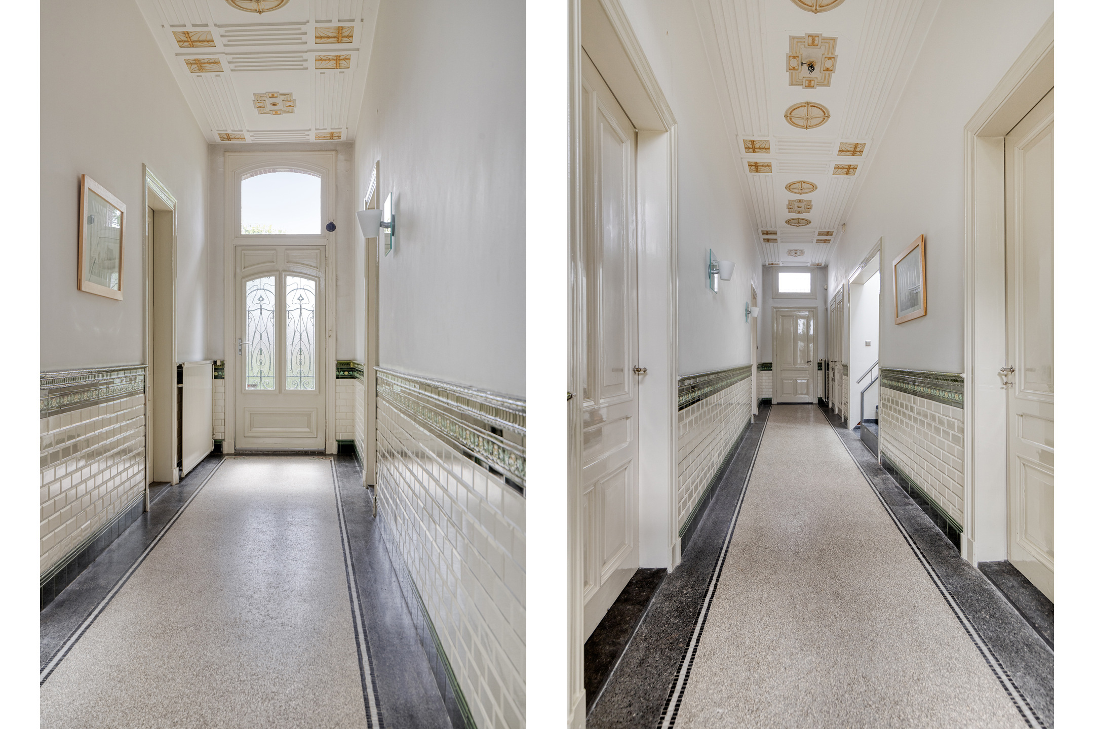 achter portaal, wandafwerking stucwerk, hardstenen vloer, balkenplafond;