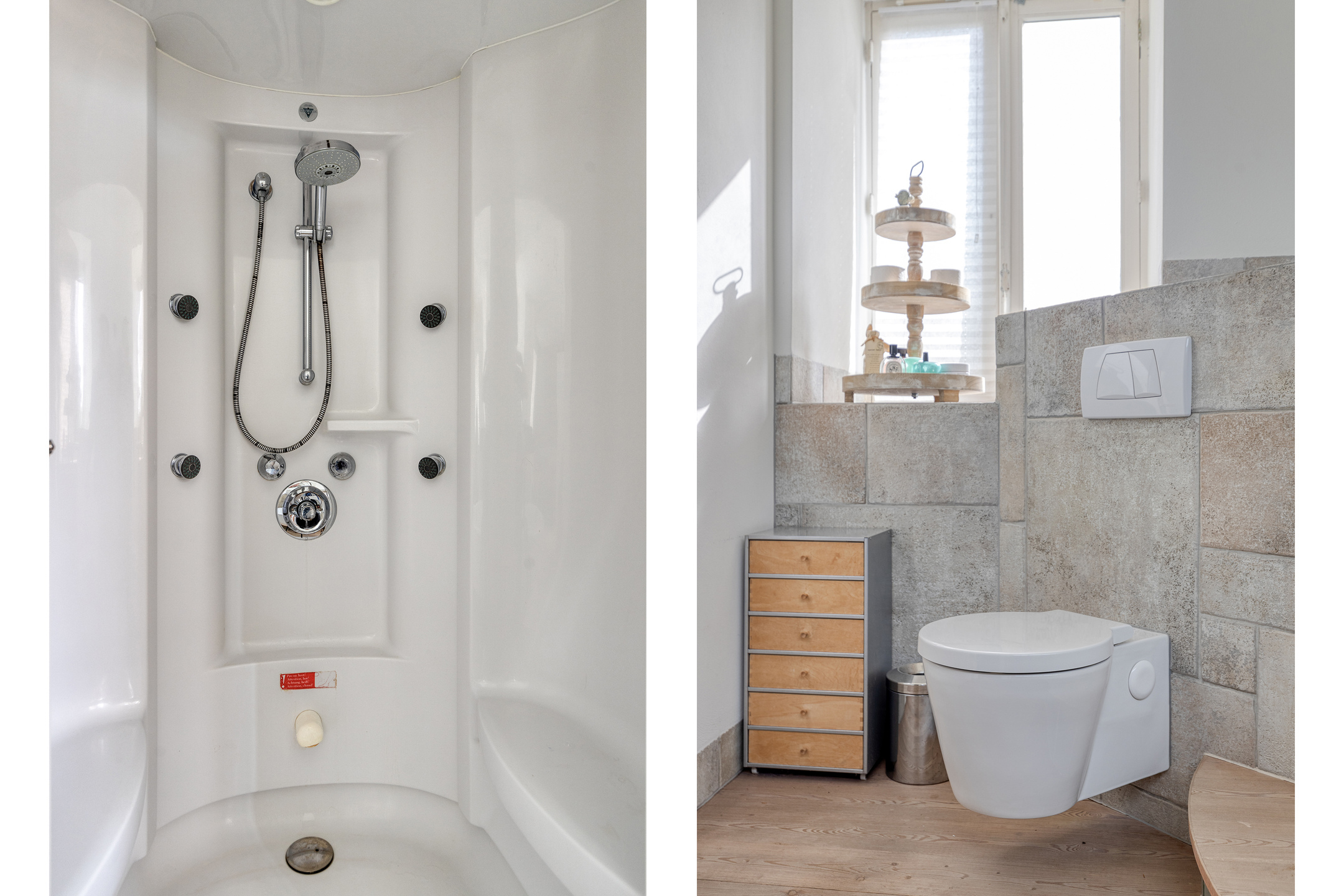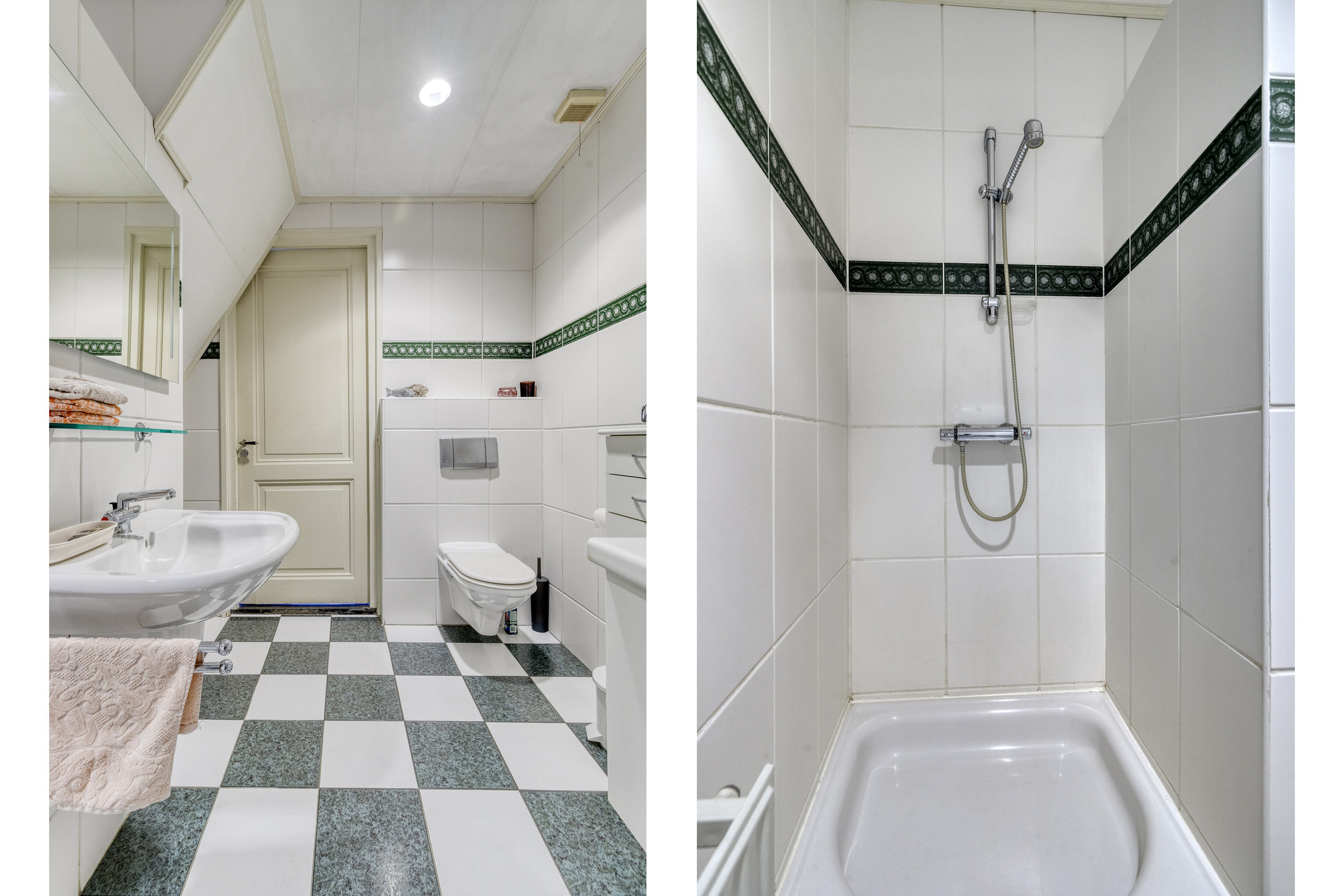 betegelde badkamer, voorzien van een wandcloset, ligbad, wastafel en douche;