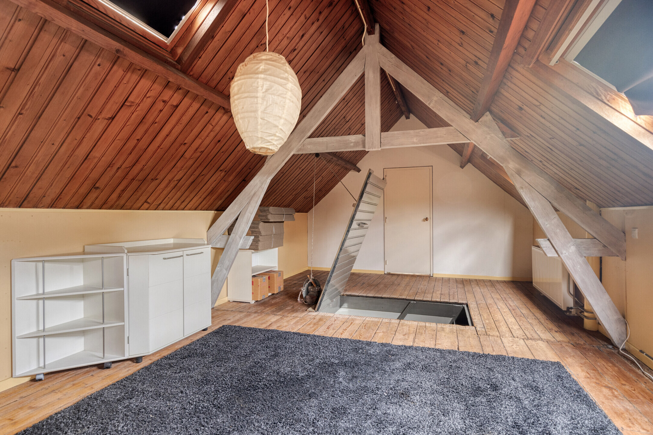 Logeerruimte (ca. 25 m²) met 4 Velux dakramen, houten vloer, dakbeschot in het zicht;