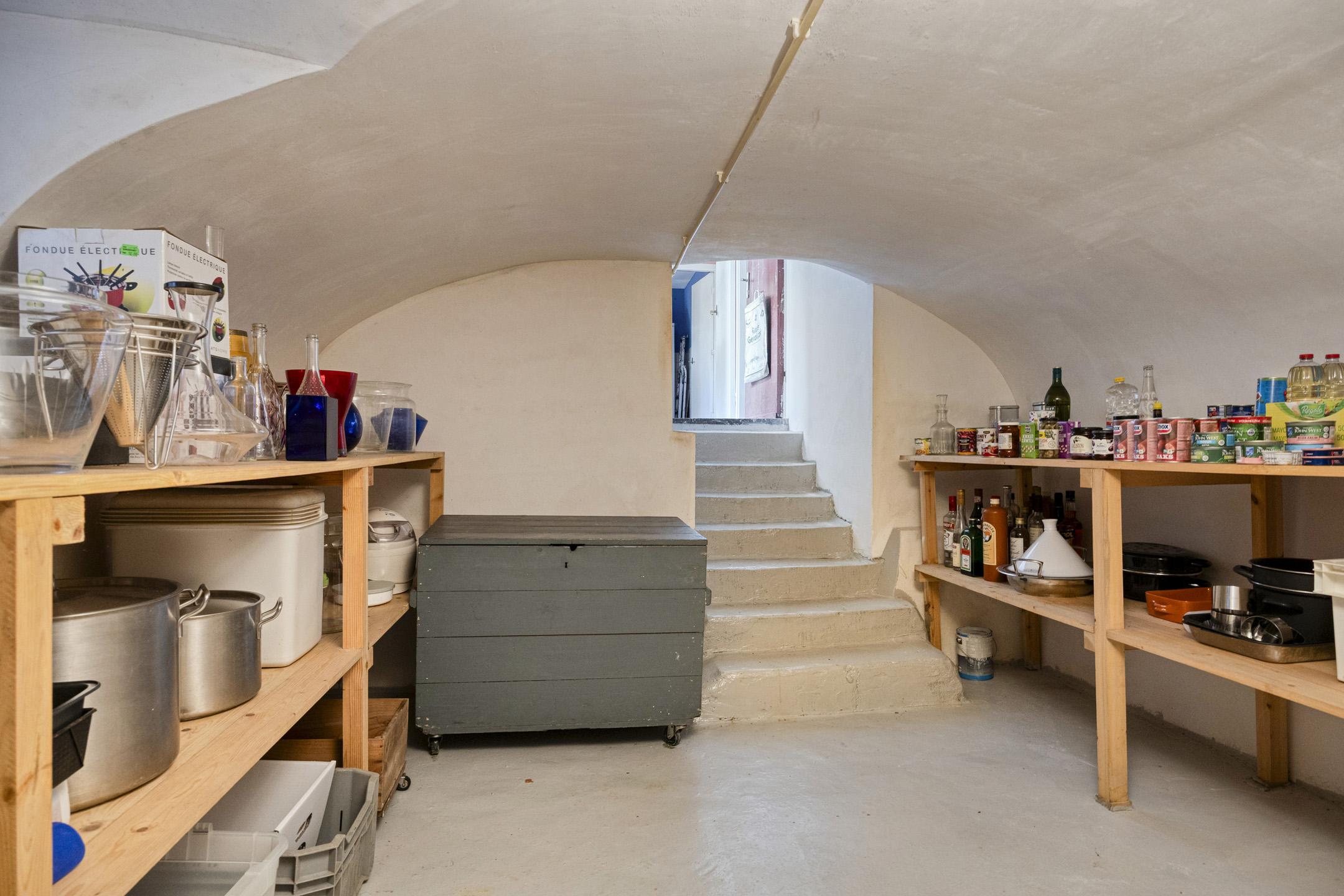 Internal studio located at the front of the farmhouse (approx. 87 m²), multifunctional and suitable for various purposes; equipped with a kitchenette, second staircase to the first floor, French doors to the garden/terrace, pedestrian door to the driveway; plastered walls, concrete floor partly finished with paving, exposed beam ceiling.
