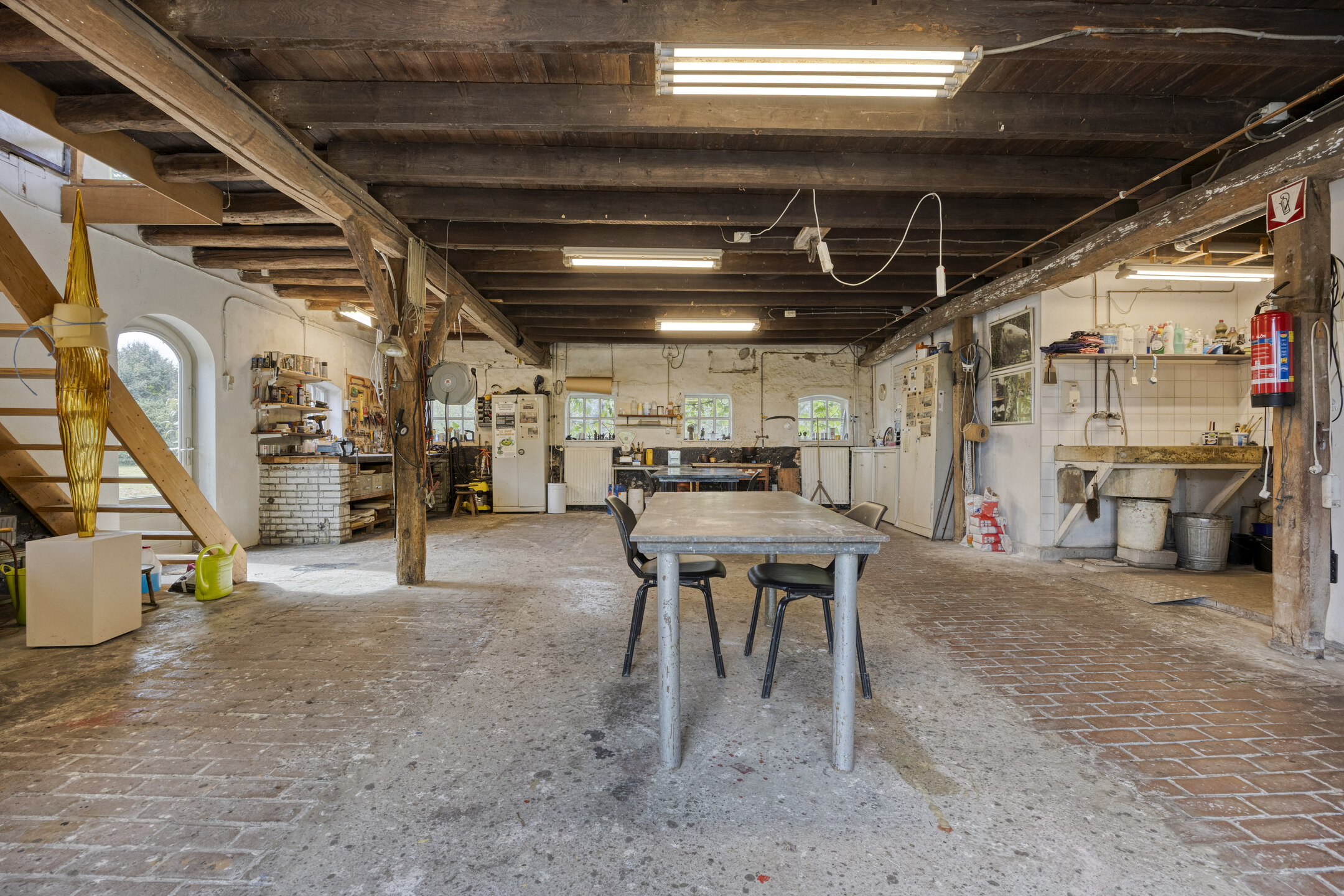 Outdoors, there are two spacious barns of approximately 302 m² and 49 m² respectively. The larger barn still showcases much of its original roof structure, with the full wooden framework visible—an impressively robust and characterful space, ideal for working but also perfect for hosting the occasional celebration.