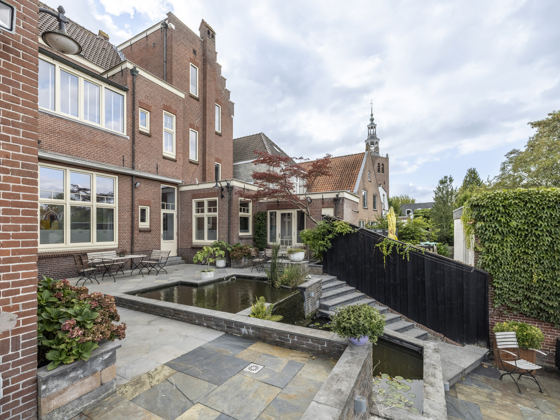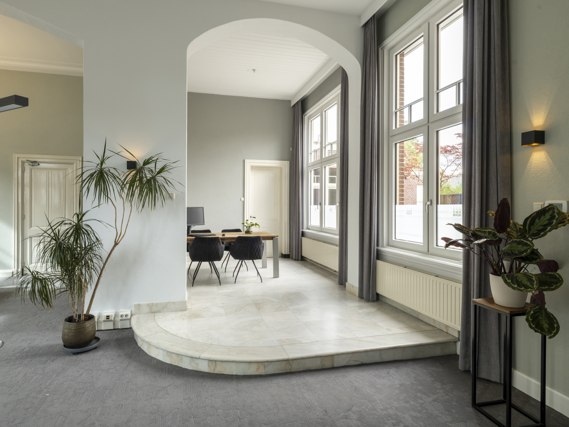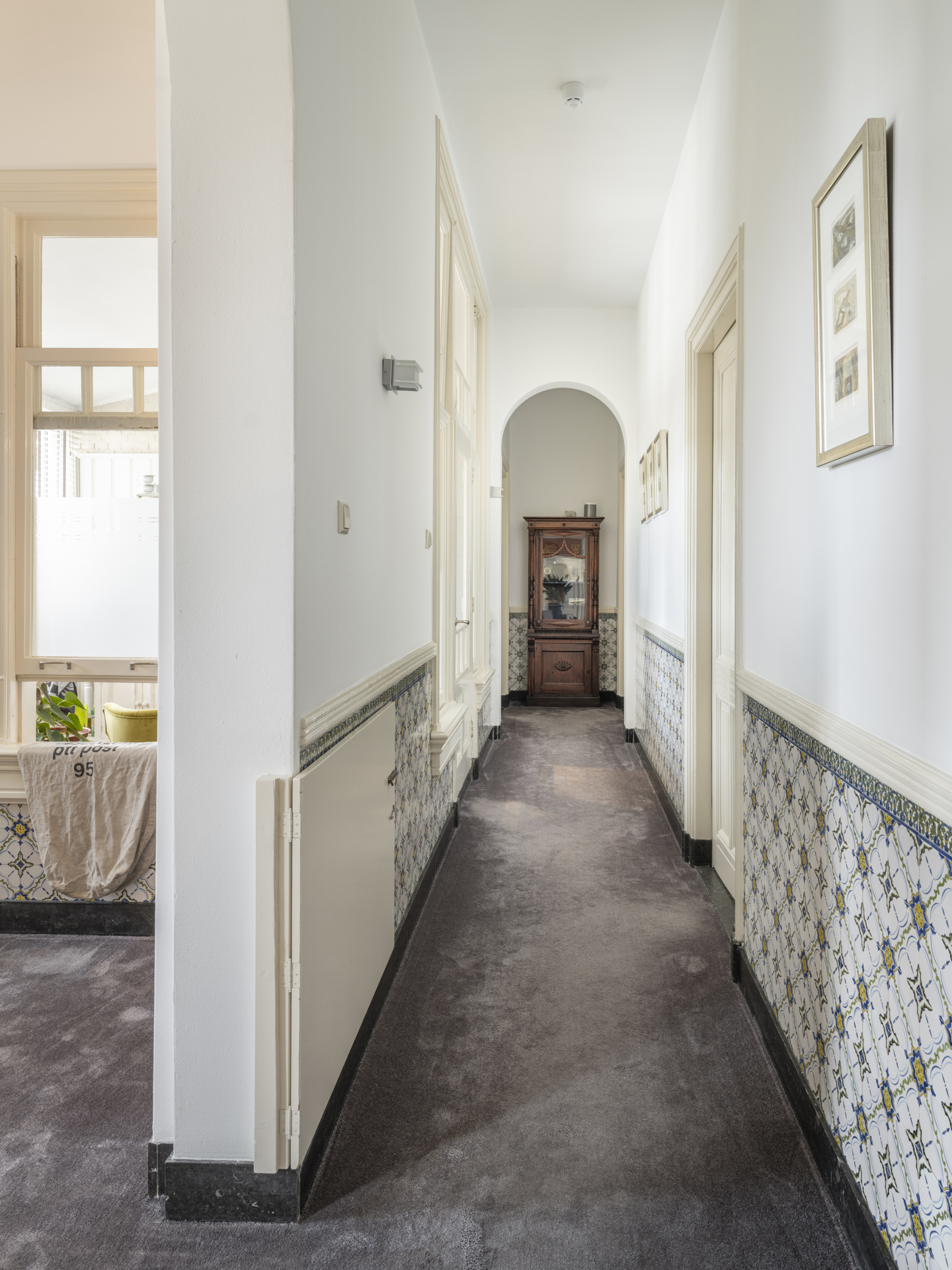 Period elements such as an original hardstone staircase, marble floors, intricate plasterwork, and leaded glass appear throughout. The flow of the home is anchored by a dramatic central hallway, with distinct living and working rooms branching off. Carefully updated, the villa marries heritage with modern comfort: high-grade insulation, HR++ double glazing, 23 solar panels, and three heating systems.