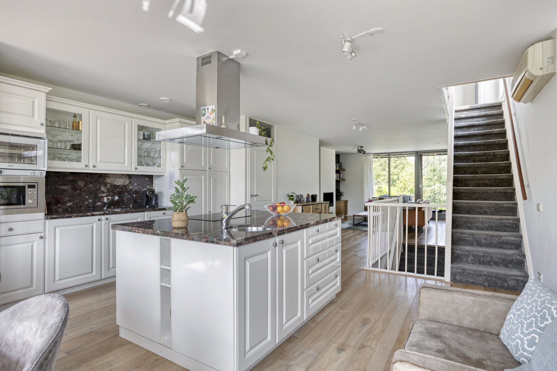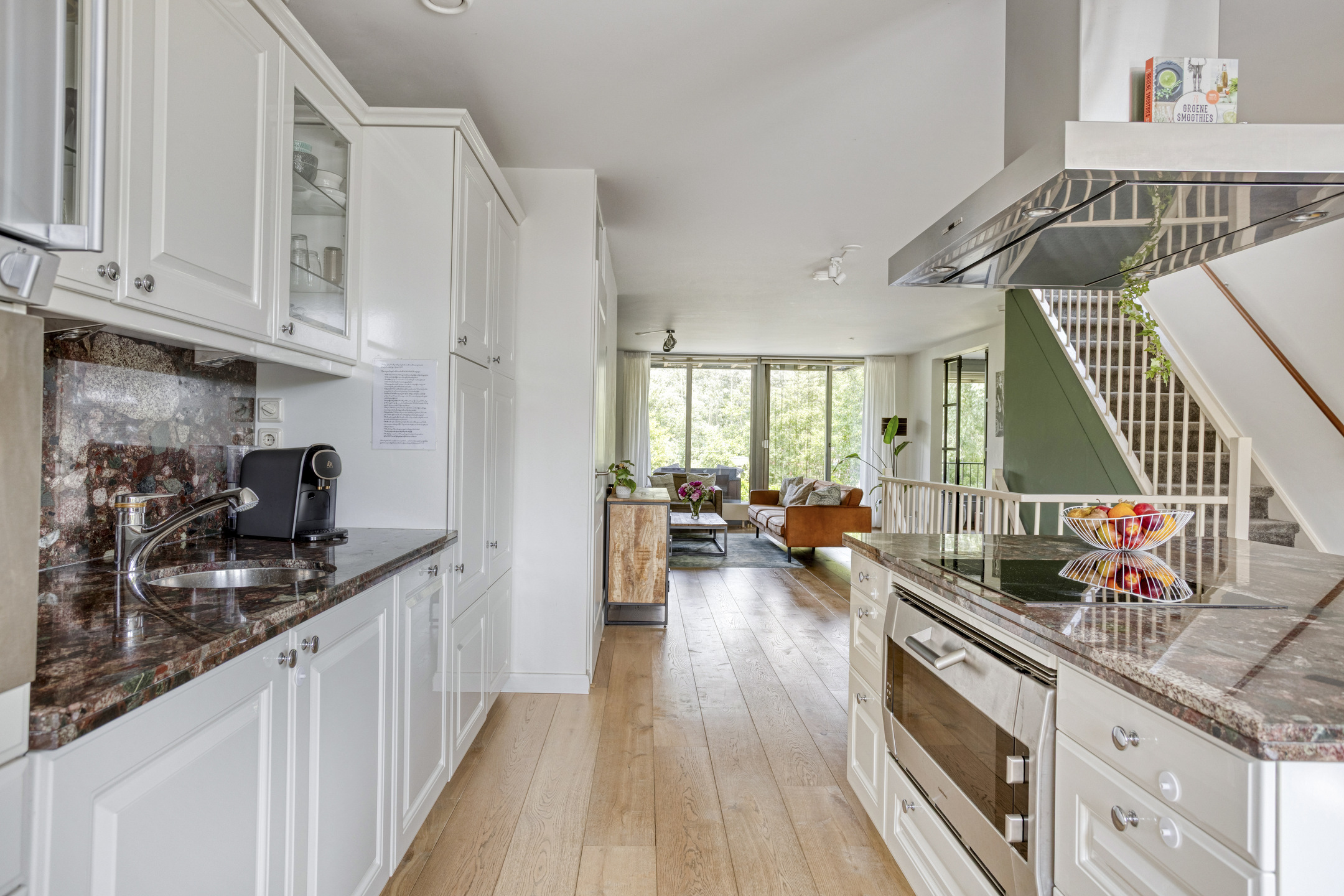 The living spaces are generously proportioned and filled with natural light thanks to large windows. Each residence has its own living room with views of the greenery surrounding the house. The kitchens are practically designed and connect well with the living areas. In total there are three modern bathrooms, and thanks to the distribution over four living levels there is always a quiet place to be found. The bedrooms are spread across all floors, offering space for large beds, desks and wardrobes. The current owners have maintained the property very well; the finish is sleek and contemporary. Thanks to HR++ glazing, aluminium window frames, roof, wall and floor insulation, and 12 solar panels, this home is also energy efficient (energy label A).