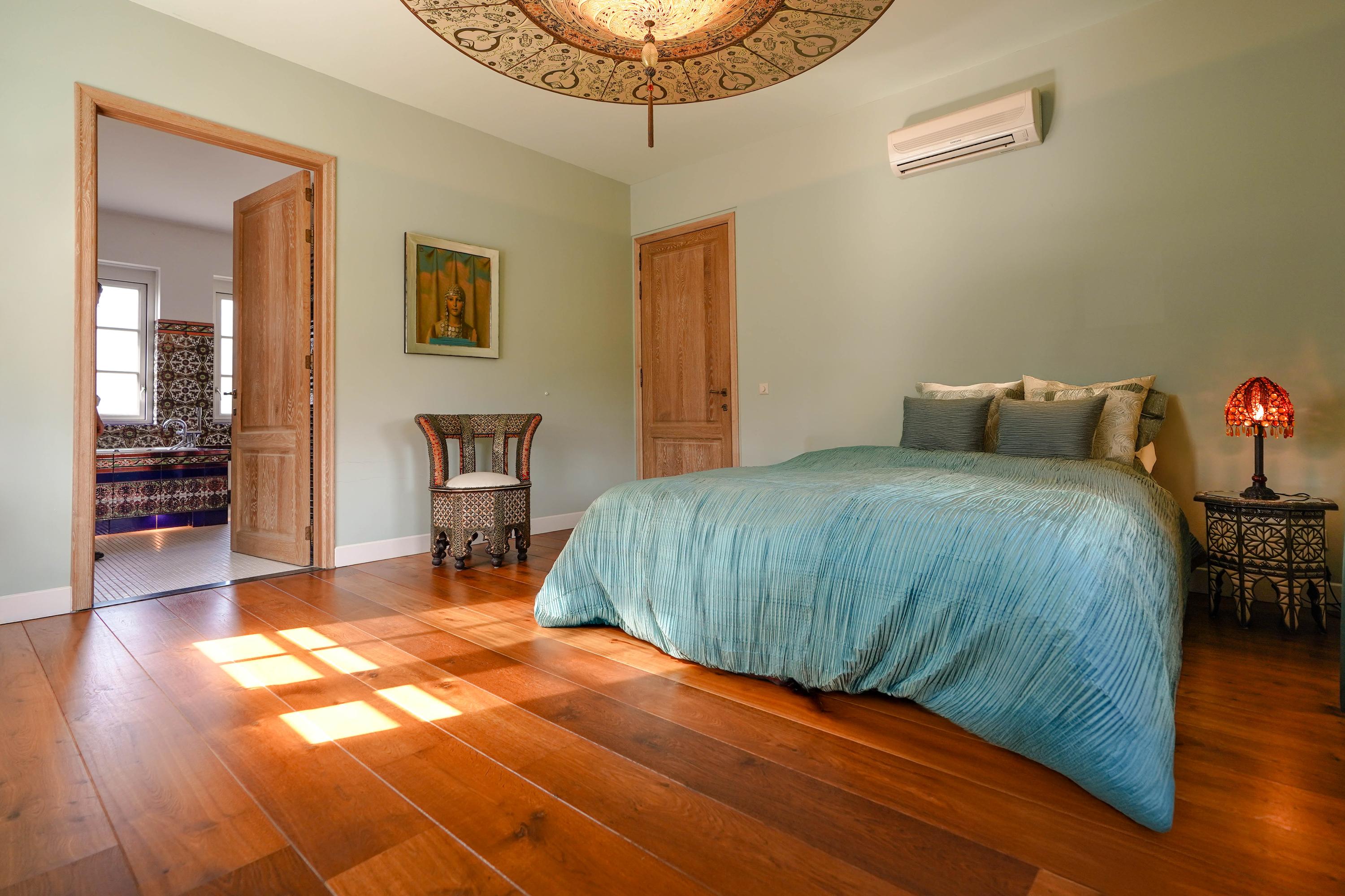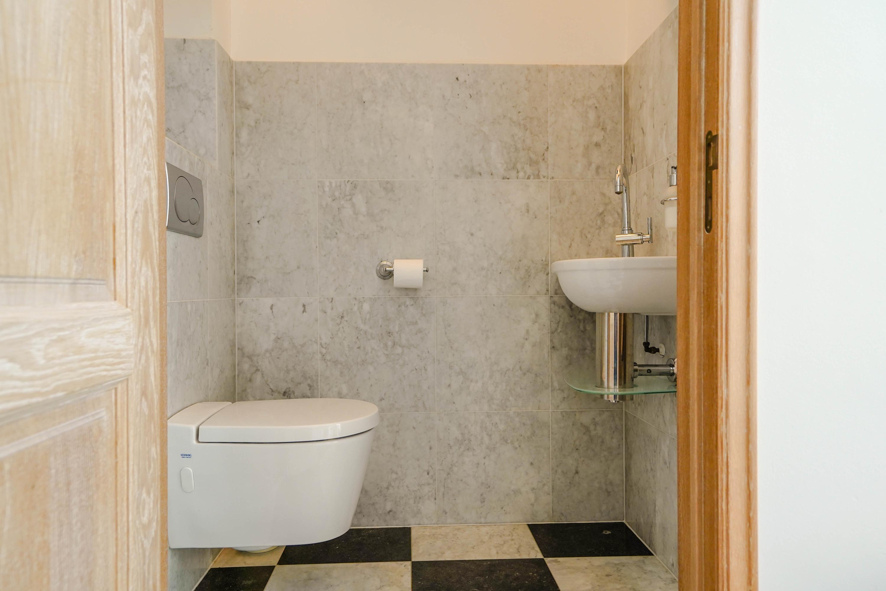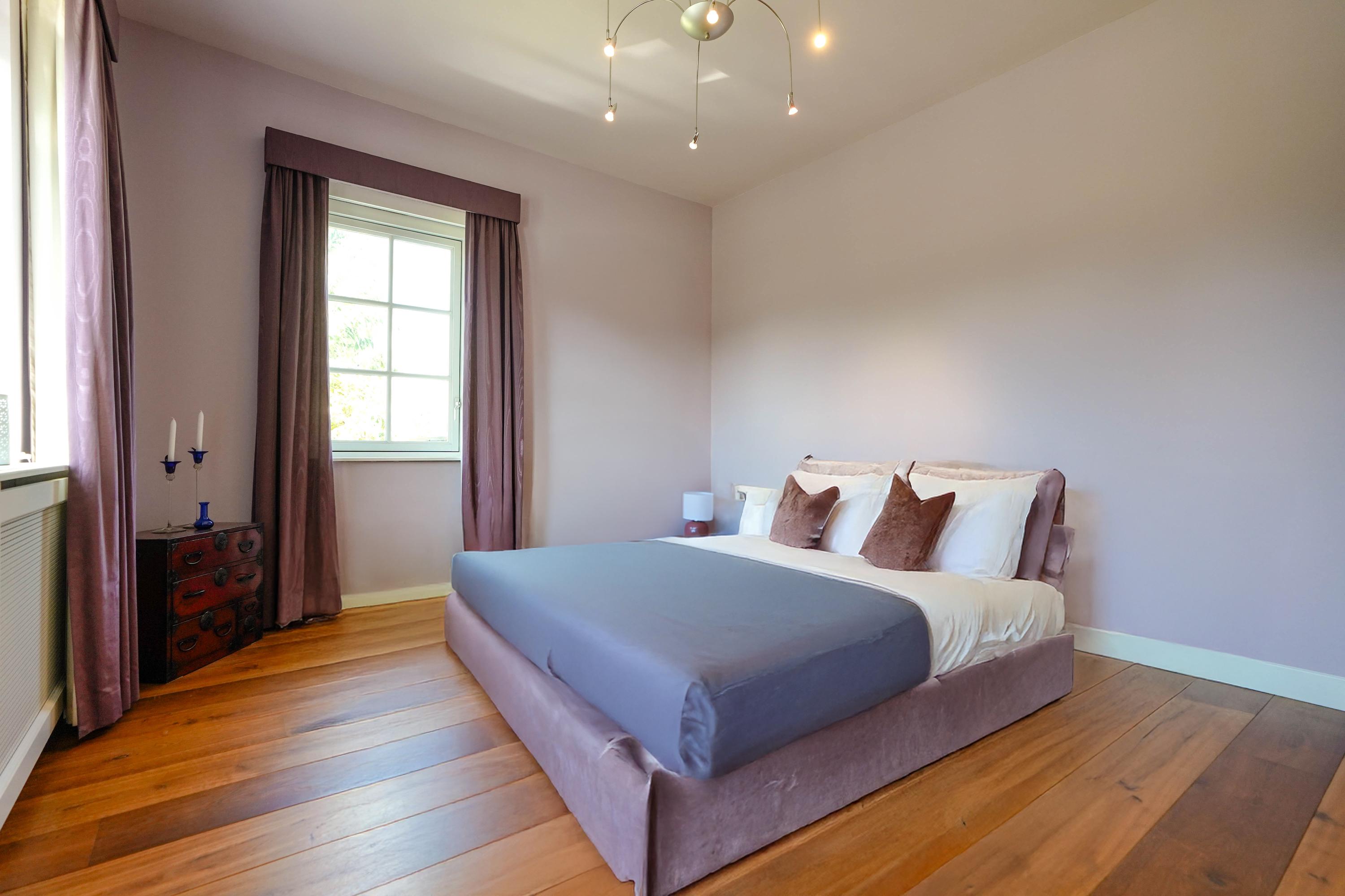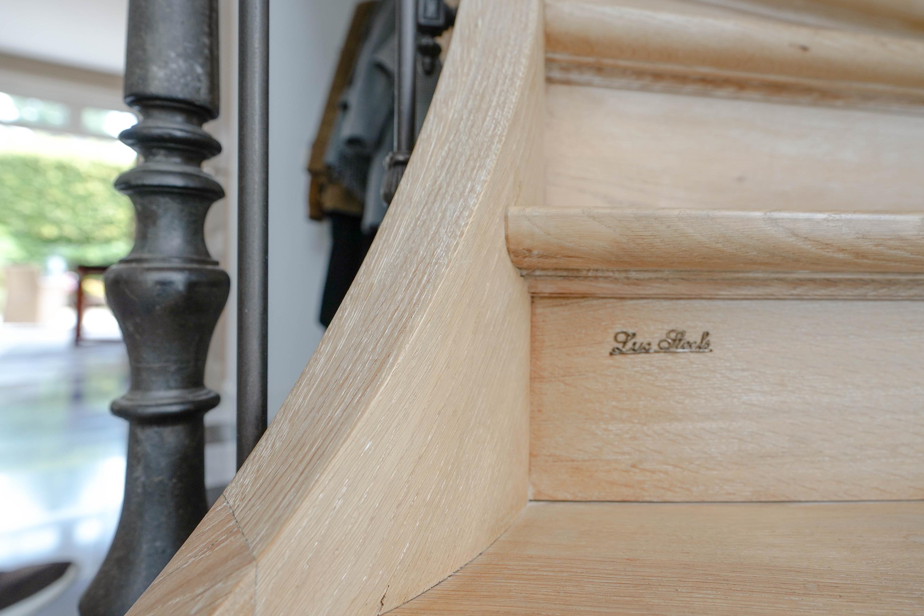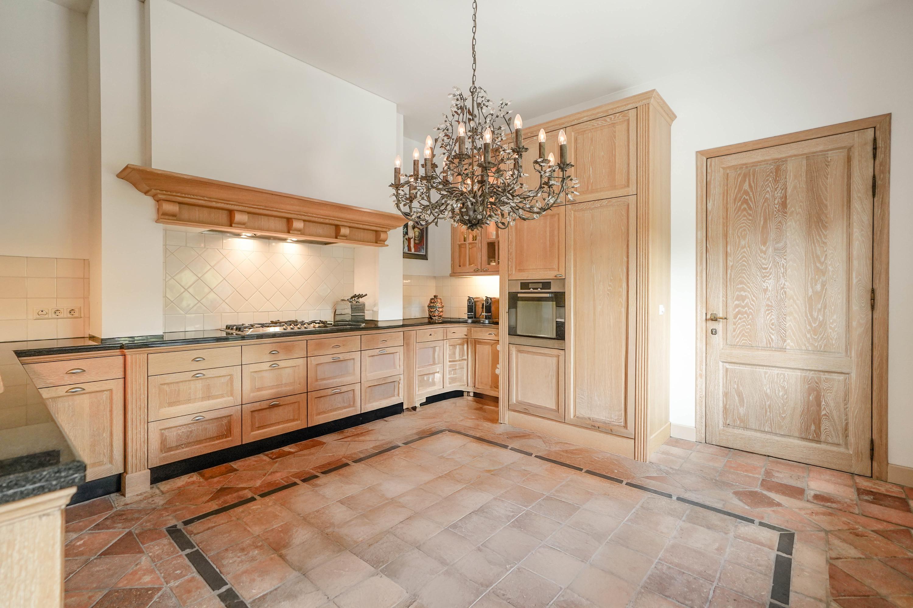 Los detalles arquitectónicos otorgan a esta villa un carácter verdaderamente distintivo: cuatro ventanales arqueados, una fachada central acristalada curva, ladrillos formados a mano y una robusta puerta principal de roble con herrajes forjados a medida. El interior está impregnado de materiales cuidadosamente seleccionados, realzados por una escalera escultórica de roble diseñada por Luc Steels, suelos macizos de madera y una transición fluida entre los espacios habitables. La luz irradia a través de tragaluces y amplias fachadas acristaladas, creando una atmósfera luminosa en toda la casa.