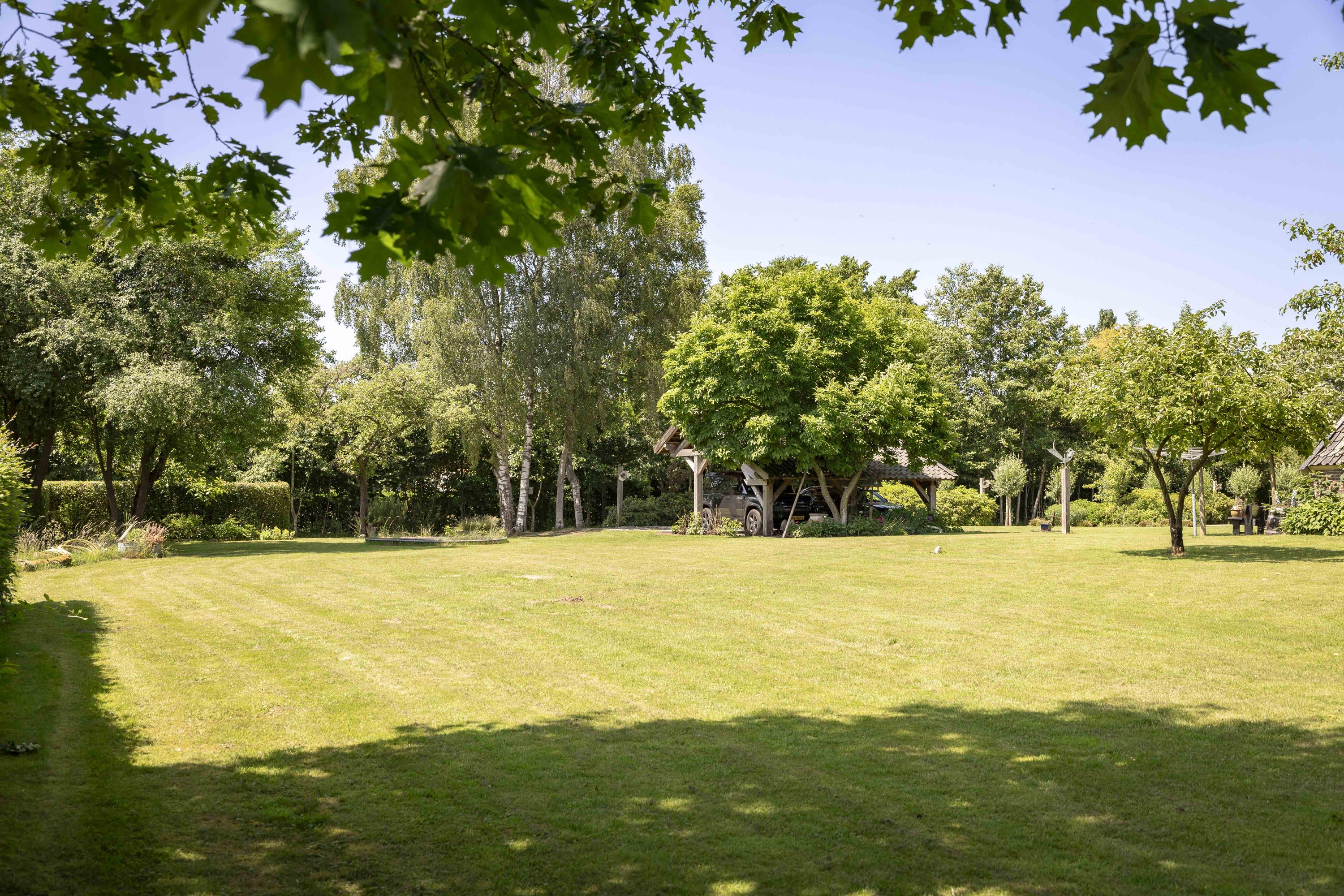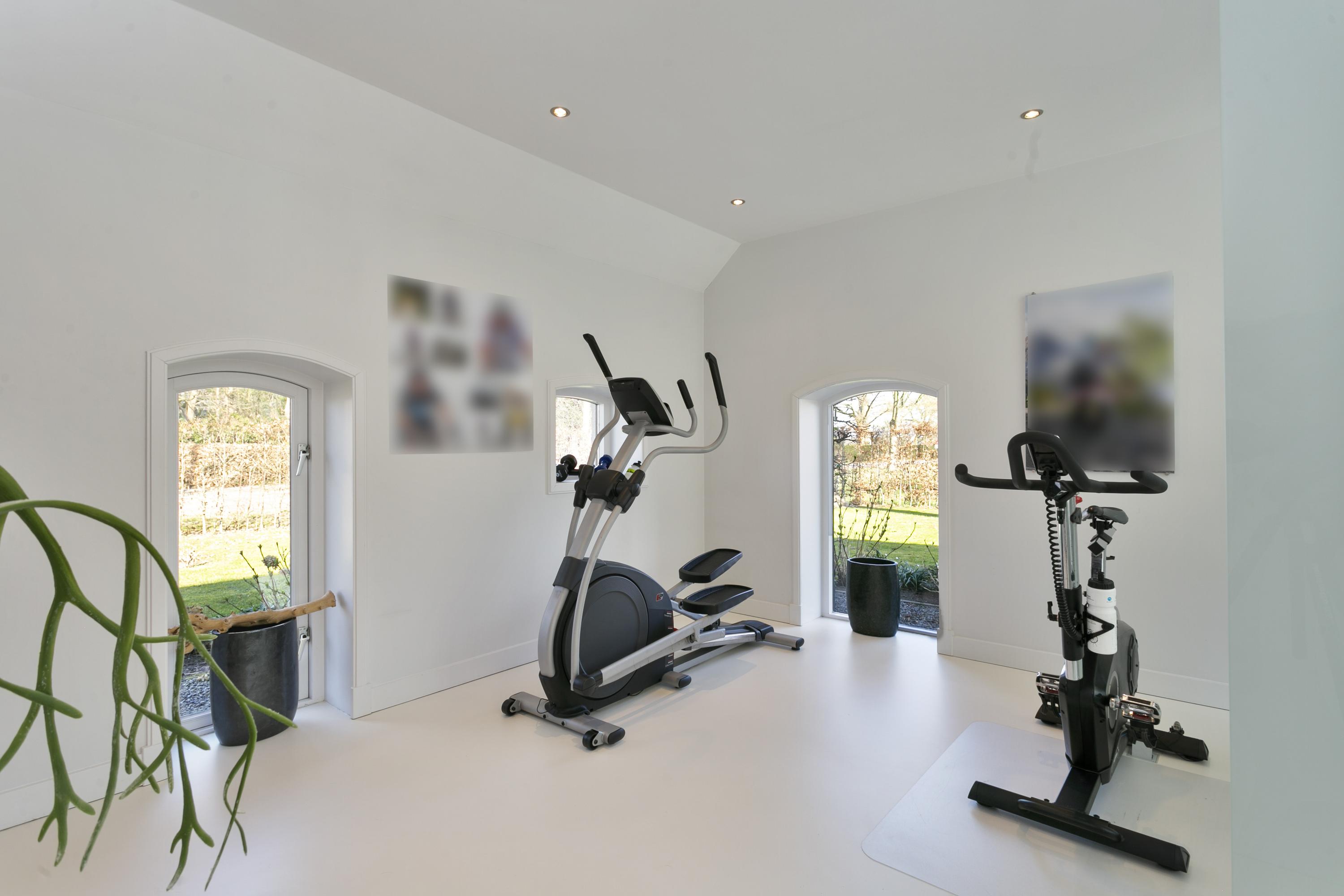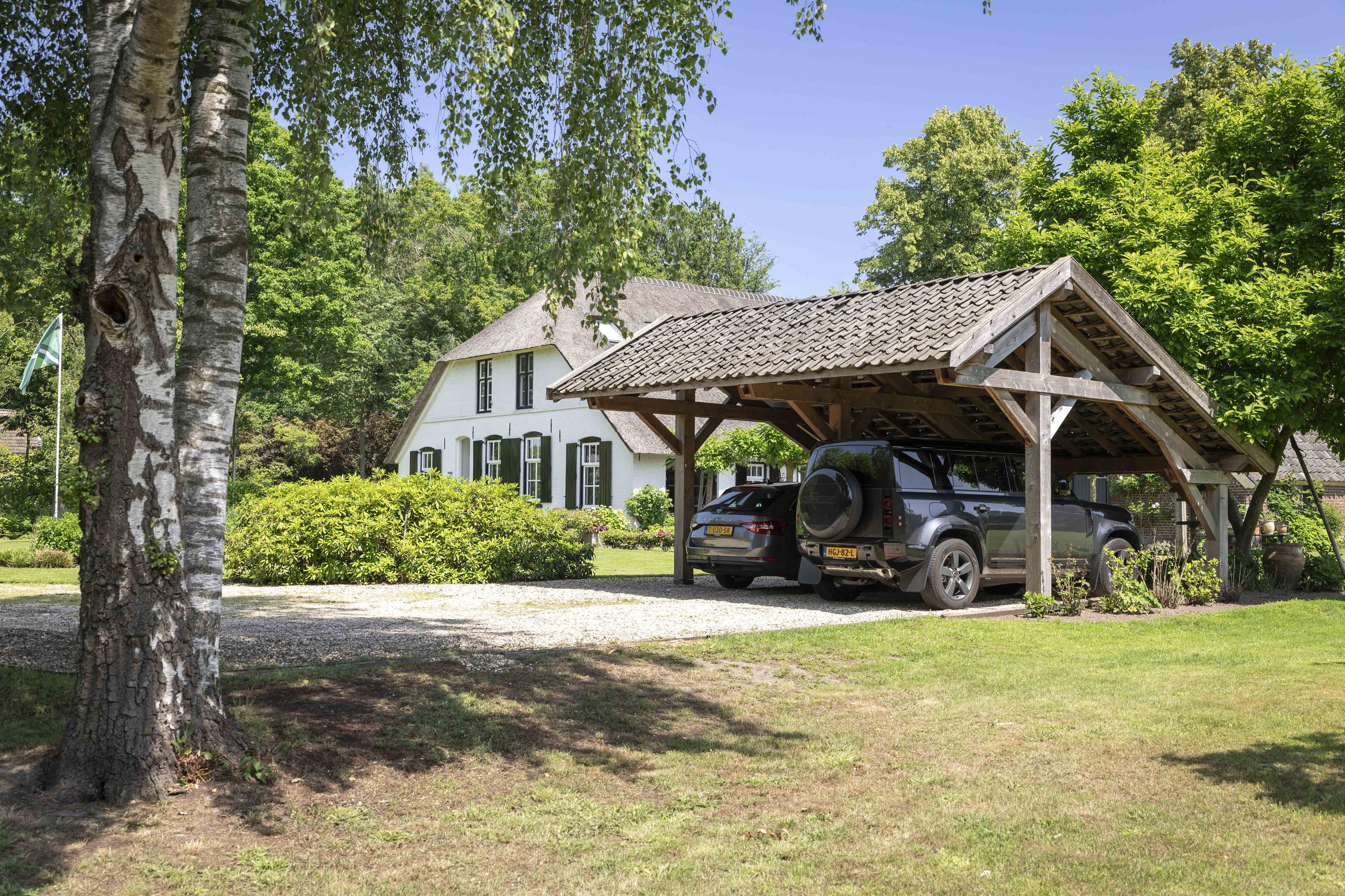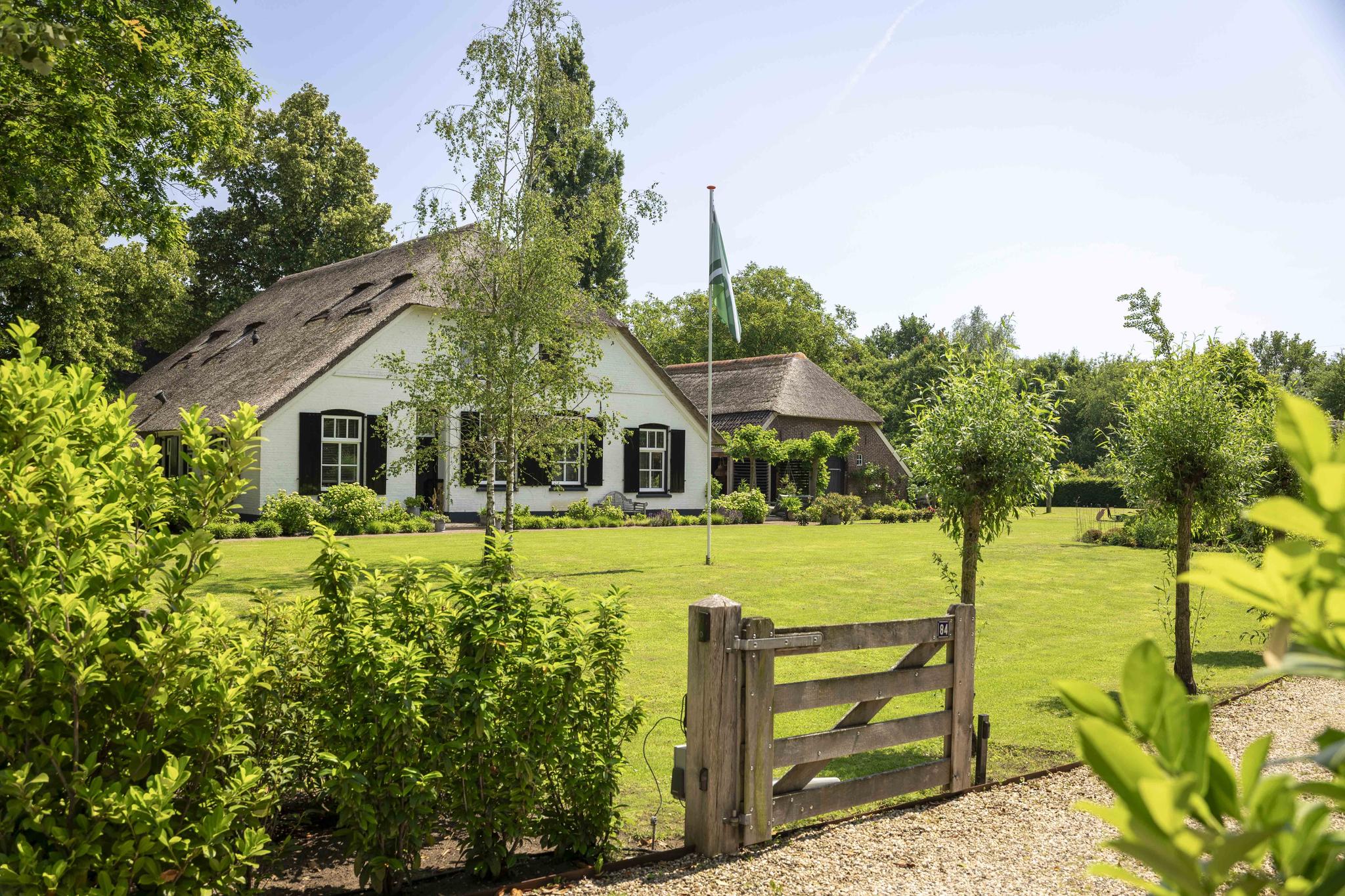 La disposición de espacios incluye un elegante despacho doble, una zona de gimnasio y bienestar, y una planta superior con suelos de nogal donde se ubica una suite principal de 50 m² con vestidor y baño en suite. La vida exterior se disfruta en terrazas soleadas, setos formales, prados frutales y acceso directo a la ribera del canal de Twente. Las dependencias adicionales muestran construcción tradicional en ladrillo y un doble garaje cubierto, ampliando las posibilidades de la propiedad.