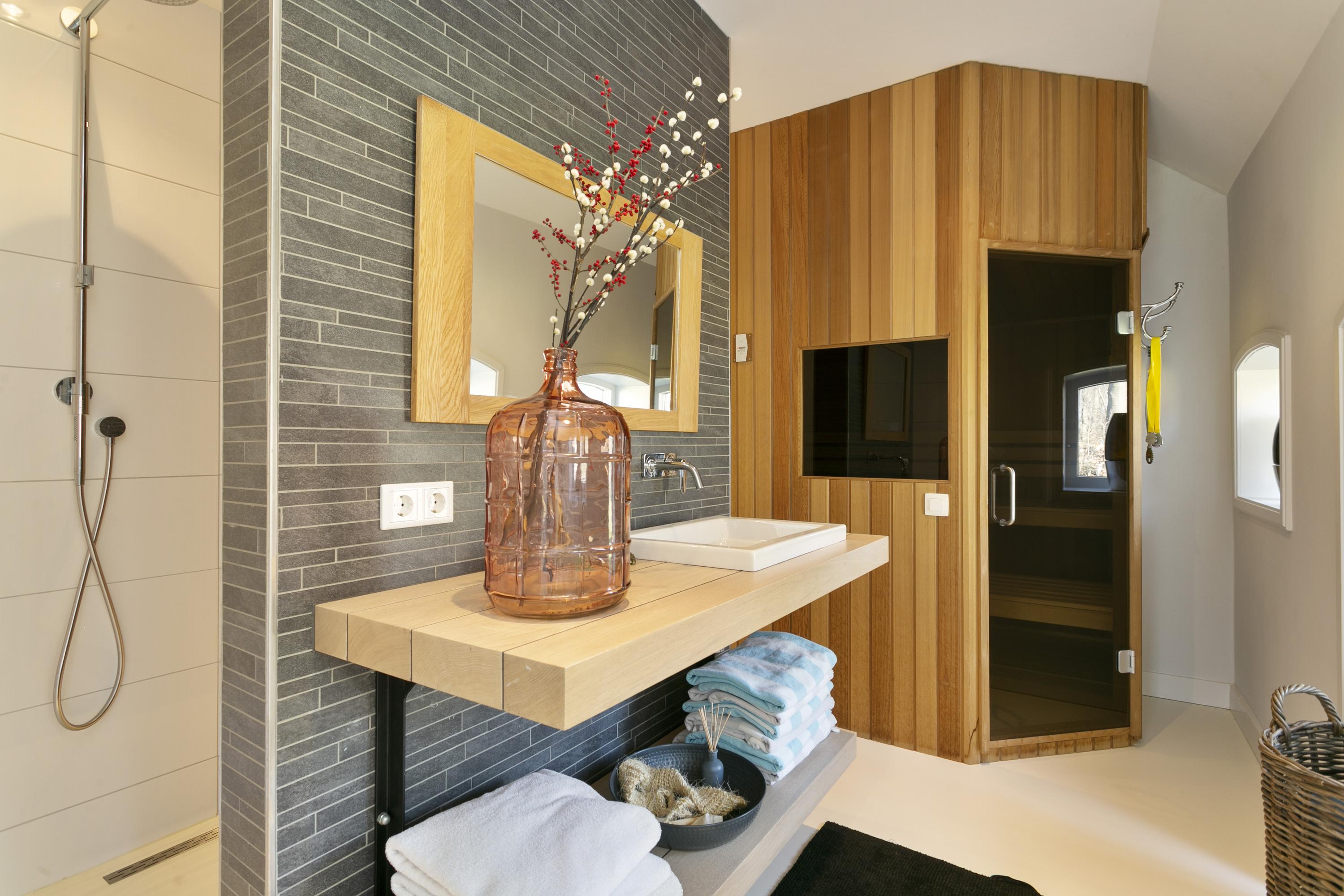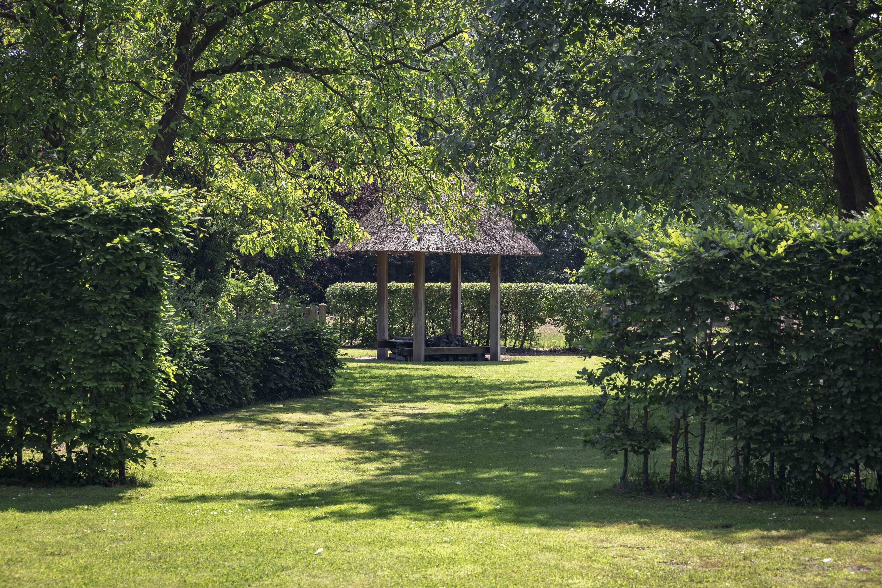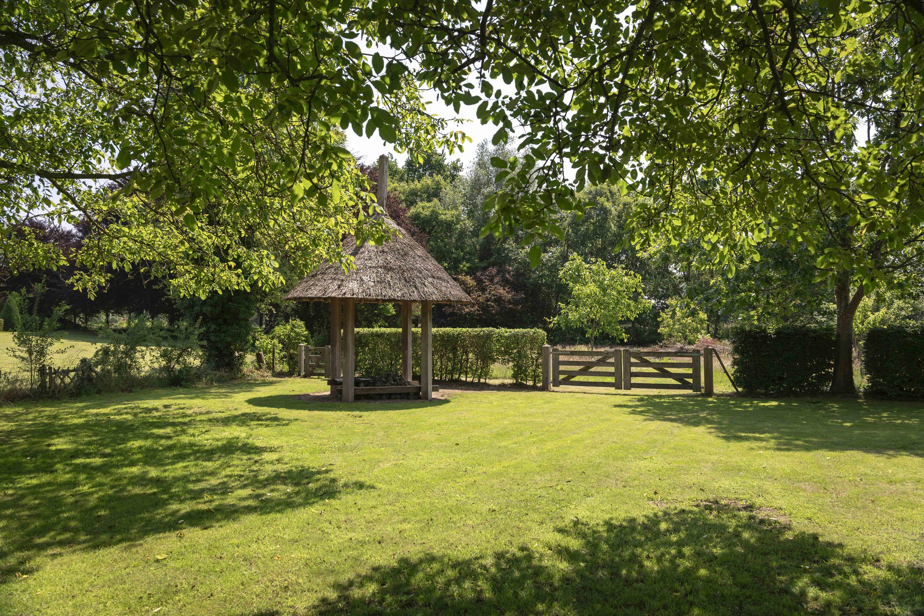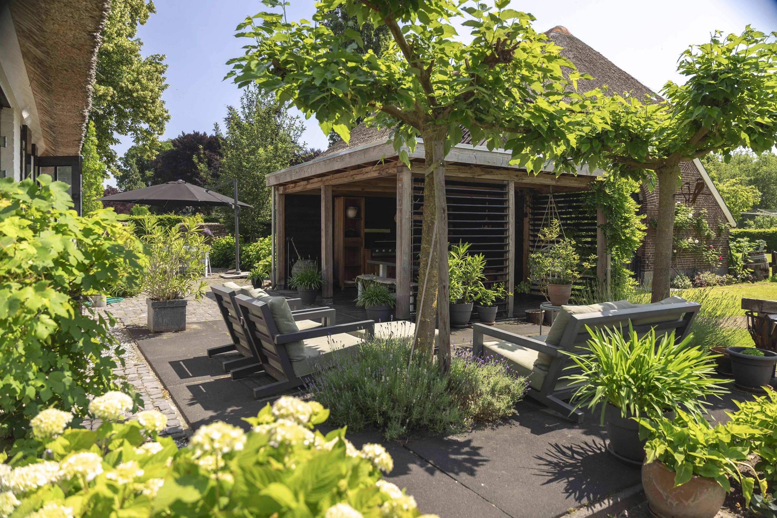 La disposición de espacios incluye un elegante despacho doble, una zona de gimnasio y bienestar, y una planta superior con suelos de nogal donde se ubica una suite principal de 50 m² con vestidor y baño en suite. La vida exterior se disfruta en terrazas soleadas, setos formales, prados frutales y acceso directo a la ribera del canal de Twente. Las dependencias adicionales muestran construcción tradicional en ladrillo y un doble garaje cubierto, ampliando las posibilidades de la propiedad.