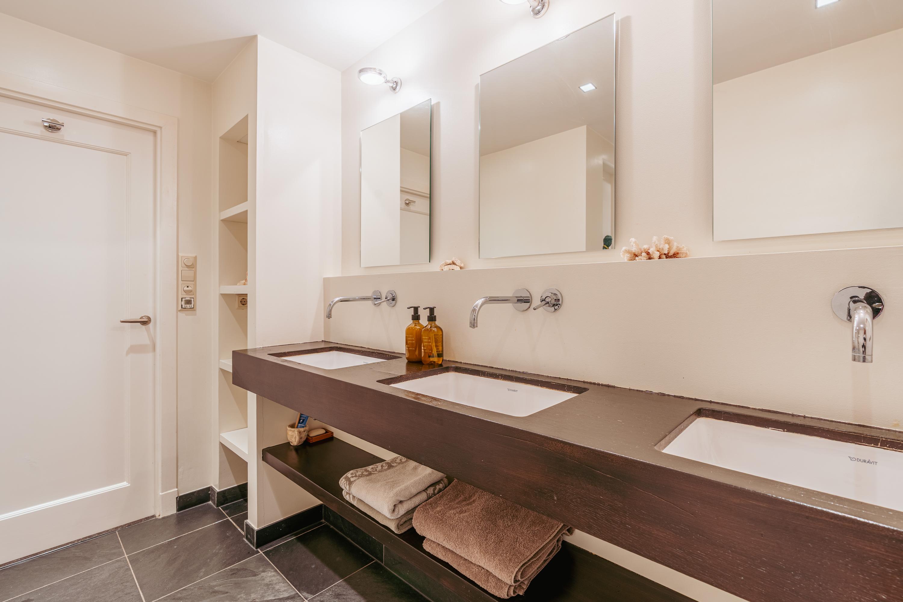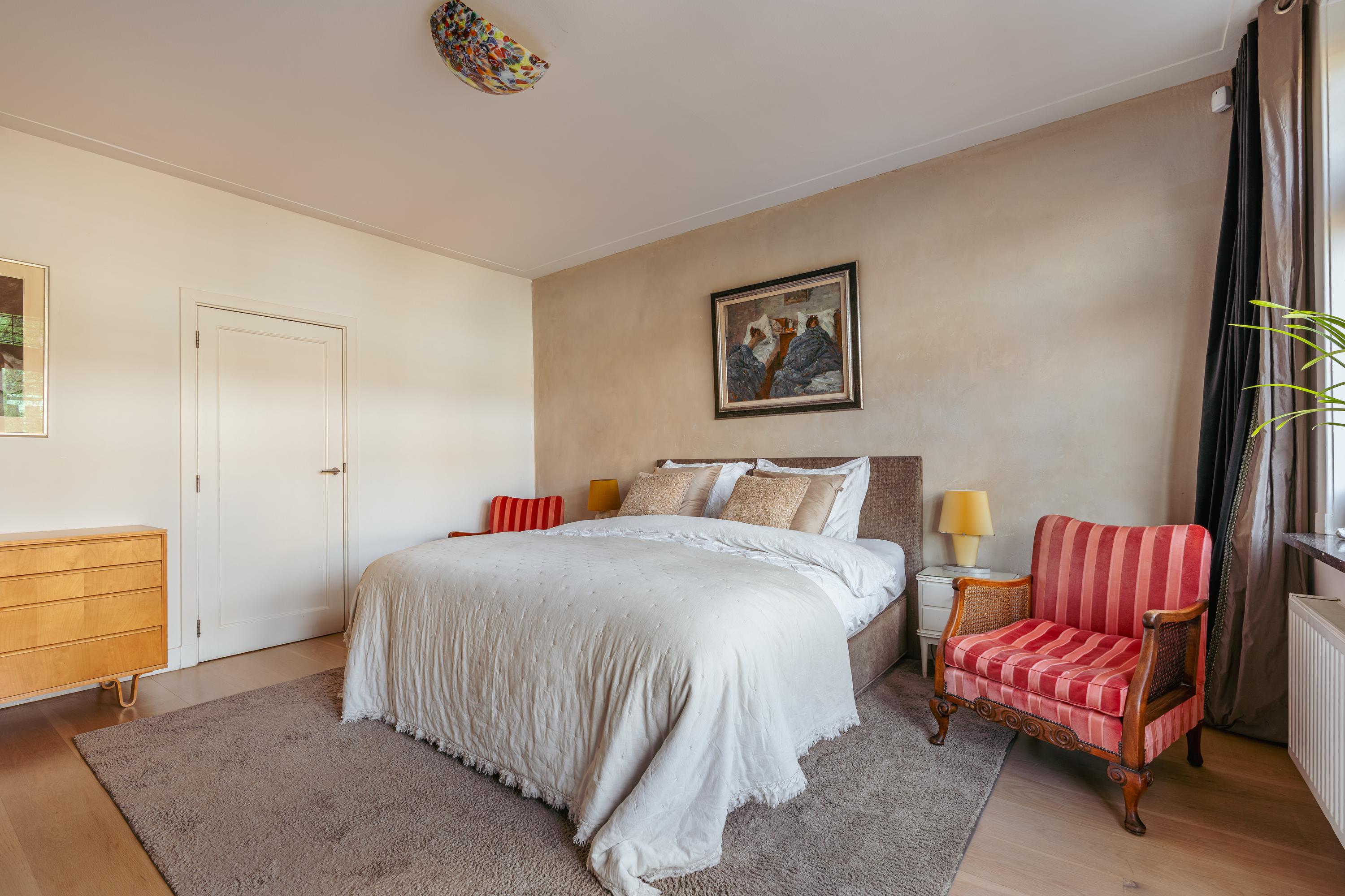 En las plantas superiores se ubican los amplios dormitorios, entre ellos la suite principal con armarios a medida y balcón privado. Los múltiples baños aseguran comodidad e intimidad. La planta superior destaca por su abundante luz natural y su impresionante altura de techos, ideal tanto para trabajar como para relajarse. Acabados de alta calidad, una ventana de techo "dakraam" para una mayor iluminación y medidas de aislamiento como "dakisolatie" y doble acristalamiento contribuyen al confort de la propiedad.
