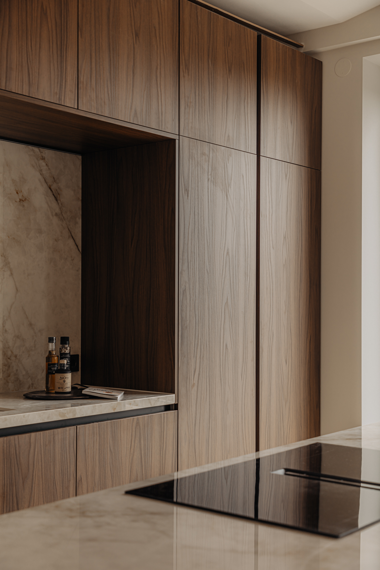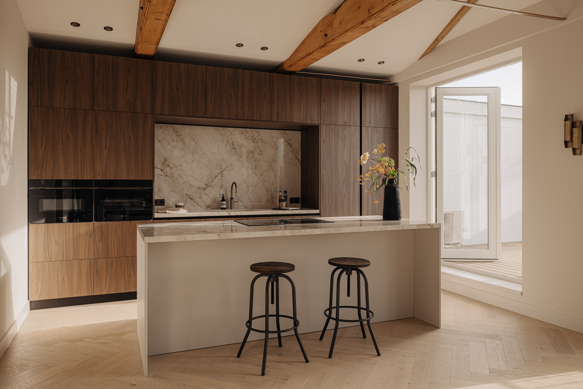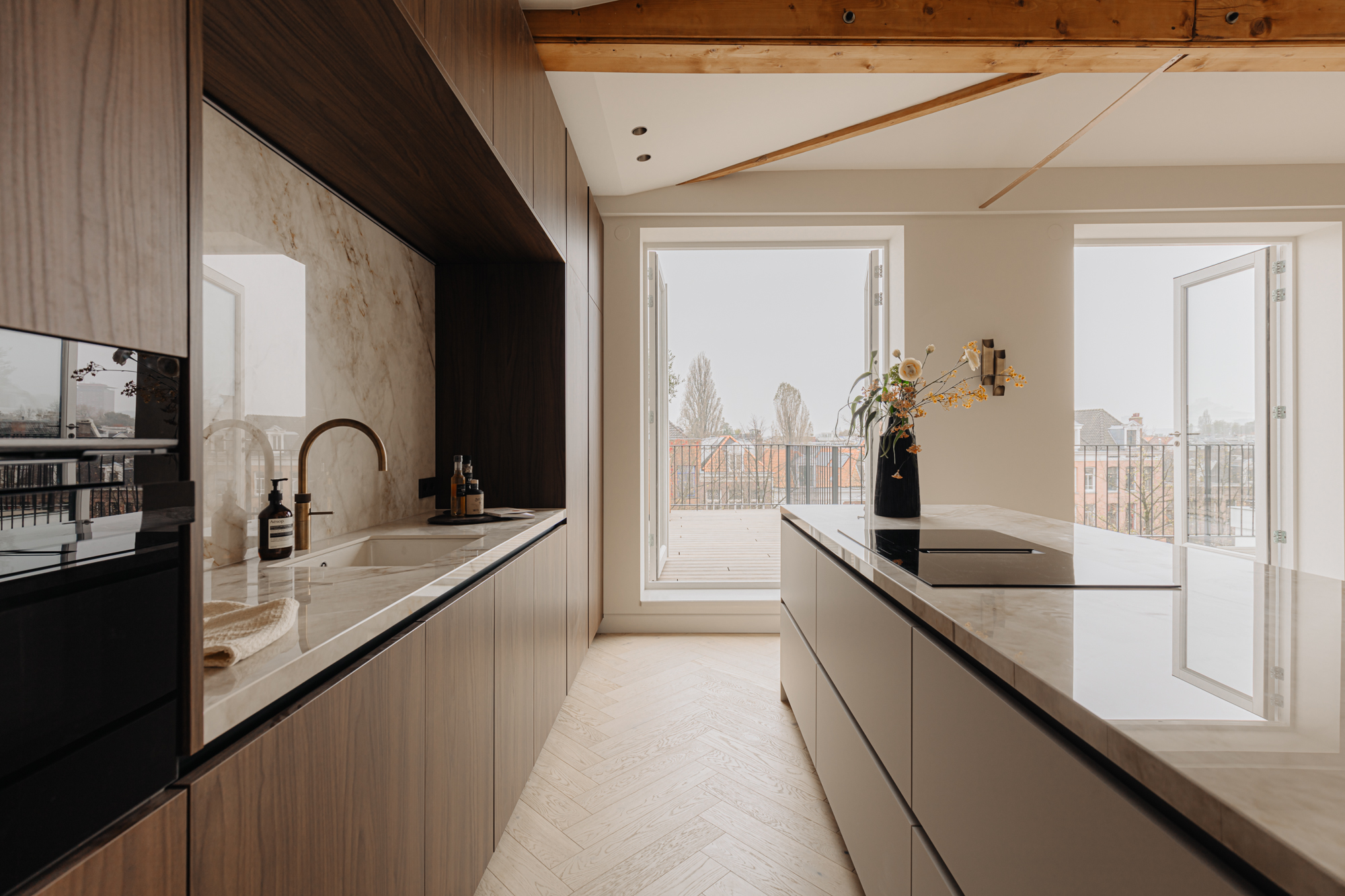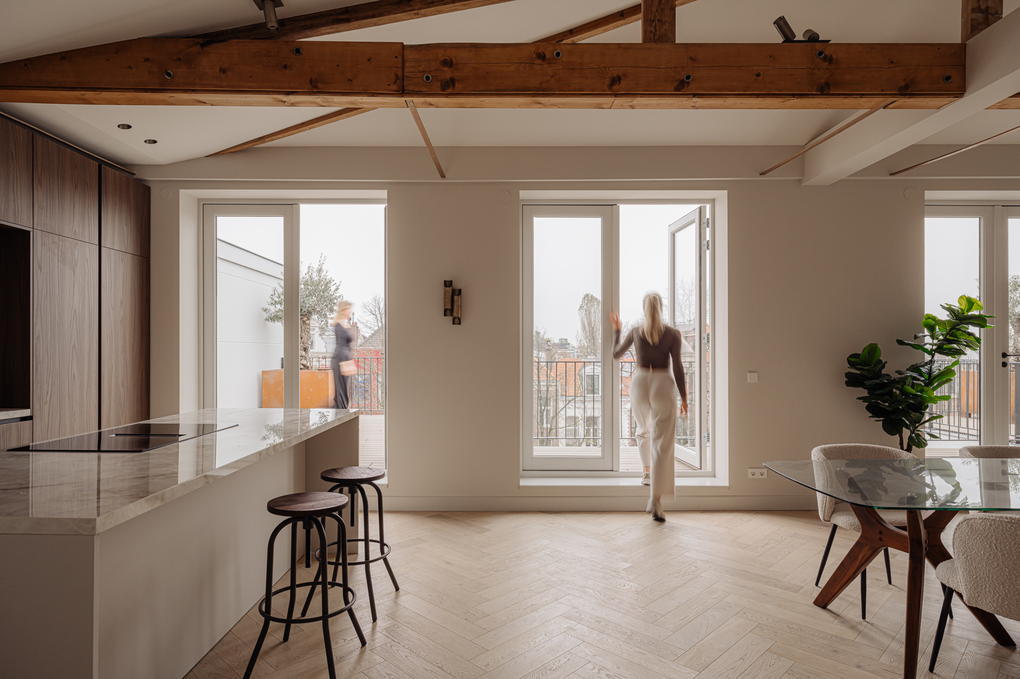 La cocina de diseño italiano, terminada con encimeras de mármol y detalles en nogal, se integra de forma natural en el espacio abierto, equilibrando estilo y funcionalidad. Puertas dobles conducen a la terraza, inundando el apartamento de luz y proporcionando un espacio exterior privado en pleno corazón de De Pijp.