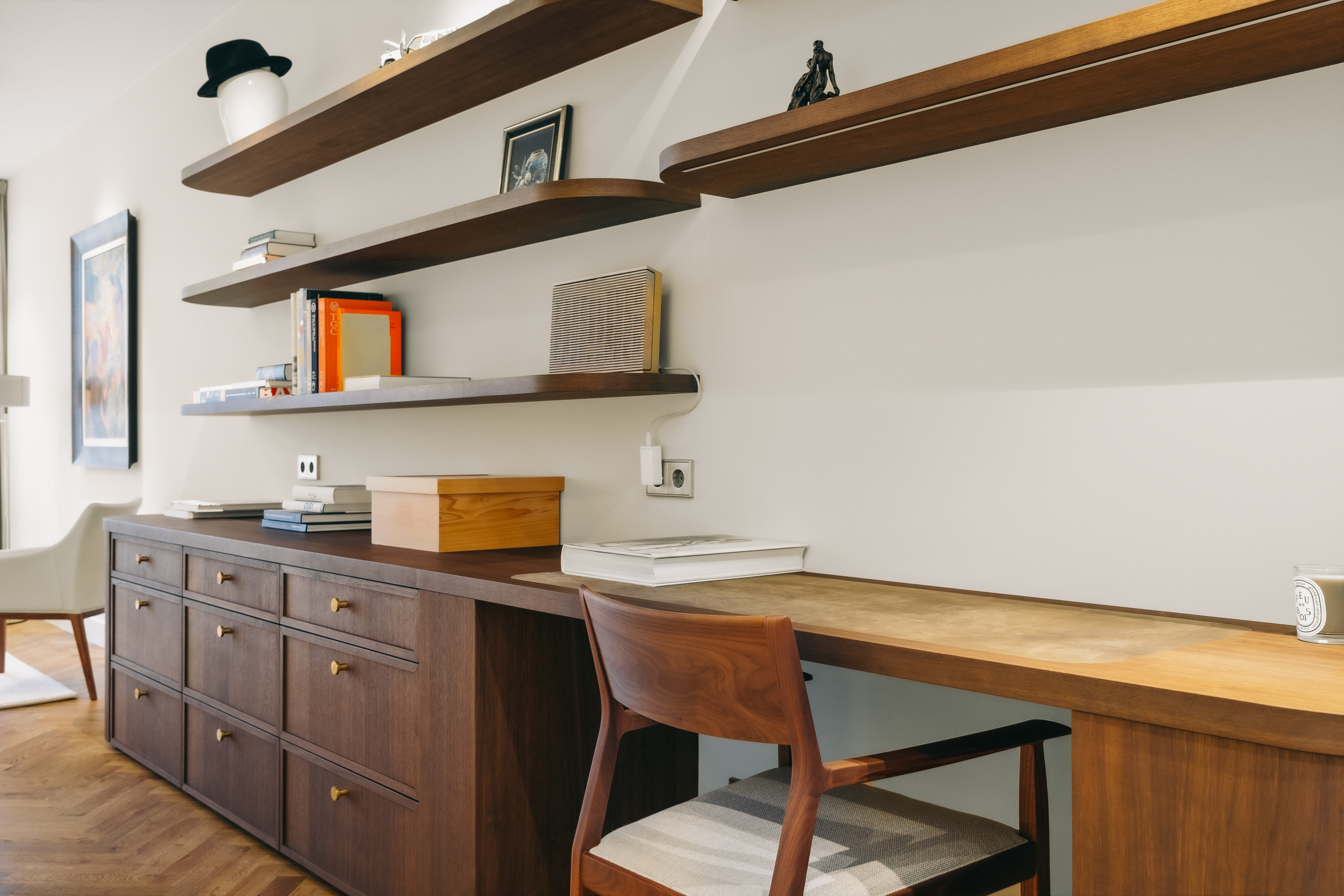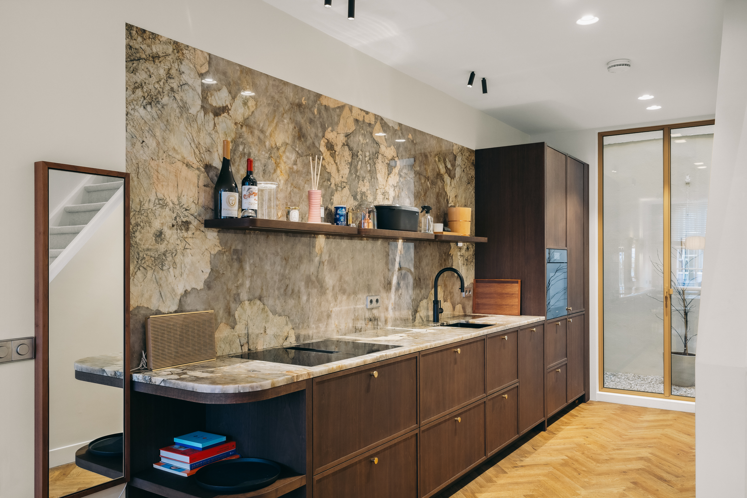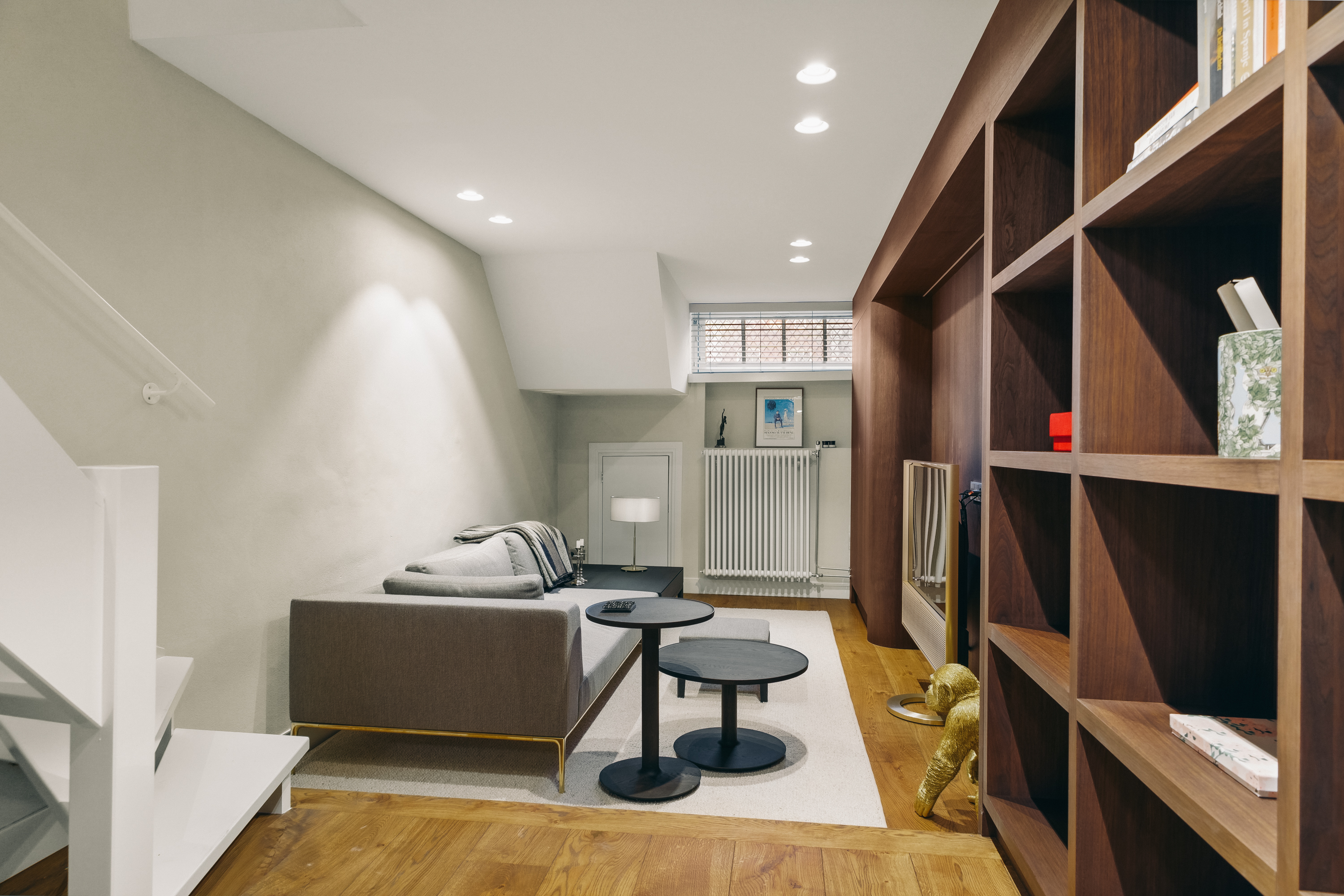 En la planta sótano, se encuentra una zona de estar sosegada con almacenaje hecho a medida en madera noble y una amplia sala de servicios equipada para las necesidades cotidianas. Subiendo, la primera planta presenta un elegante salón caracterizado por ventanales amplios y una pared revestida en nogal, ideal para exposición o trabajo. En las plantas superiores se encuentra un dormitorio espacioso, baño revestido en travertino con suelo radiante y un vestidor luminoso gracias a un tragaluz y acondicionado con aire.