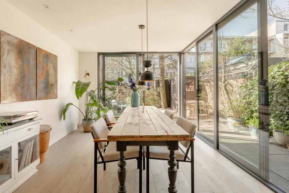 El apartamento en Ámsterdam, ubicado en Bos en Lommer, presenta un equilibrio discreto de luz, espacio y diseño funcional. Esta vivienda en planta baja, de aproximadamente 120 m², le da la bienvenida con una entrada privada y un ambiente de calma en la tranquila Kijkduinstraat. El salón se percibe amplio, inundado de luz a través de grandes ventanales, y se conecta de forma fluida con una moderna cocina diáfana, instalada en 2021 y equipada con electrodomésticos empotrados de última generación.