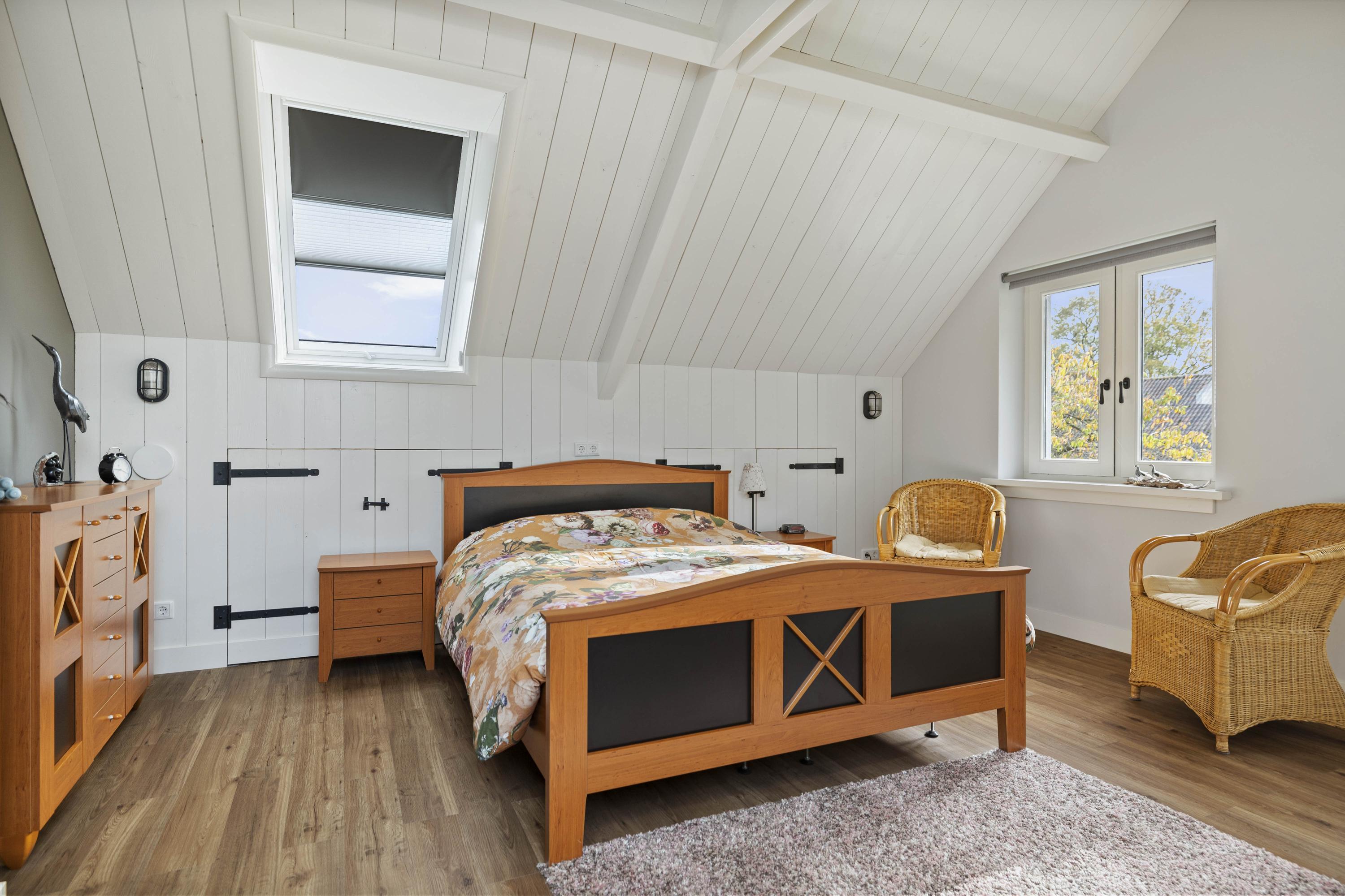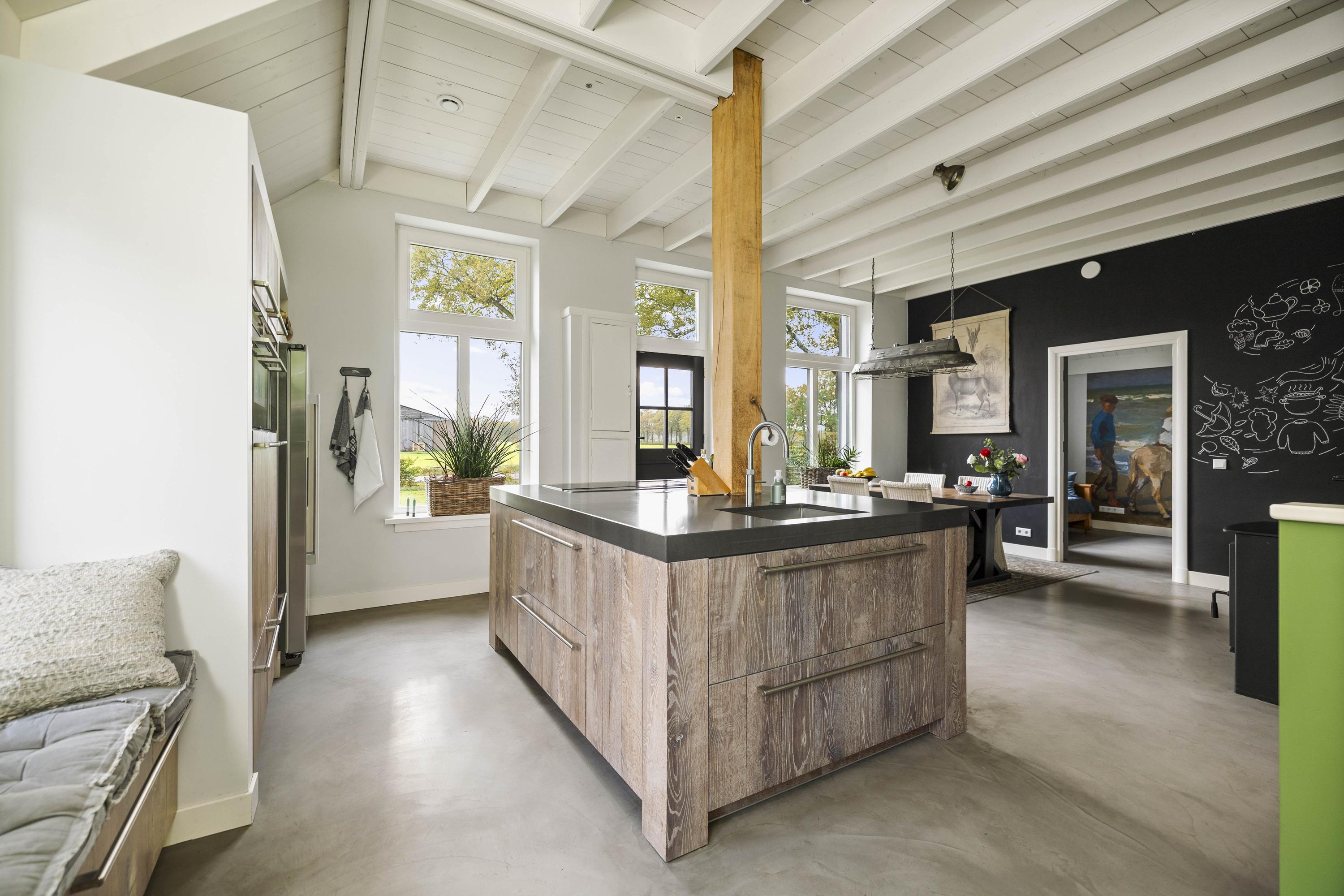 La superficie habitable de 256 m² se despliega en estancias acogedoras: la carpintería en tonos pizarra se combina con fachadas encaladas en una paleta tan eficaz como elegante. Materiales naturales—roble, metal, cerámica y hormigón Ciré—definen los interiores, donde la sensibilidad del diseño neerlandés enriquece la arquitectura agrícola centenaria. Además de un ritmo visual y lumínico placenteros, destacan elementos a medida como la cocina de Scheffer Keukens Zelhem, con gruesas encimeras de material compuesto y electrodomésticos de altas prestaciones, y un salón que conserva guiños al antiguo granero, ahora transformado por grandes cristaleras y una estufa de leña FreeFlow.