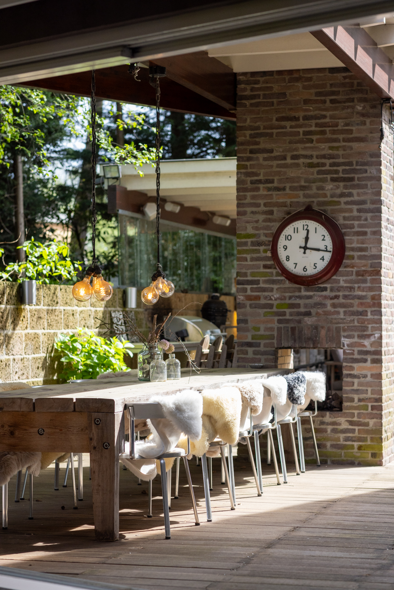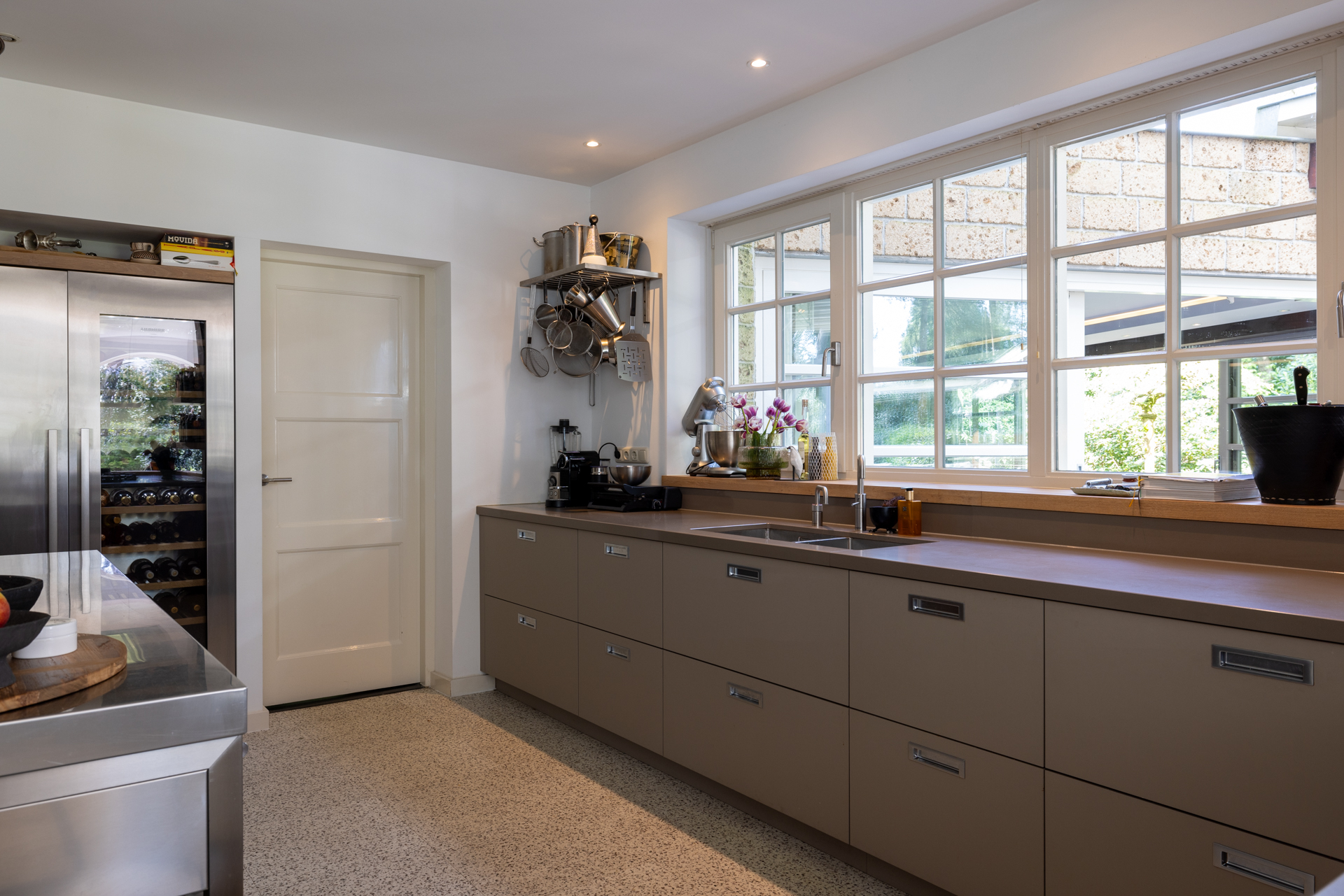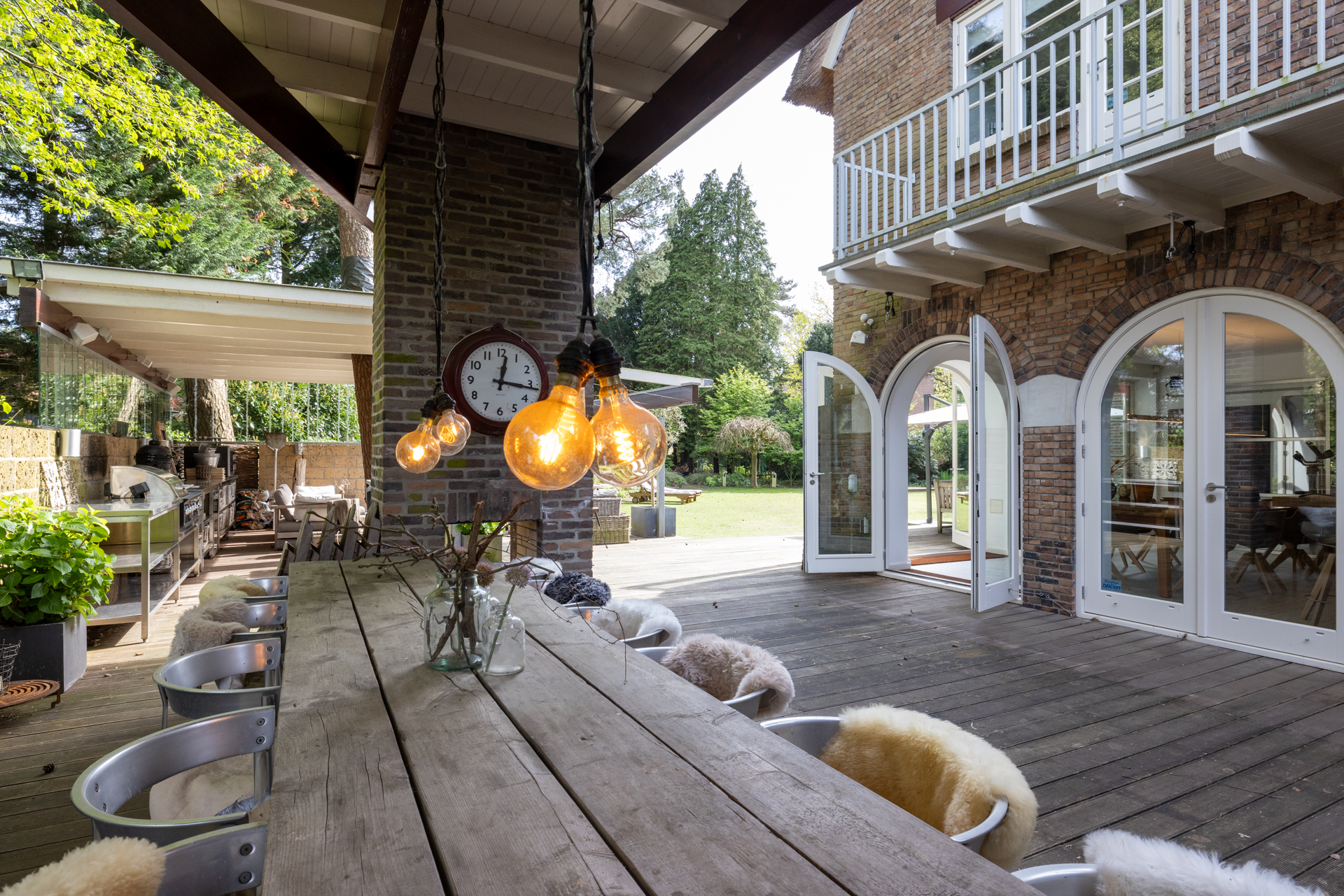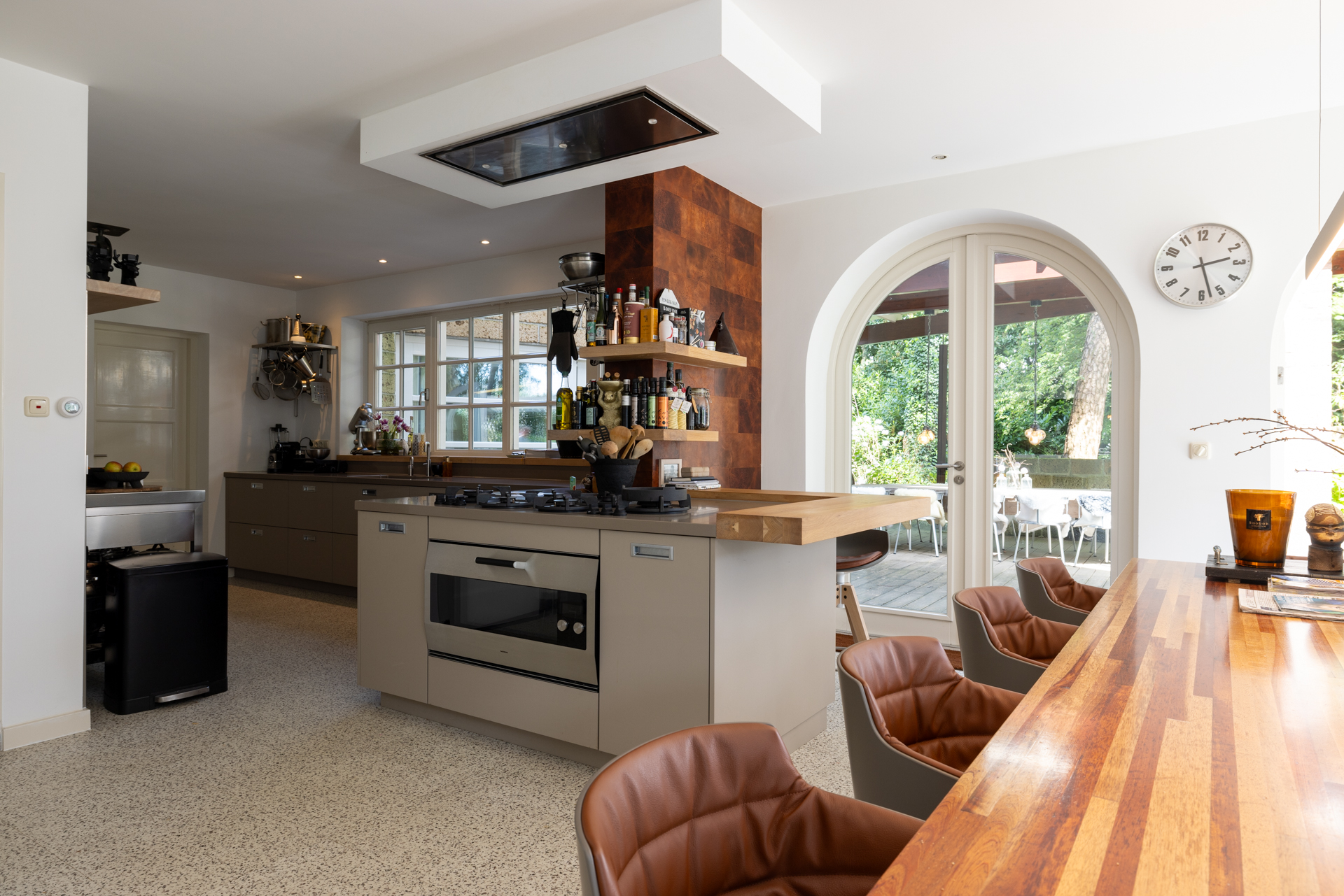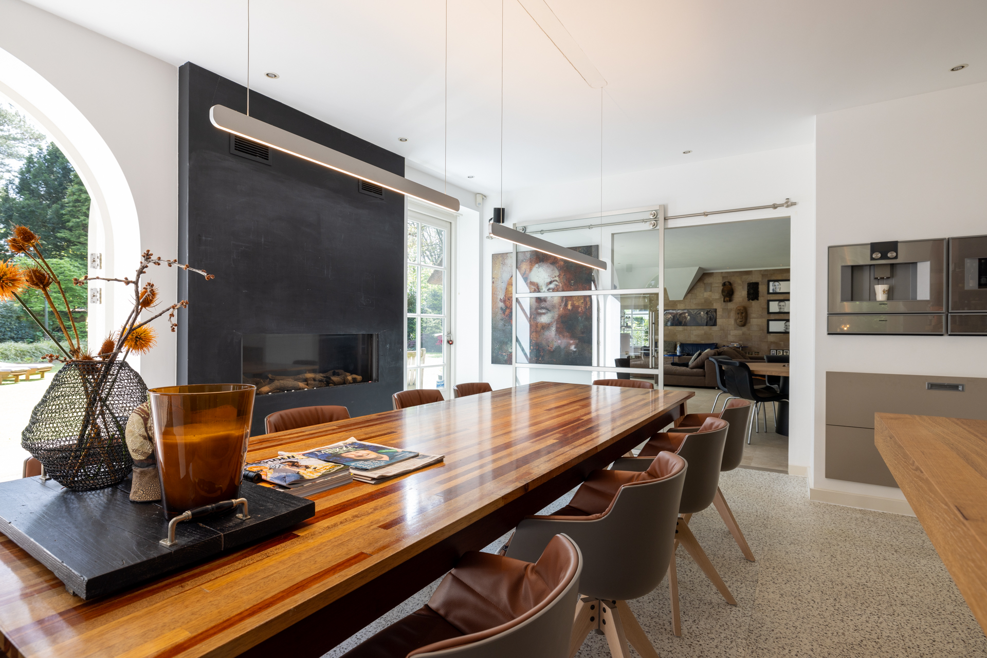 La planta principal está presidida por un generoso salón con ventanales orientados al jardín y una chimenea de gas, creando un ambiente relajado para la vida diaria. La cocina a medida diseñada por Antonissen Interior incorpora electrodomésticos Gaggenau de alta gama y conecta de manera intuitiva con una terraza cubierta que alberga una segunda cocina exterior, ideal para reuniones durante todo el año.