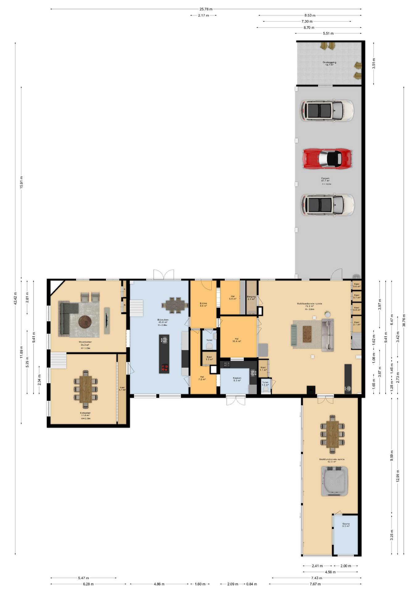Al atravesar un portón eléctrico, el jardín revela céspedes en terrazas, borduras de plantas maduras y una zona de estar hundida, enmarcando vistas sobre los campos adyacentes de Midden-Delfland. La residencia principal ofrece amplios espacios, incluida una cocina sofisticada con isla de mármol y entresuelo, una serie de salones conectados con vigas auténticas y una sala de cine en la antigua quesería. La zona wellness invita al retiro con jacuzzi, saunas finlandesa e infrarroja, todo ello en una luminosa ampliación.