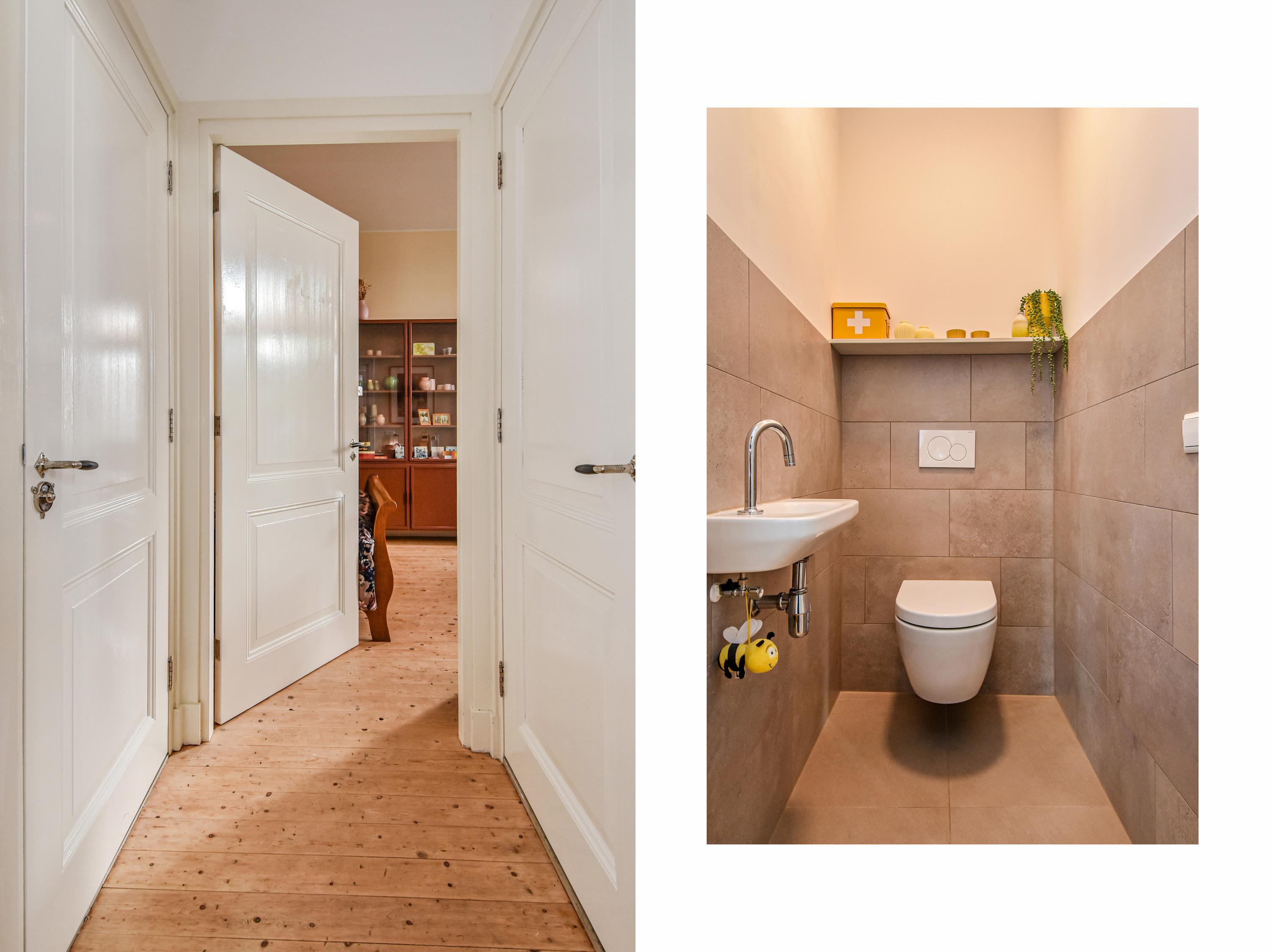 Al entrar, las fachadas de cristal altas y un techo que alcanza los 3,55 metros definen la cocina principal. Molduras de estuco y vidrieras preservadas celebran el linaje arquitectónico. La cocina, equipada con electrodomésticos de alta gama empotrados, se articula en torno a espacios para comer y socializar, flanqueados por dos amplias salas de estar. Un estudio integrado, con entrada independiente y baño con suelo radiante, puede adaptarse fácilmente como suite de invitados o zona de trabajo. En la planta baja hay amplios espacios de almacenamiento y acceso directo a Broerhuisstraat.