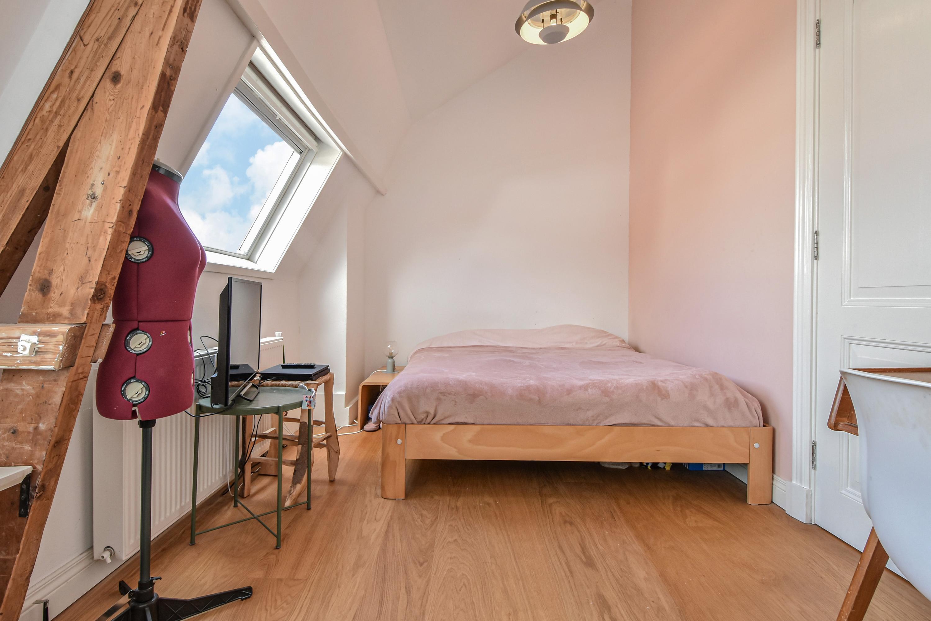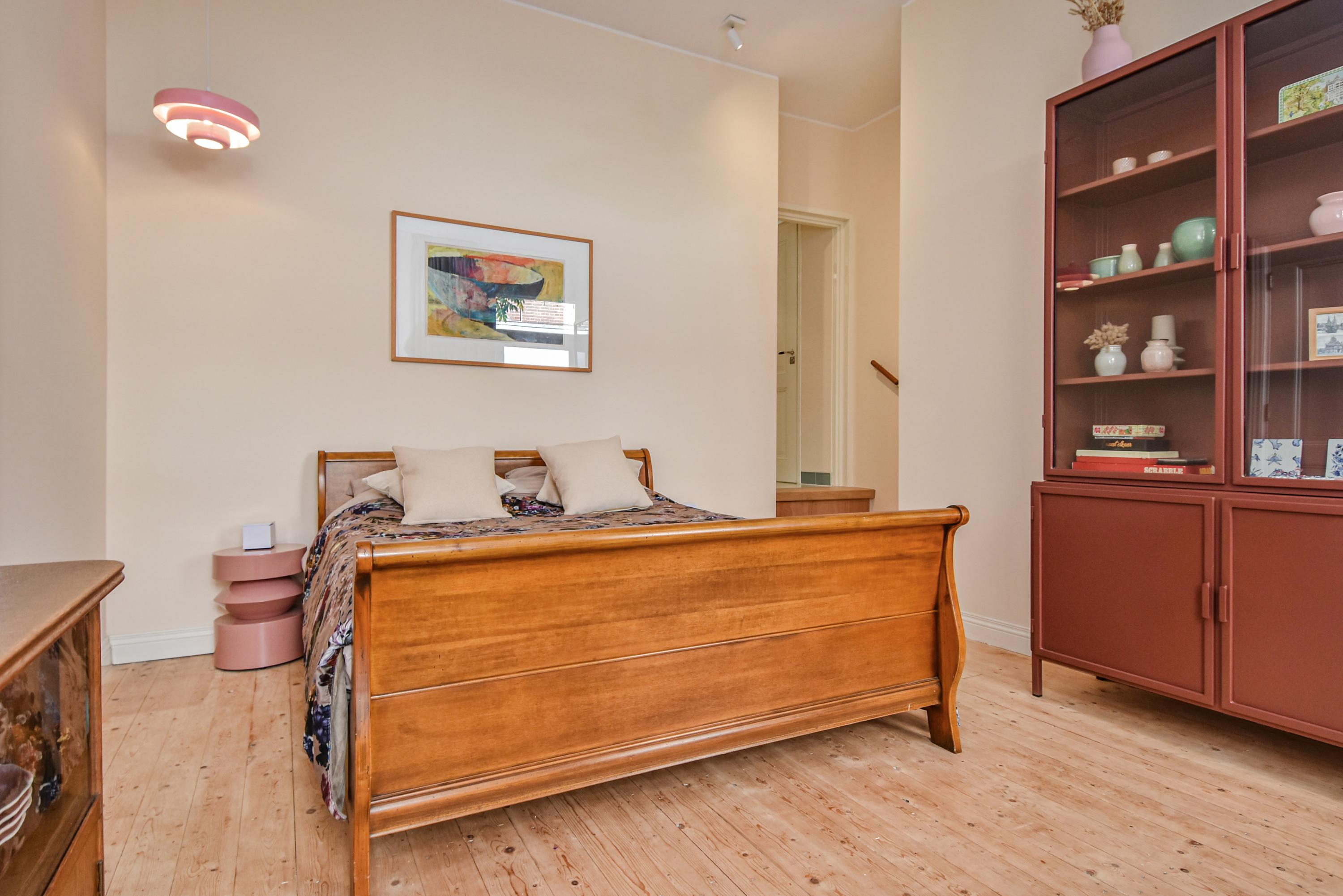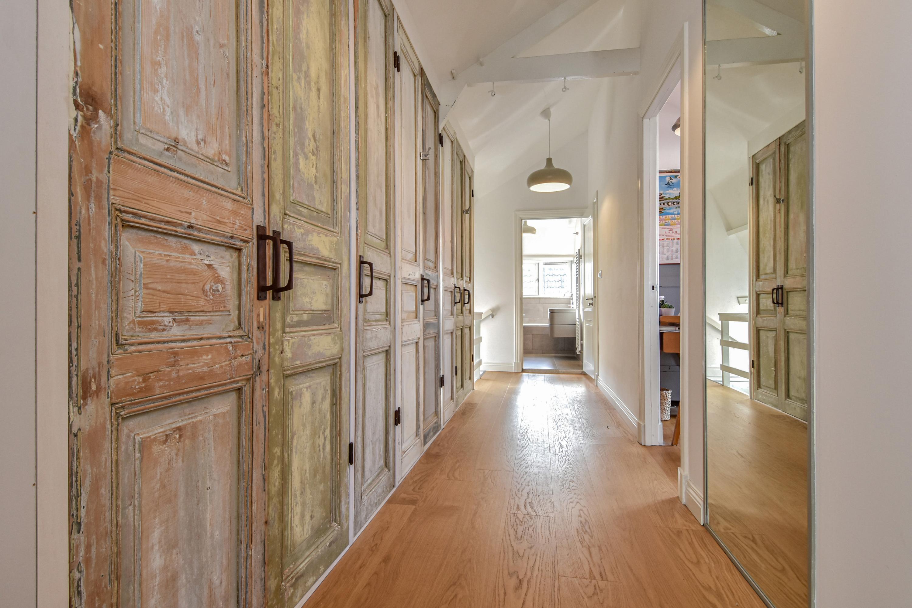 En la primera planta, tres grandes dormitorios evocan el carácter de época, incluyendo vistas al canal y vidrieras. Una lavandería conduce a un jardín privado en la azotea, un refugio verde poco común para disfrutar de sol y privacidad. La segunda planta ofrece tres dormitorios adicionales—uno con vigas vistas—y un baño lujoso con bañera, ducha a ras de suelo y detalles de diseño.