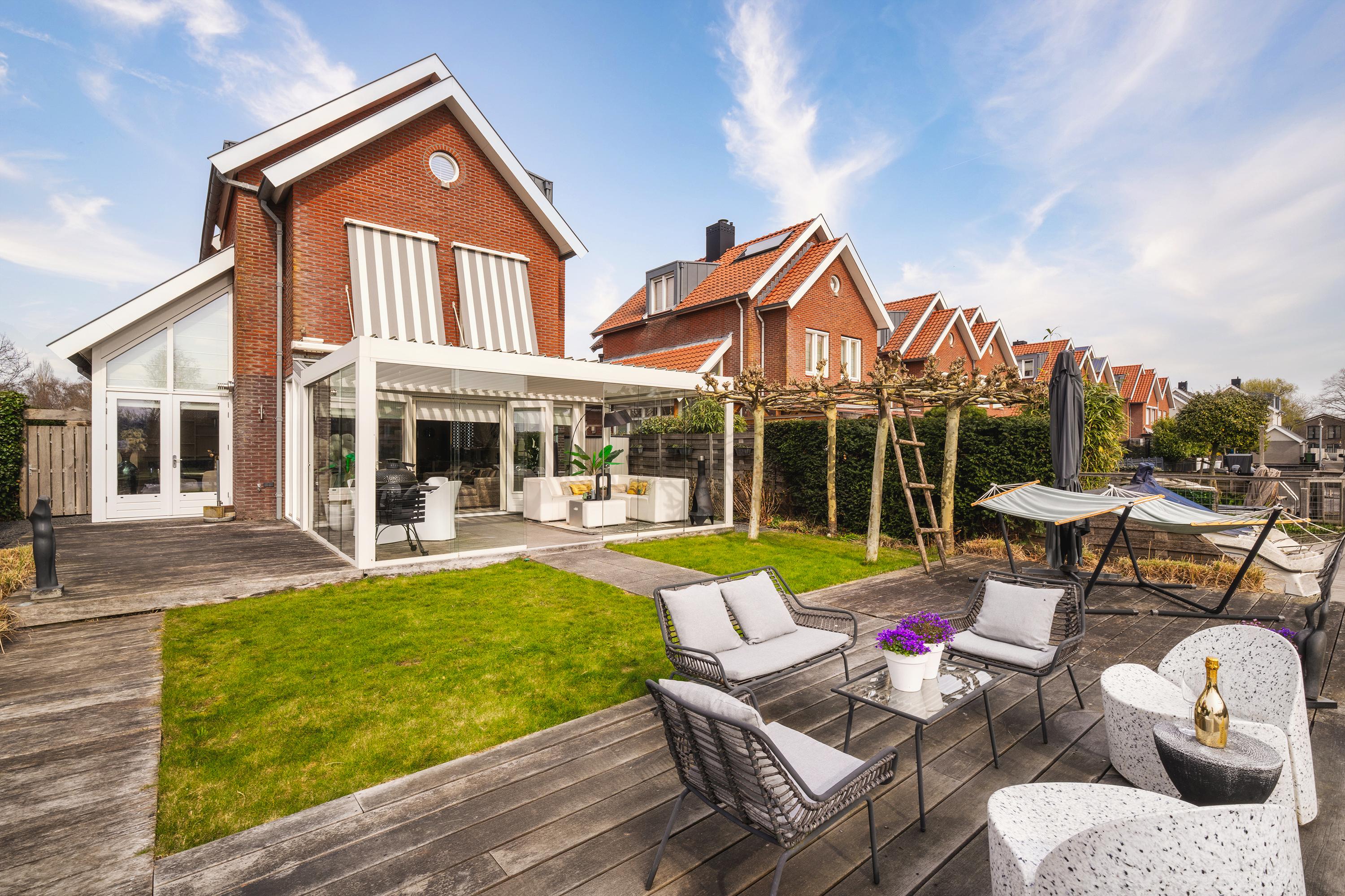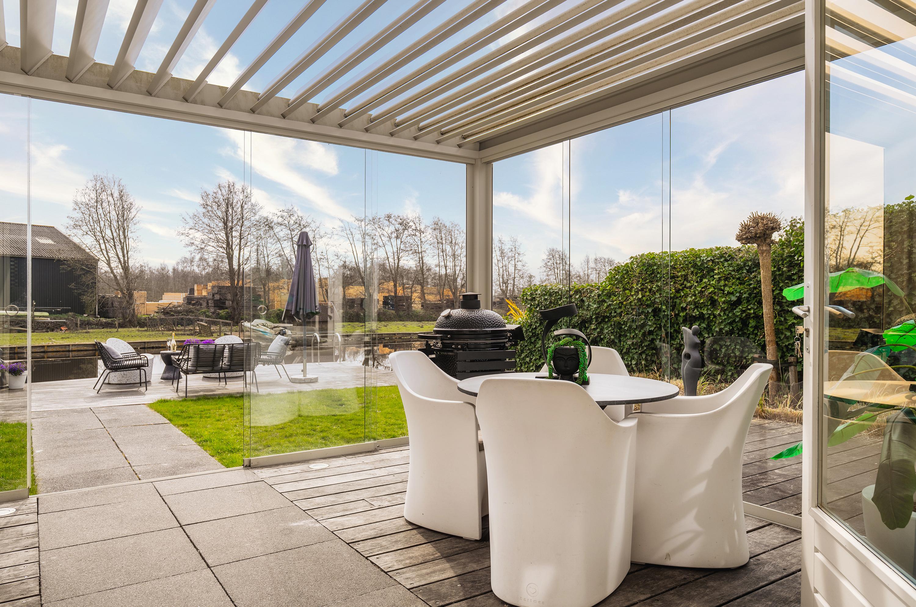 En el exterior, el jardín paisajístico, cuidadosamente diseñado y orientado al sur, dispone de iluminación ambiental e irrigación integrada. El amarre privado y la escalera de baño permiten disfrutar del agua directamente, mientras que la terraza cubierta con techo regulable invita al relax durante todo el año. Comodidades como calefacción parcial por suelo radiante, ventilación mecánica y sistema central de aspiración completan esa sensación de vida sin esfuerzo que define esta casa señorial independiente en Den Ilp.