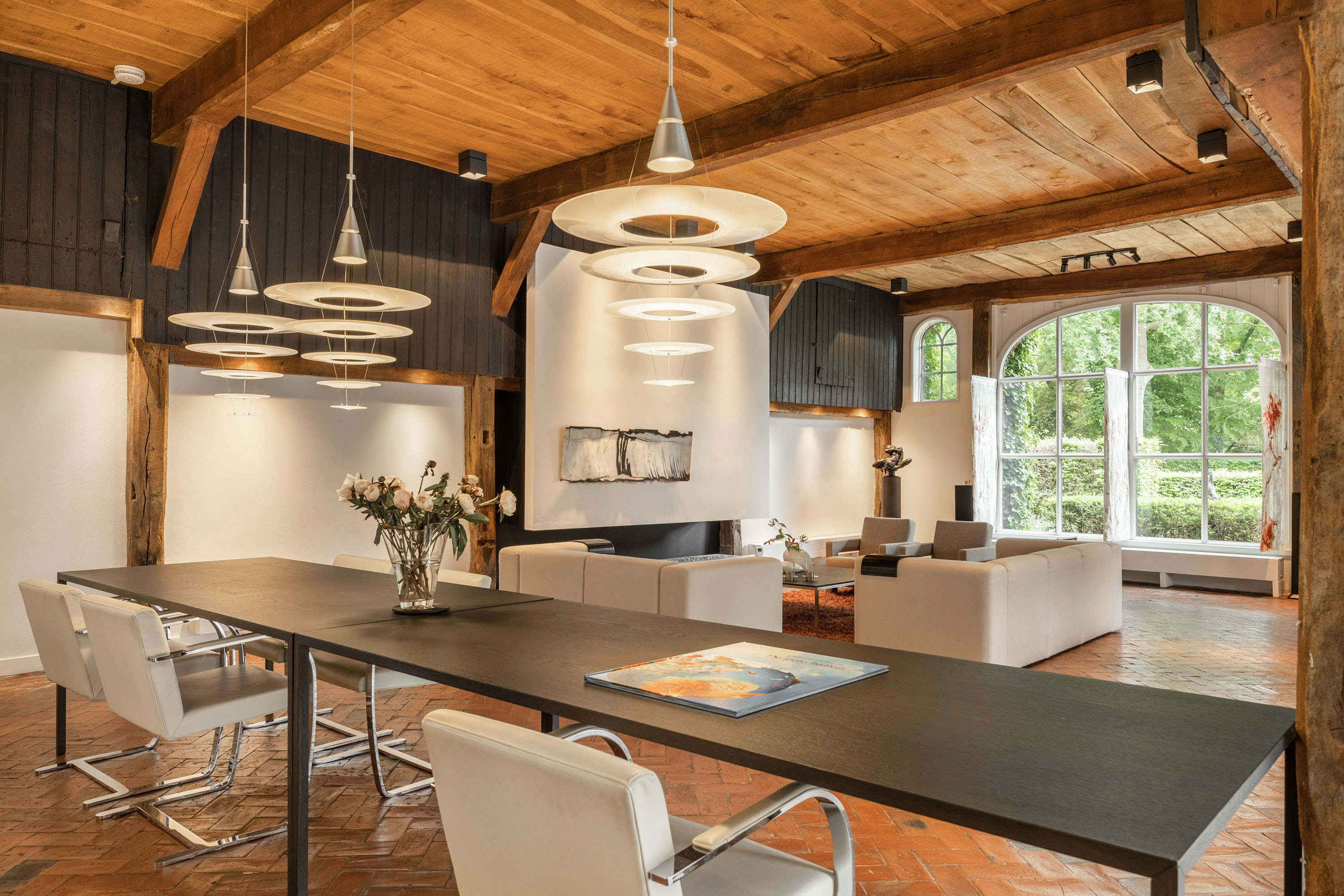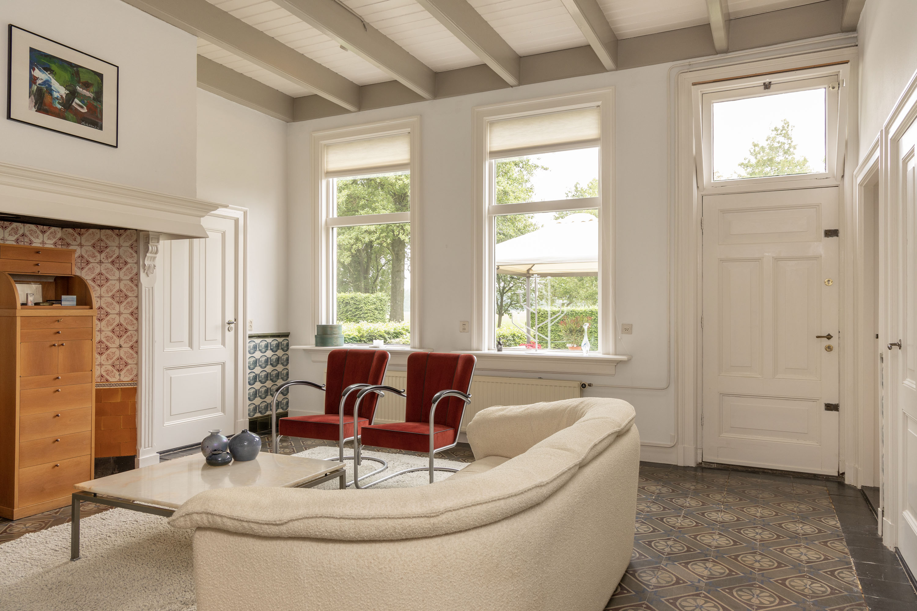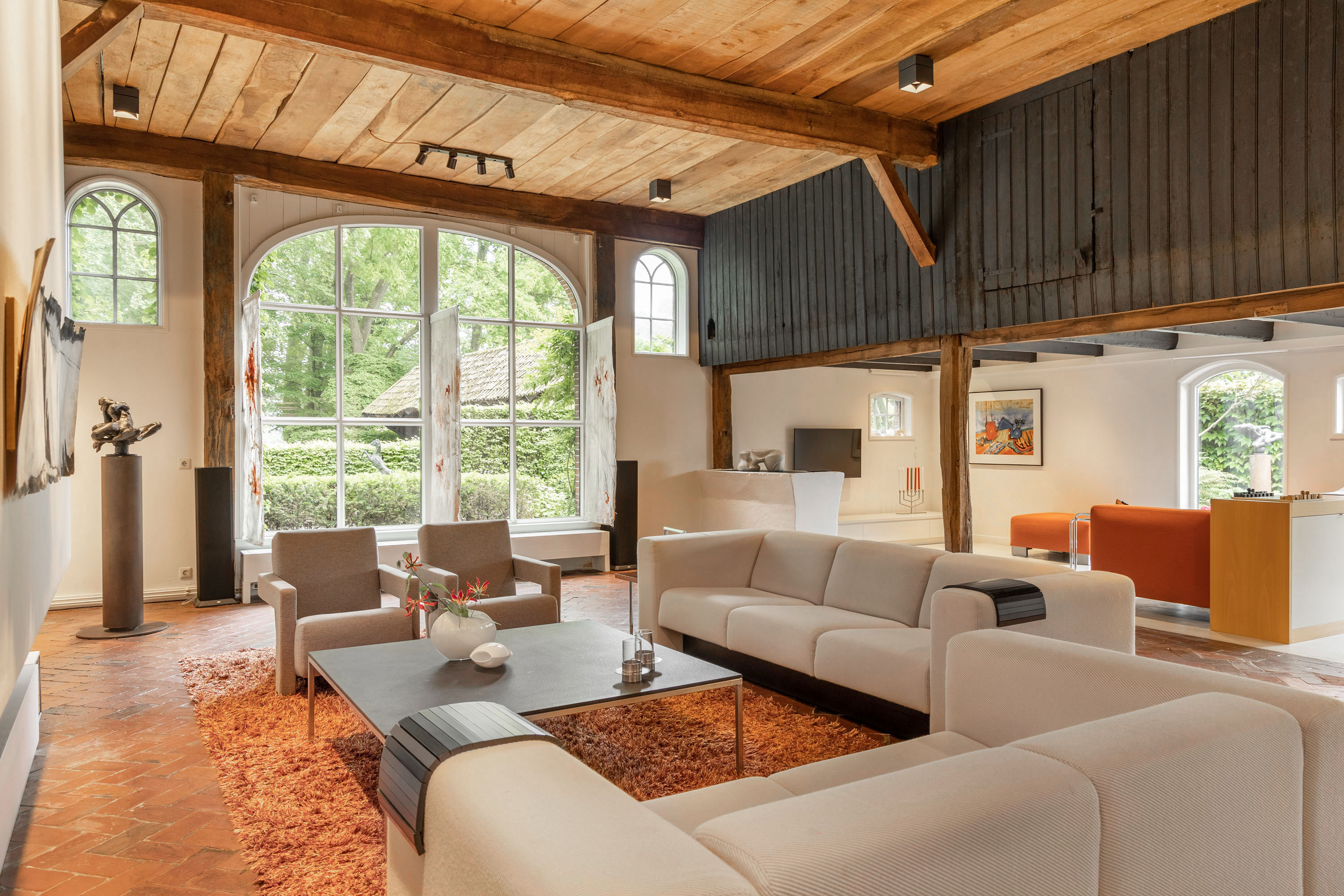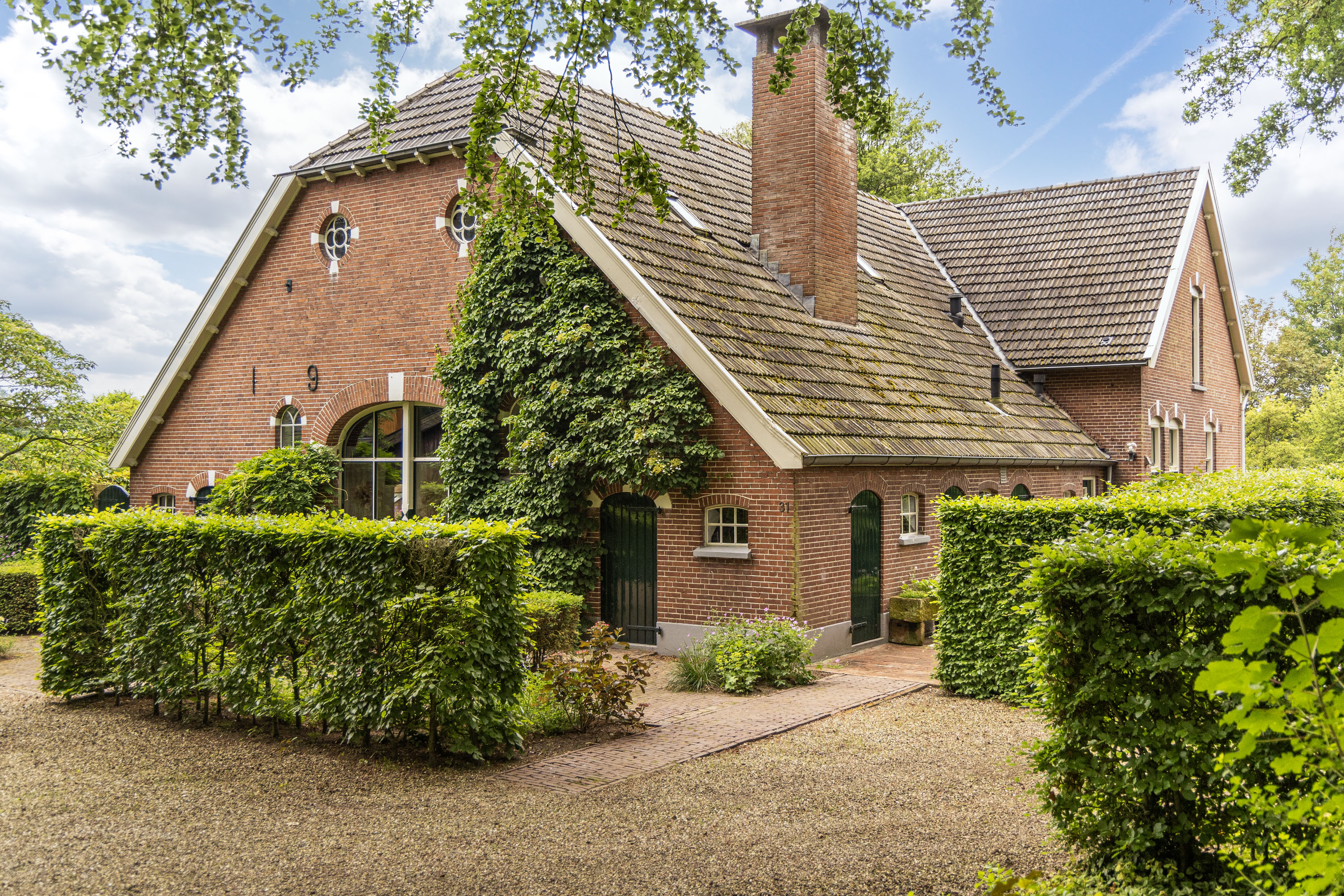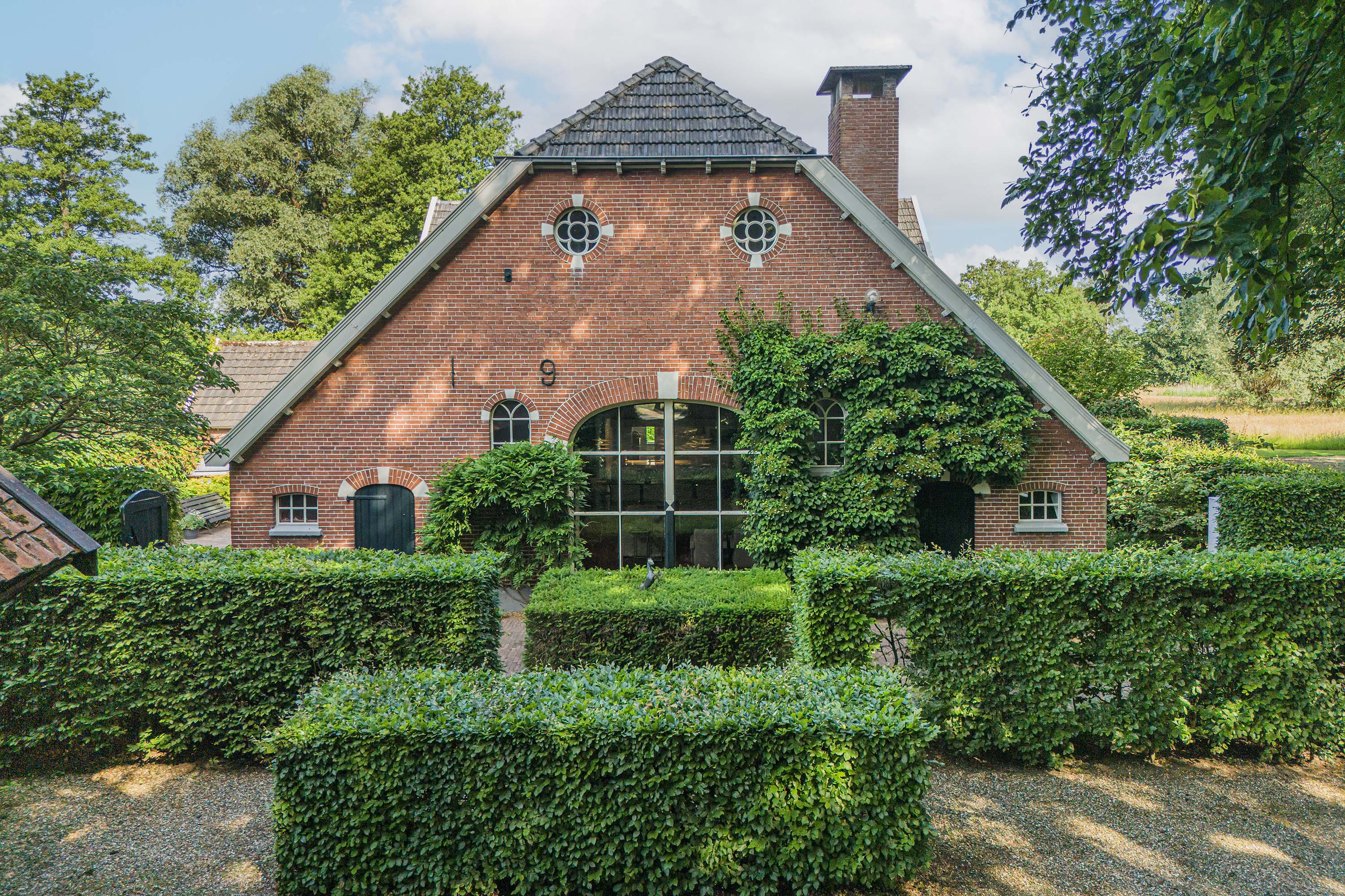 La casa de campo Woonboerderij Haaksbergen se sitúa en las afueras de la aldea de Honesch, con amplias vistas al campo y rodeada de vegetación madura. Esta granja, completamente renovada, ofrece una superficie habitable de 428 m² en una parcela de 10.000 m², integrando detalles auténticos de 1915 con modernas intervenciones cuidadosamente seleccionadas. La luminosa sala de estar, que originalmente fue un granero, presenta vigas restauradas y techos altos, acompañados por una cocina contemporánea en blanco brillante. El equilibrio entre piedra, cristal y madera conservada crea espacios que fusionan confort y carácter, idóneos tanto para el retiro tranquilo como para la convivencia.