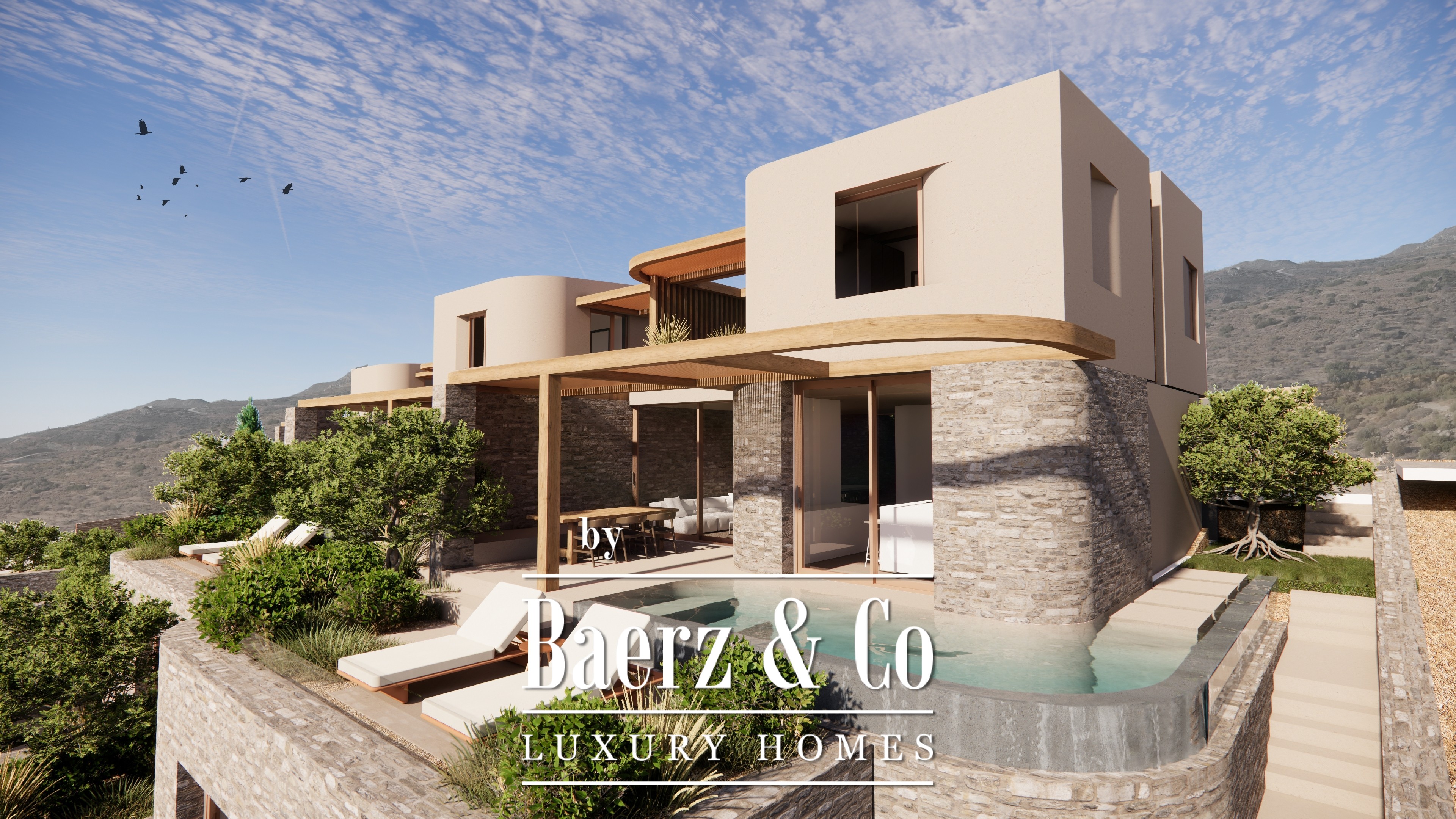 Cada vivienda disfruta de inmejorables vistas panorámicas y cuenta con espacios exteriores sombreados, terrazas ajardinadas en la azotea, piscina y acceso directo a zonas privadas y comunes. Los muros de piedra, pérgolas y elementos acuáticos conforman un entorno residencial armónico, basado en una integración entre forma y función. La infraestructura completa, que incluye pozo privado y redes de suministros integrales, garantiza una vida moderna y sin complicaciones.