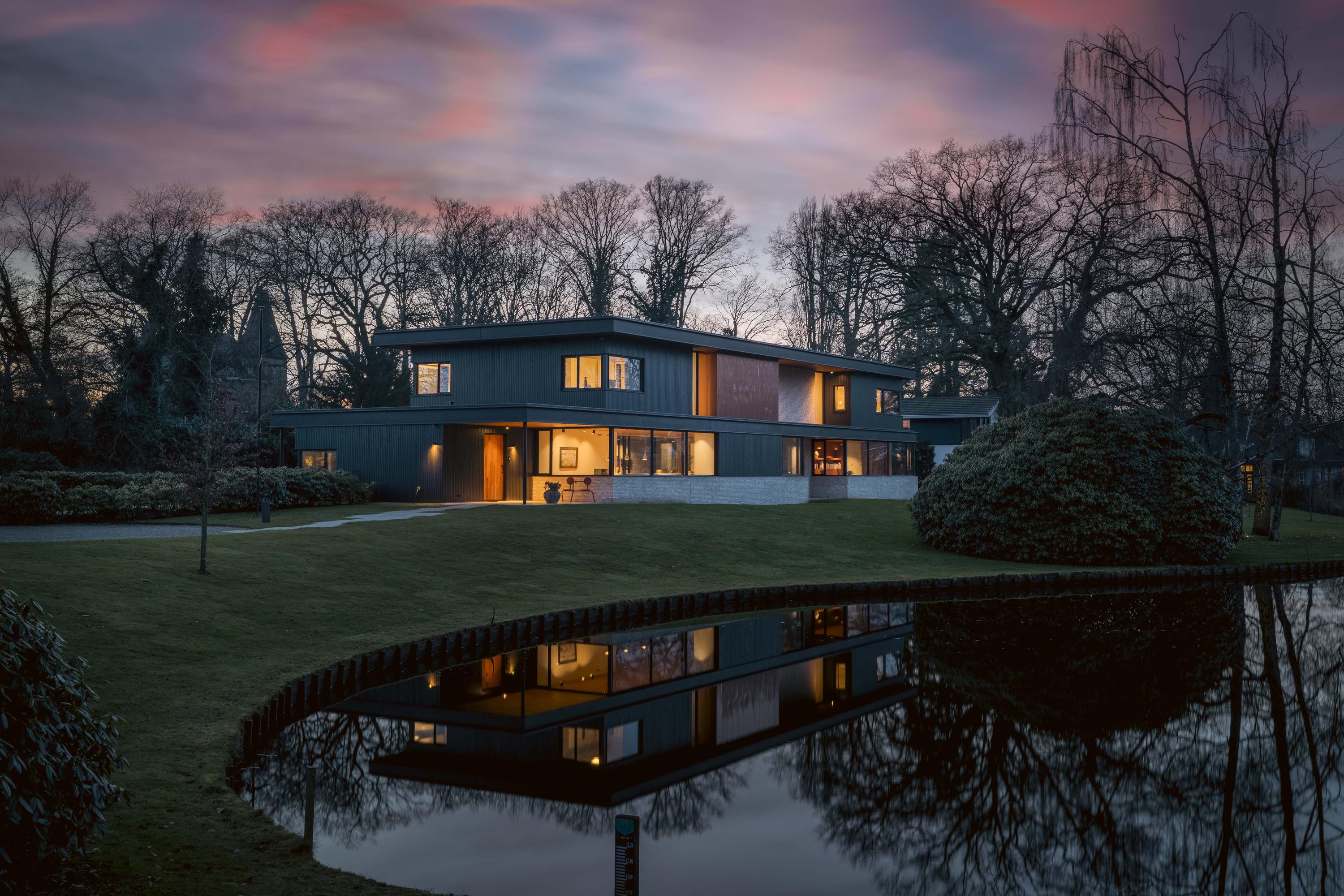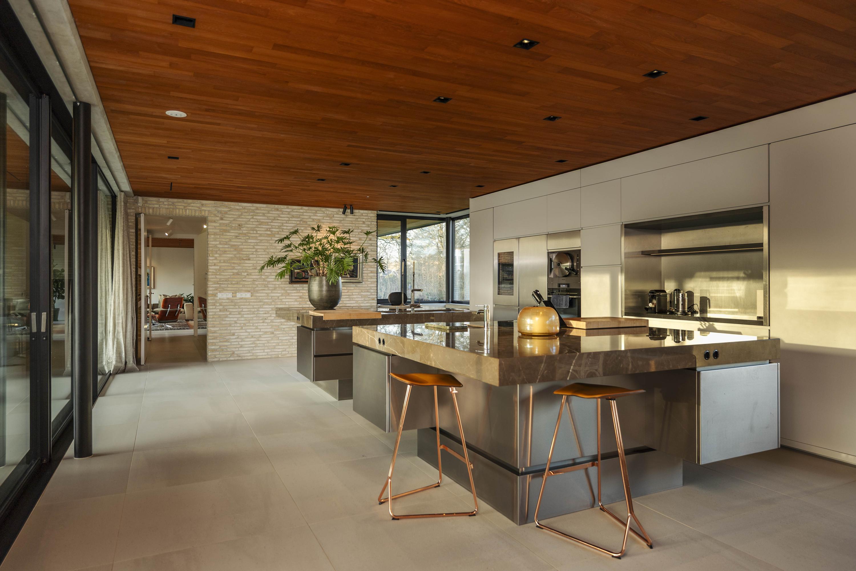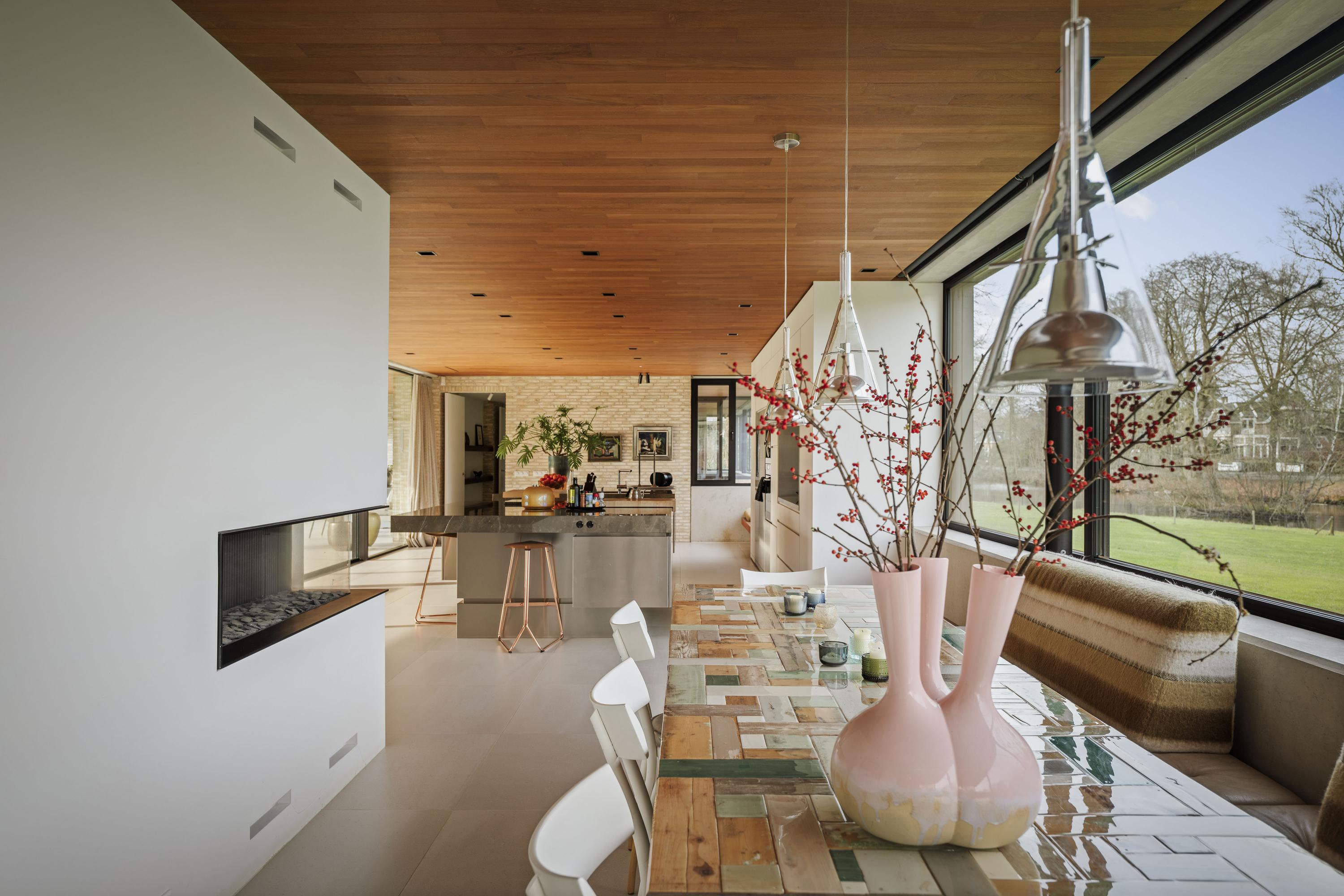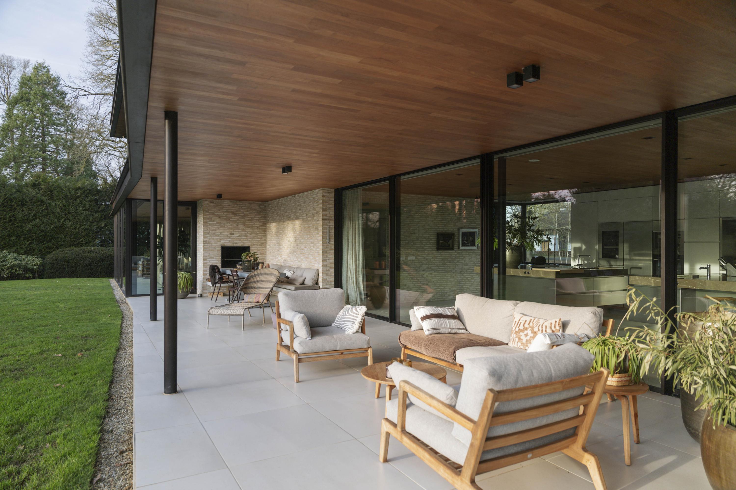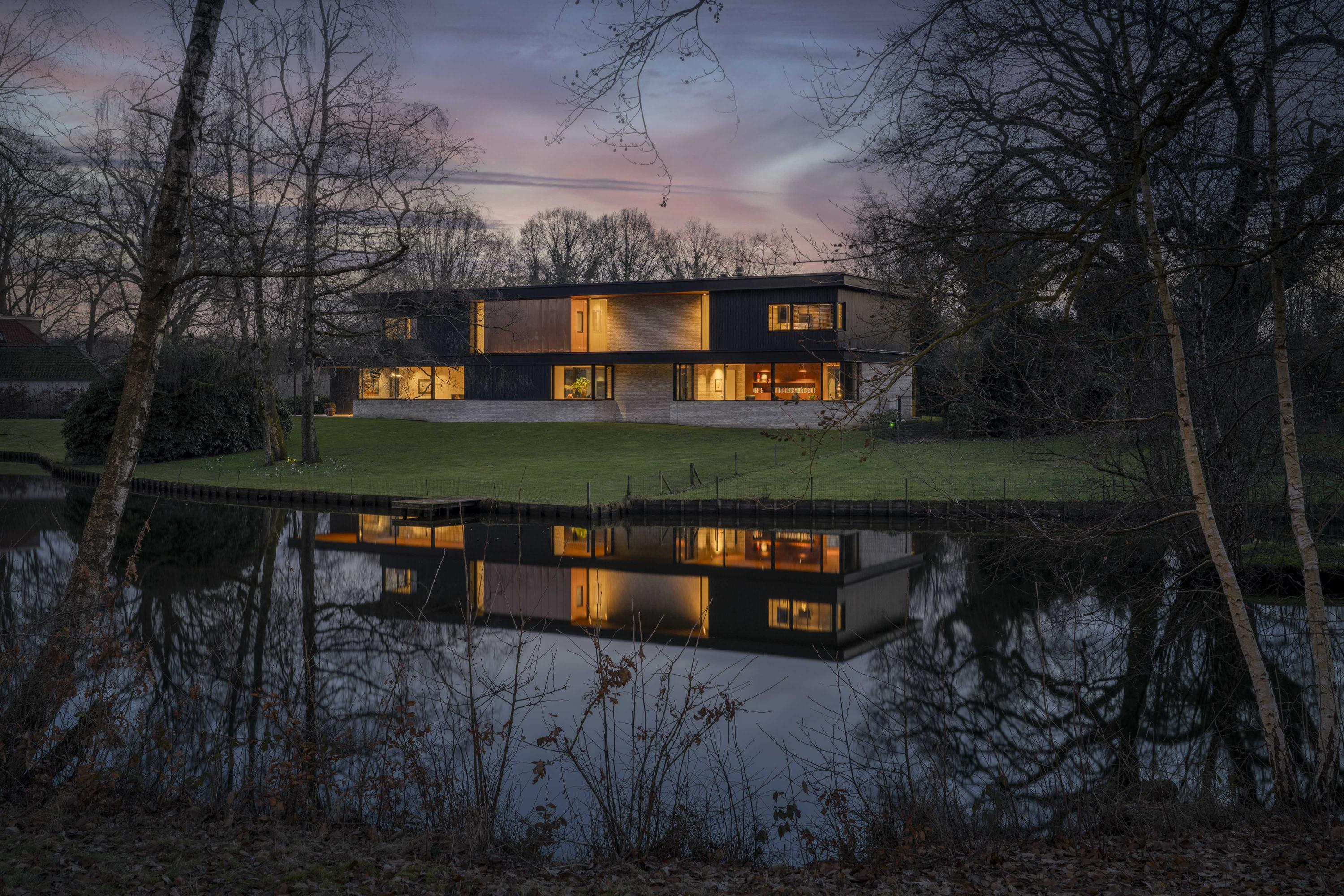 Villa en venta en Lochem Berkeloord, situada en una parcela ajardinada de 6.635 m², que ofrece un equilibrio poco frecuente entre diseño contemporáneo y la serenidad de un parque. Construida en 2019 según la visión del arquitecto Bart Vos, esta residencia familiar combina transparencia y seguridad, con vistas a los estanques de Berkeloord en la parte delantera y al parque de ciervos de Lochem en la trasera. Con una superficie de 500 m² distribuidos en tres plantas, la vivienda se articula en torno a una cocina luminosa de 88 m², conectada de forma fluida con una terraza cubierta equipada con chimenea exterior Metalfire. Suelos de Mosa en tono travertino y techos de teca aceitada aportan una calidez sutil y tangible, mientras los ventanales de suelo a techo mantienen un diálogo permanente con los jardines y la luz natural.
