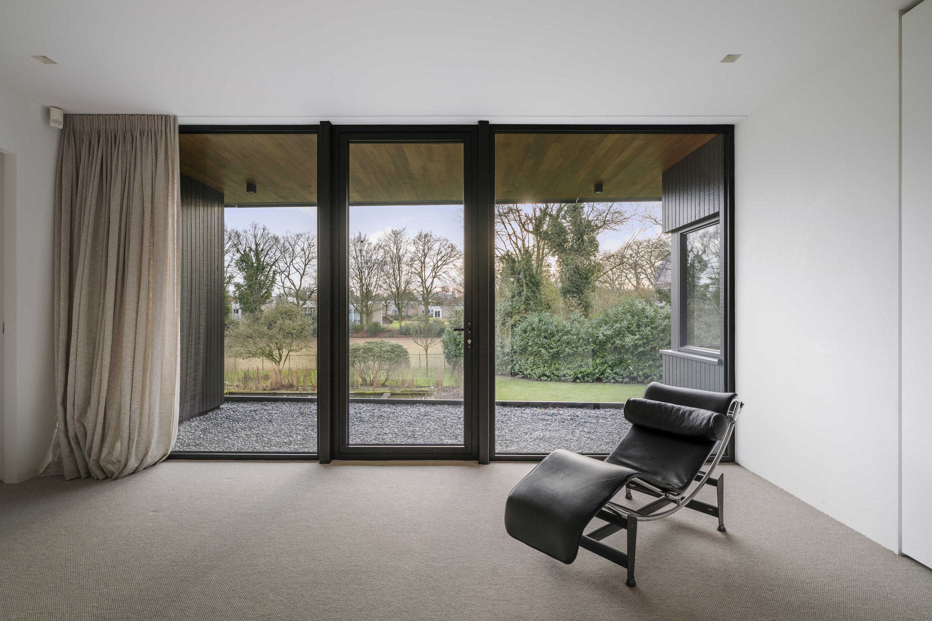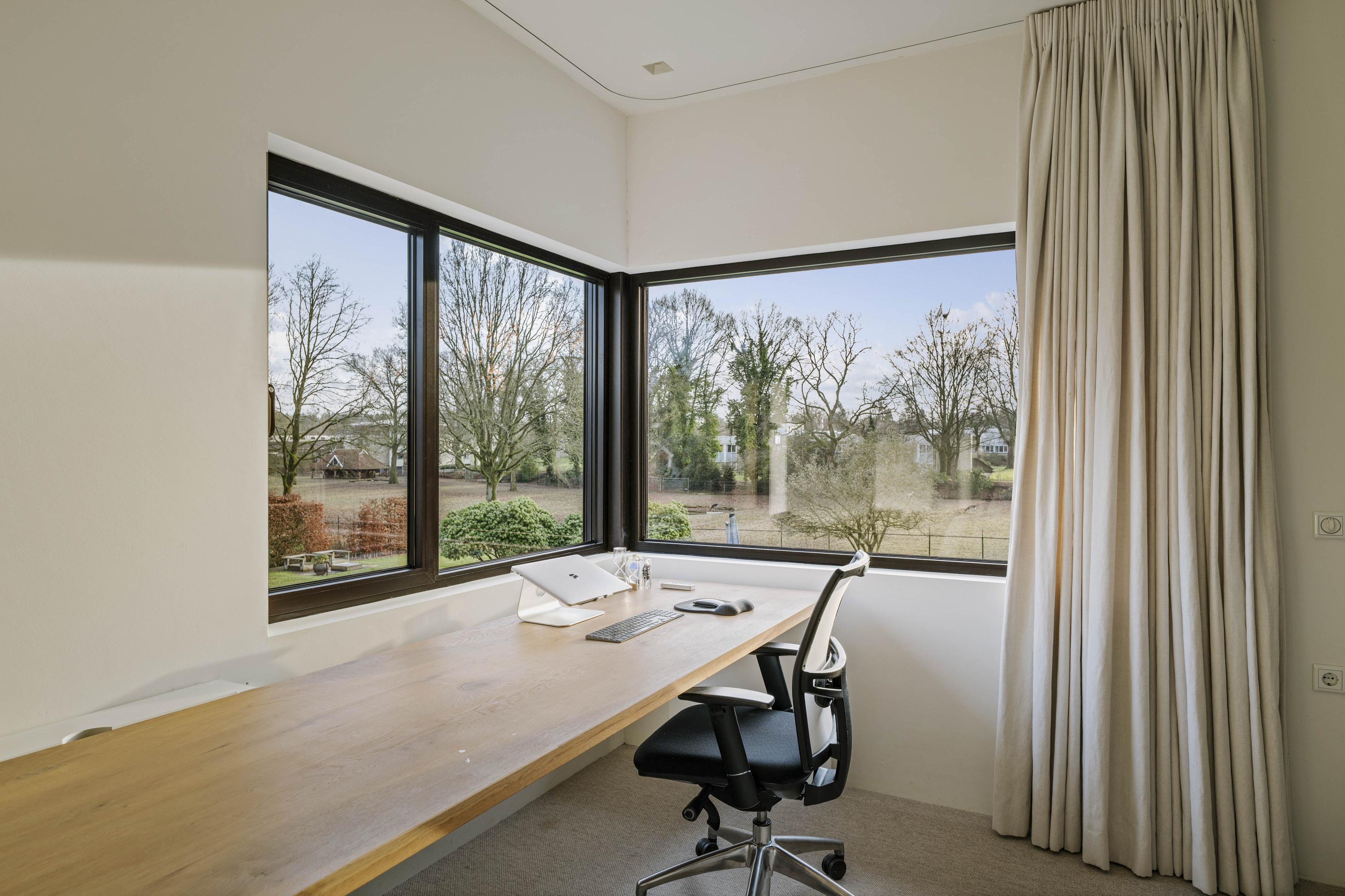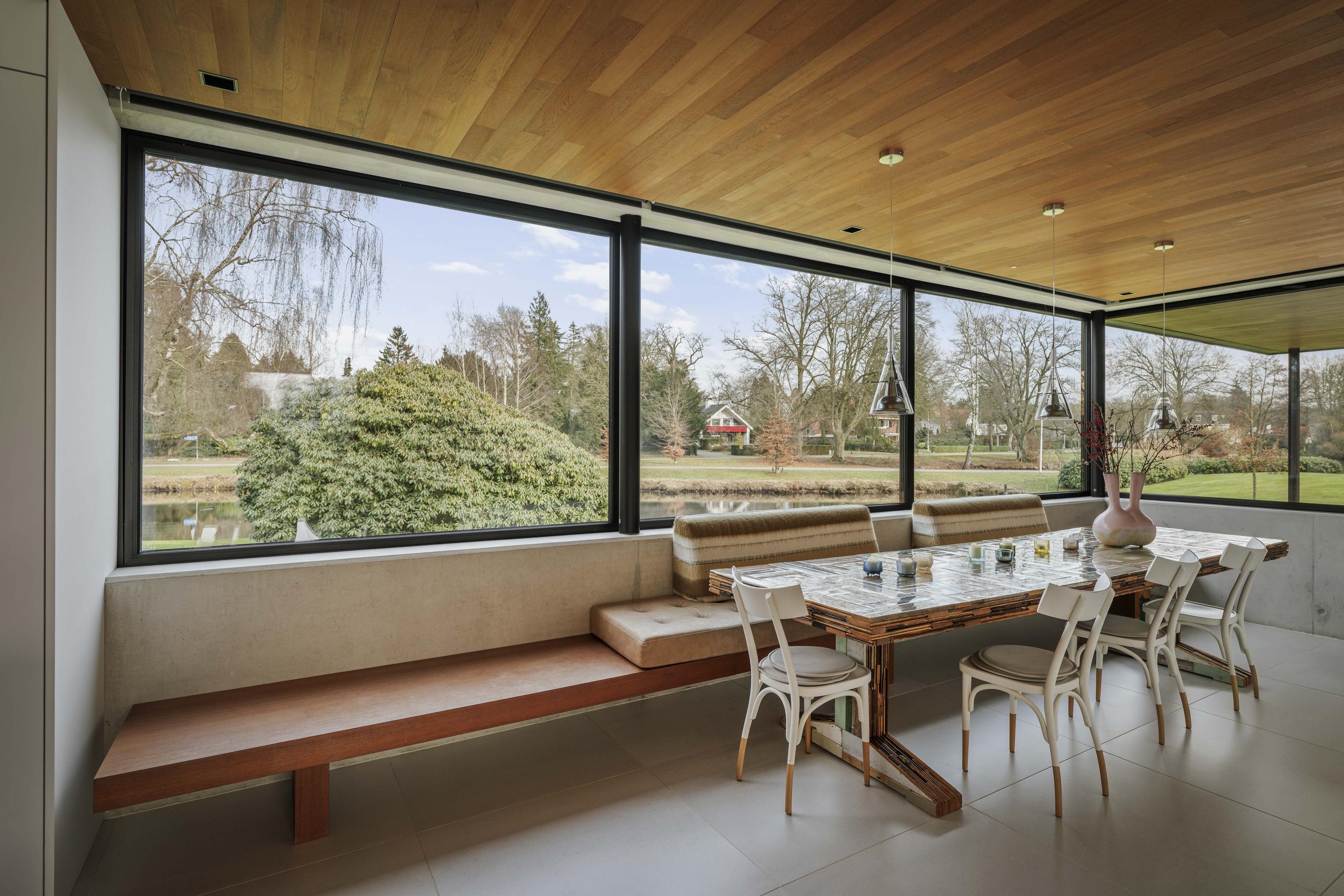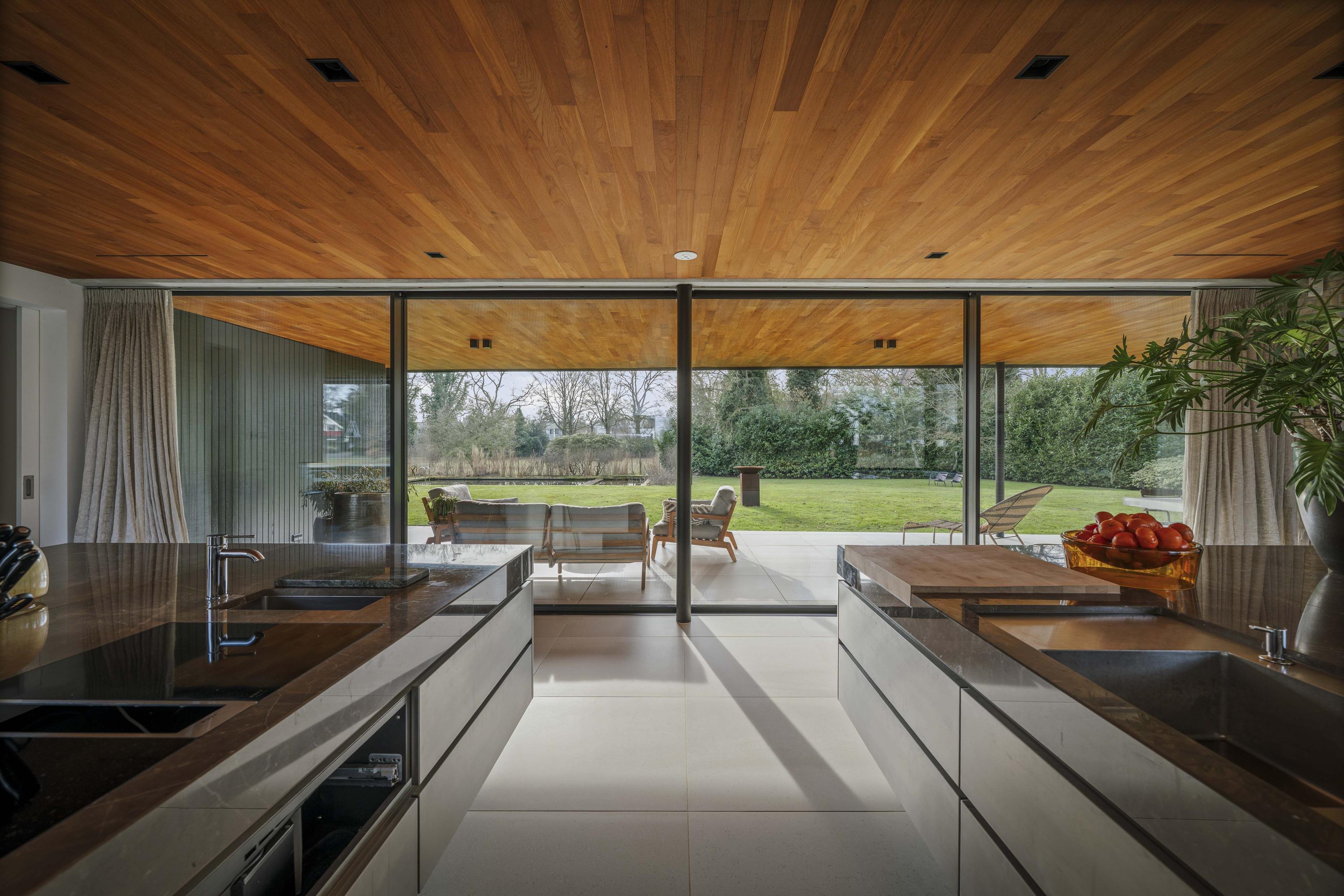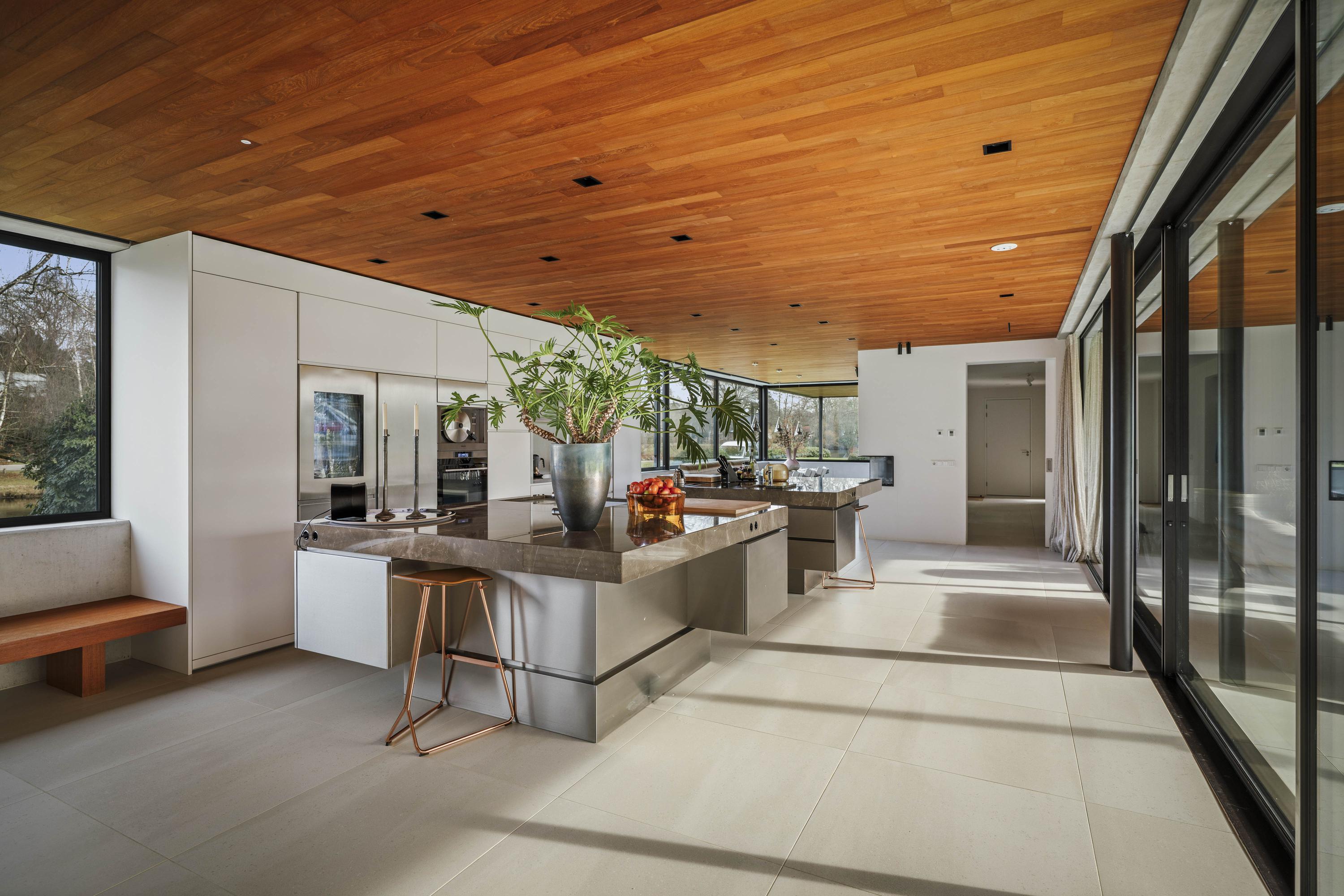 Villa en venta en Lochem Berkeloord, situada en una parcela ajardinada de 6.635 m², que ofrece un equilibrio poco frecuente entre diseño contemporáneo y la serenidad de un parque. Construida en 2019 según la visión del arquitecto Bart Vos, esta residencia familiar combina transparencia y seguridad, con vistas a los estanques de Berkeloord en la parte delantera y al parque de ciervos de Lochem en la trasera. Con una superficie de 500 m² distribuidos en tres plantas, la vivienda se articula en torno a una cocina luminosa de 88 m², conectada de forma fluida con una terraza cubierta equipada con chimenea exterior Metalfire. Suelos de Mosa en tono travertino y techos de teca aceitada aportan una calidez sutil y tangible, mientras los ventanales de suelo a techo mantienen un diálogo permanente con los jardines y la luz natural.