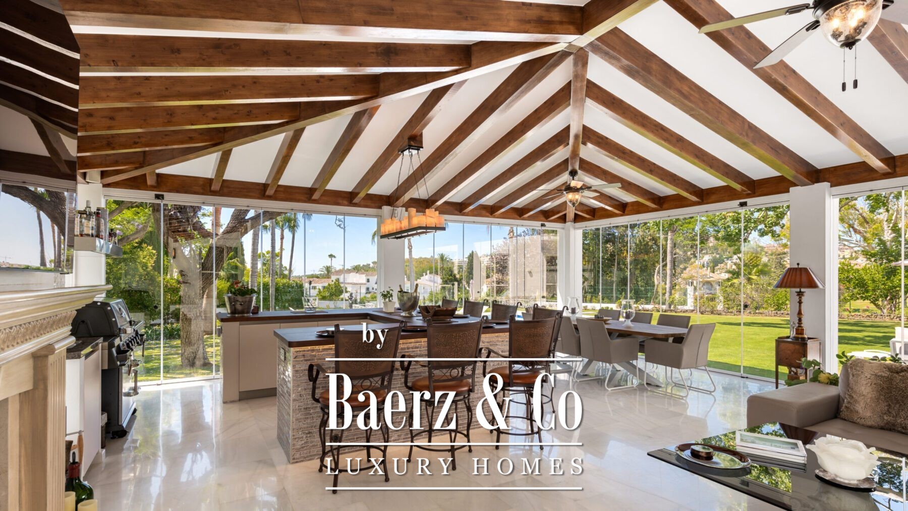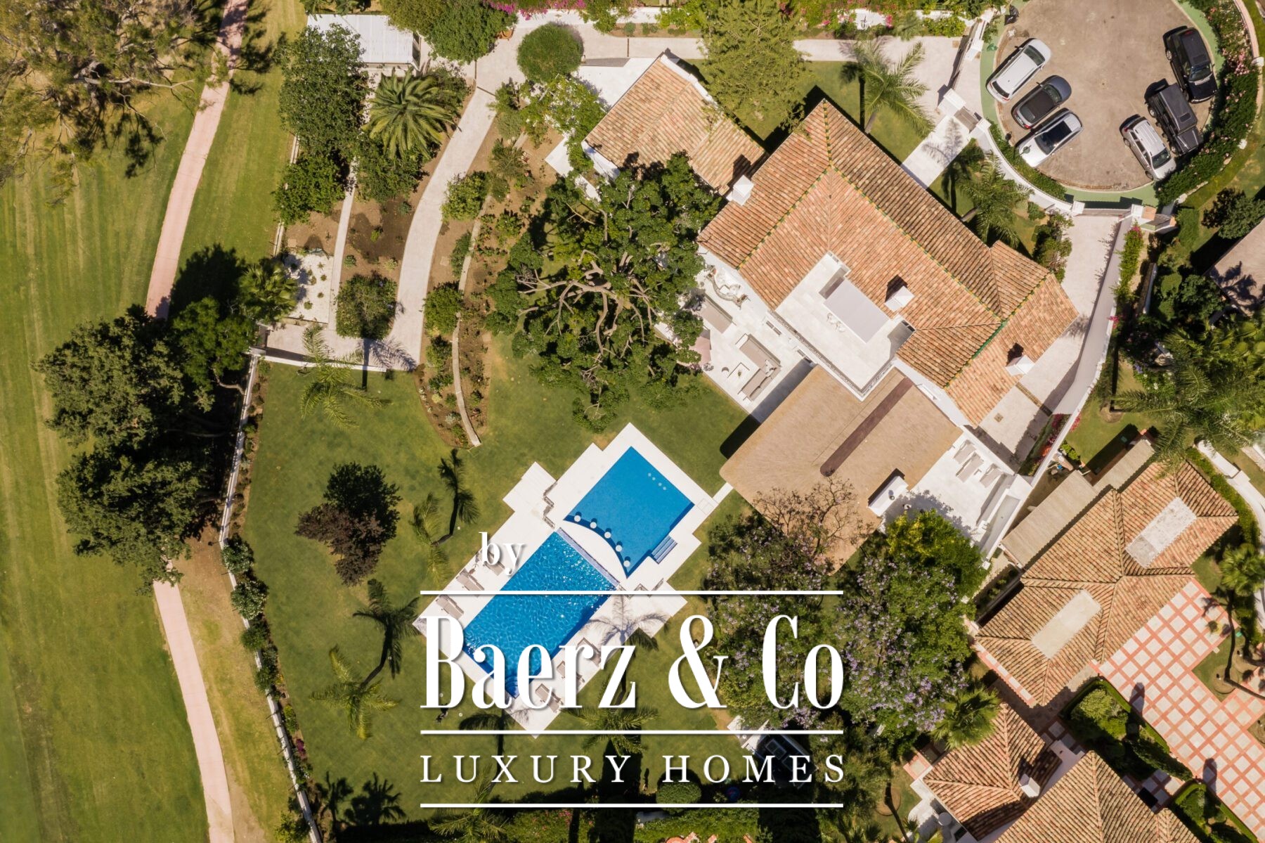 En el exterior, una gran piscina con cascada está rodeada de céspedes cuidados, árboles maduros y múltiples espacios para comer y relajarse, incluyendo un patio embaldosado con fuente decorativa. Amplias paredes de cristal y terrazas permiten una integración perfecta con el clima de Marbella. La propiedad es una de las pocas que disponen de acceso directo a Los Naranjos Golf, con senderos diseñados para carritos de golf.
