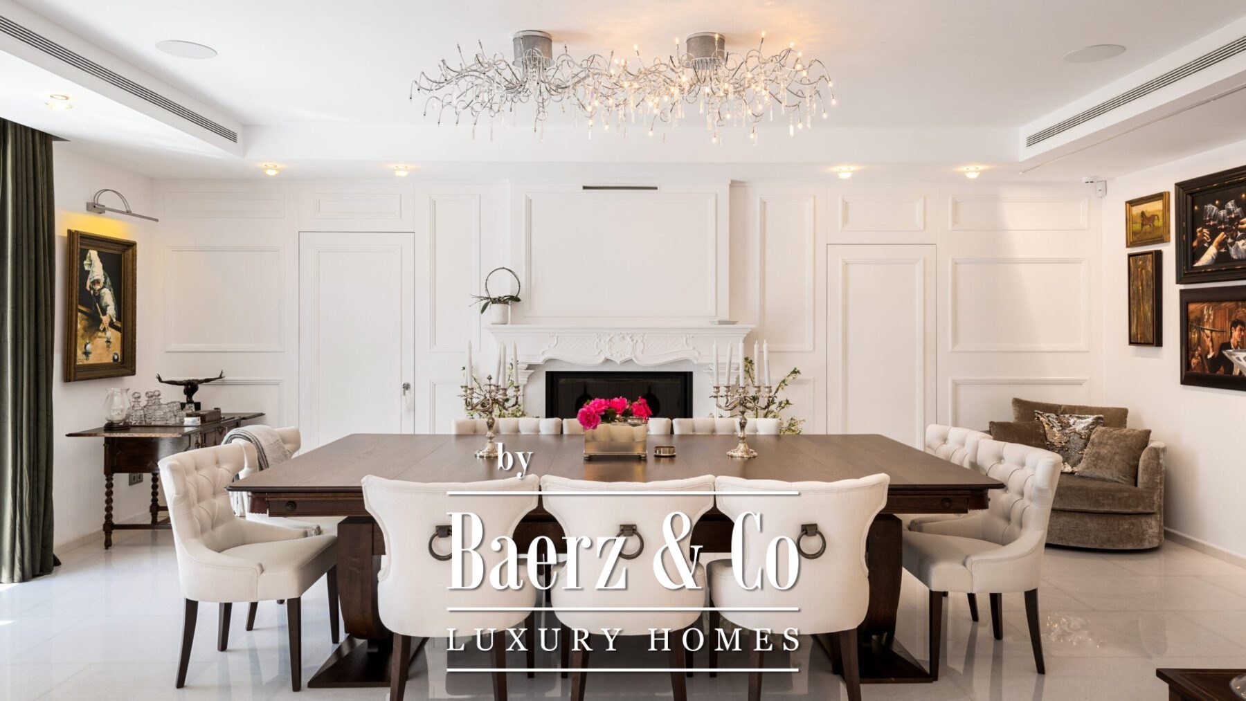 El área principal de estar establece una atmósfera acogedora, caracterizada por un elegante sofá curvo, una chimenea moderna y obras de arte seleccionadas. El comedor formal, con una larga mesa de madera, lámparas de araña dobles y otra chimenea, crea un ambiente sofisticado ideal para el entretenimiento. La cocina está equipada con muebles en tono topo, encimeras de piedra oscura y una isla con placa de cocción. Las zonas contiguas de comedor y salón cuentan con vigas de madera a la vista, una barra y acceso directo a los jardines, terrazas y la piscina.