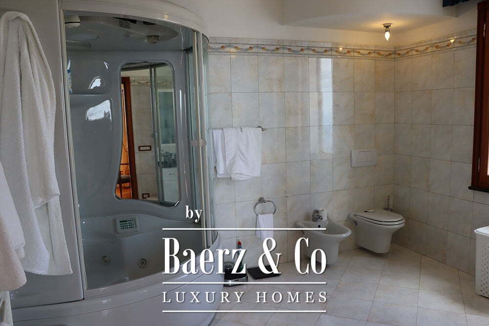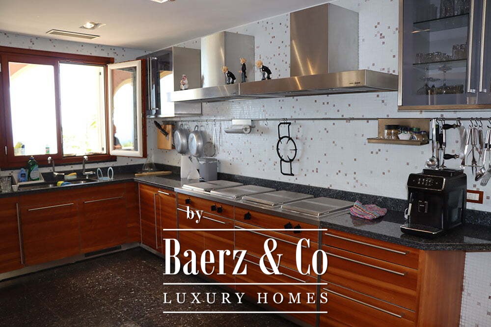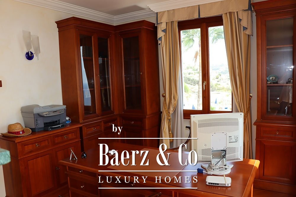 En la planta superior se encuentran ocho dormitorios y seis baños. La suite principal incluye despacho, vestidor, baño privado con jacuzzi y acceso exclusivo a la terraza. La villa está rodeada por un terreno de 2.000 m² que equilibra privacidad y posibilidades para el entretenimiento. Esta propiedad ofrece una perspectiva privilegiada para quienes valoran la luz mediterránea y la serenidad costera.