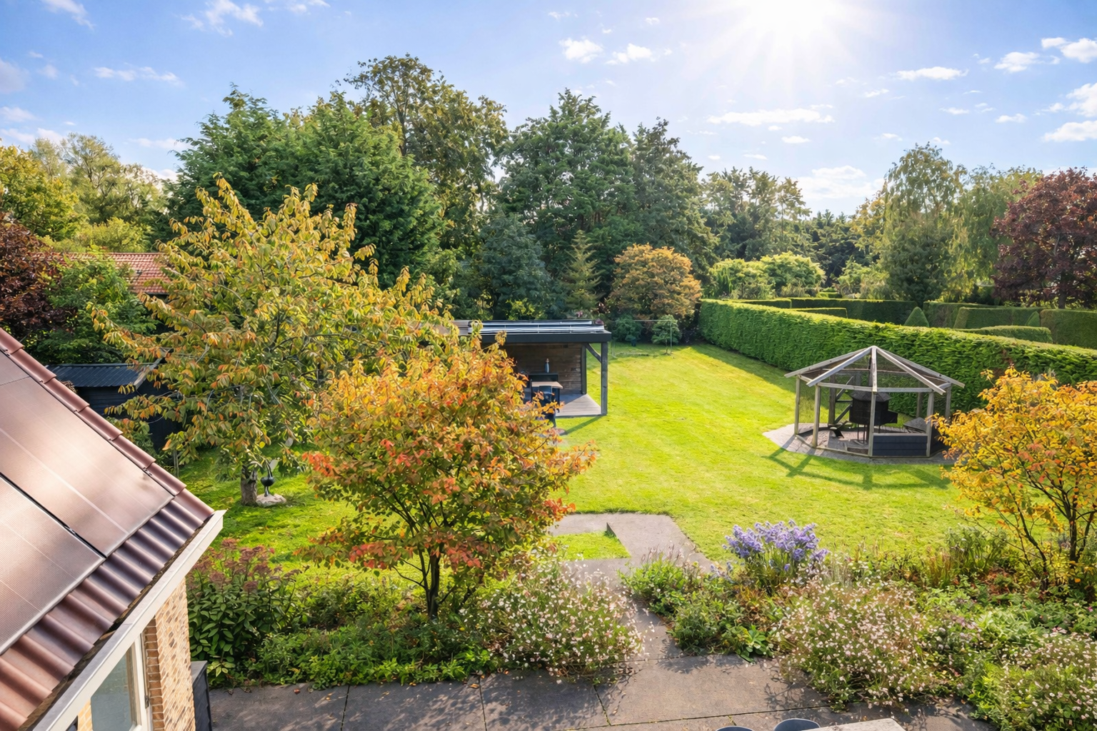 Al llegar, el amplio vestíbulo introduce una distribución clara que se conecta sin esfuerzo con una amplia sala de estar en forma de L, bañado de luz natural. Grandes ventanales enmarcan el jardín privado, mientras el suelo laminado de roble con calefacción por suelo radiante proporciona calidez constante. Una chimenea de gas aporta un toque cálido al área de estar, y la cocina de concepto abierto, con barra, une claridad visual y convivialidad. El ritmo funcional de la casa continúa con un generoso lavadero, que incluye armarios empotrados, área de lavandería y acceso directo a la terraza del jardín, así como un segundo aseo. A su lado, una suite flexible, actualmente utilizada como oficina, con aire acondicionado, armarios empotrados y altillo para almacenamiento adicional.